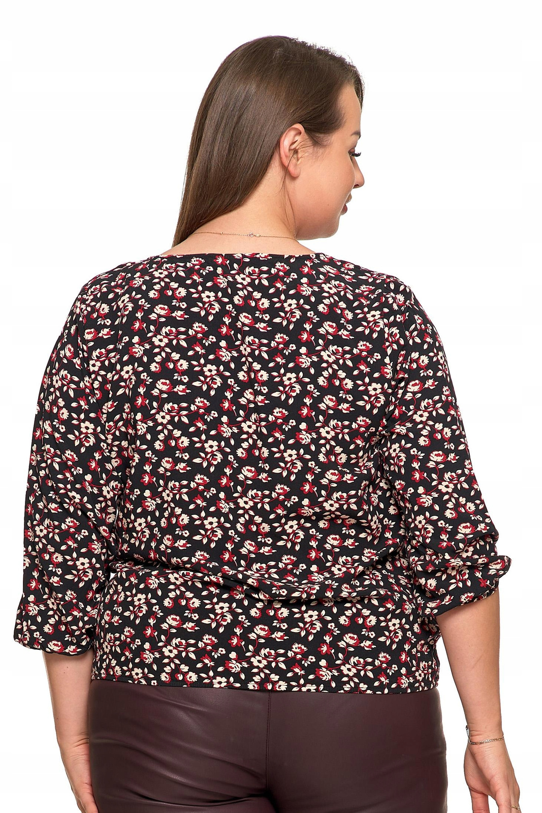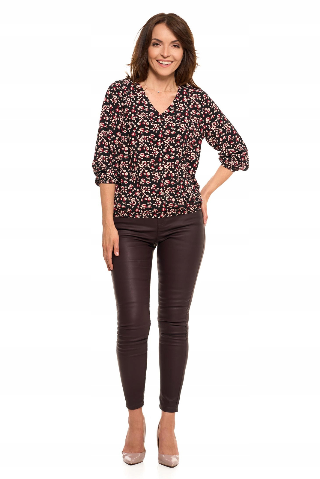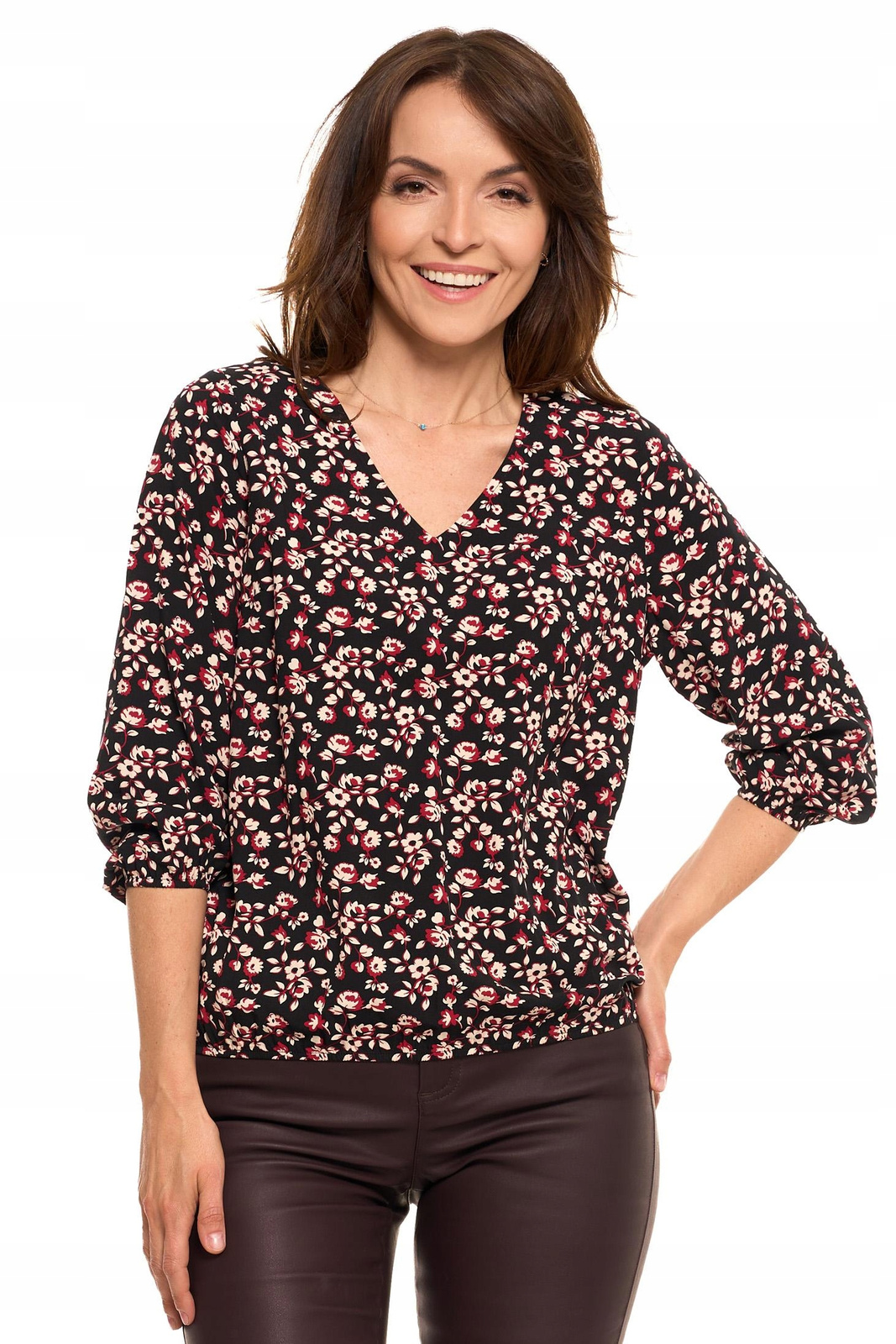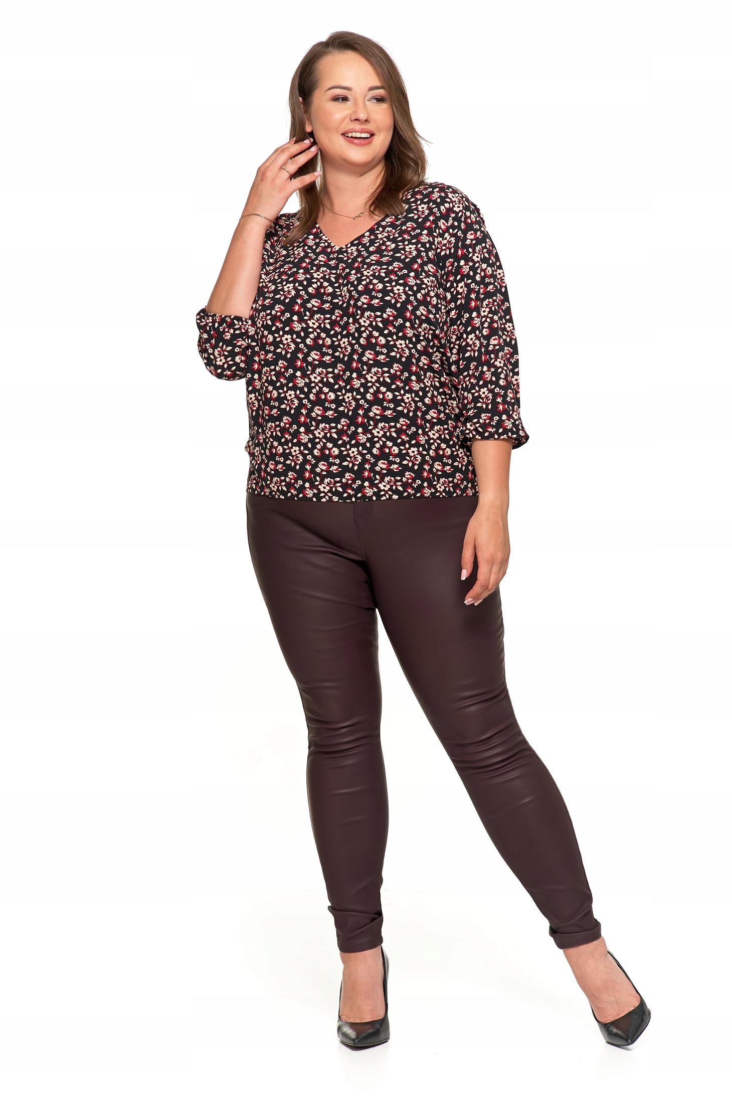 Luźny krój typu bombka, zakończony gumką na dole, subtelnie podkreśla sylwetkę, jednocześnie zapewniając pełną swobodę ruchów i komfort noszenia. Dekolt w serek nadaje bluzce kobiecego uroku, a rękawy 3/4 zakończone ściągaczem dodają całości nowoczesnego stylu.