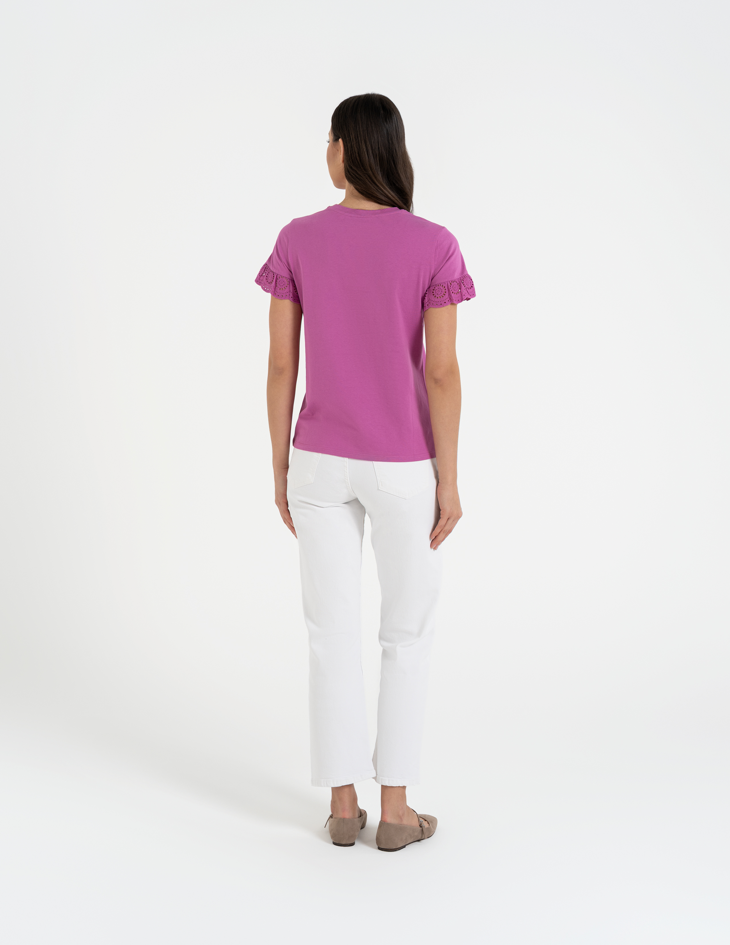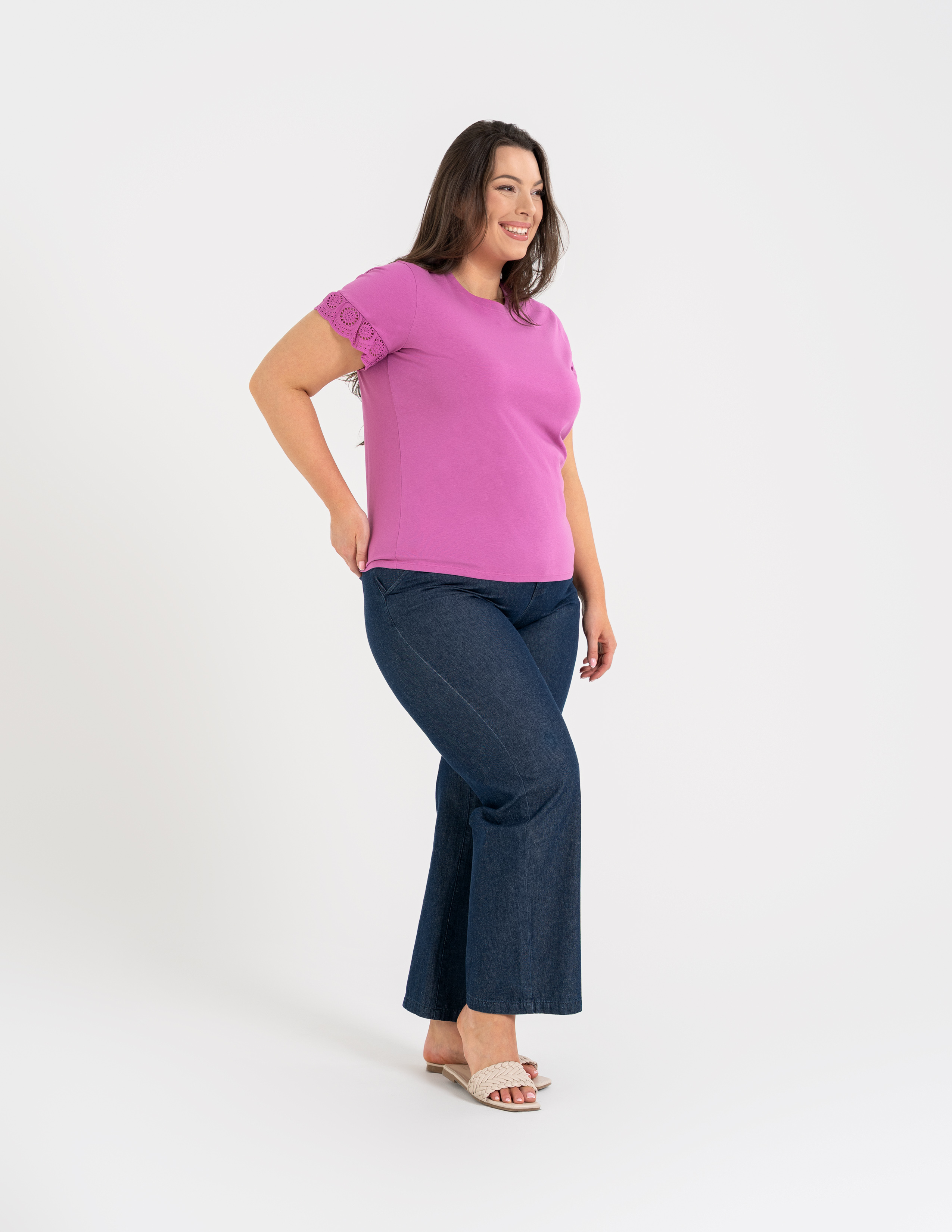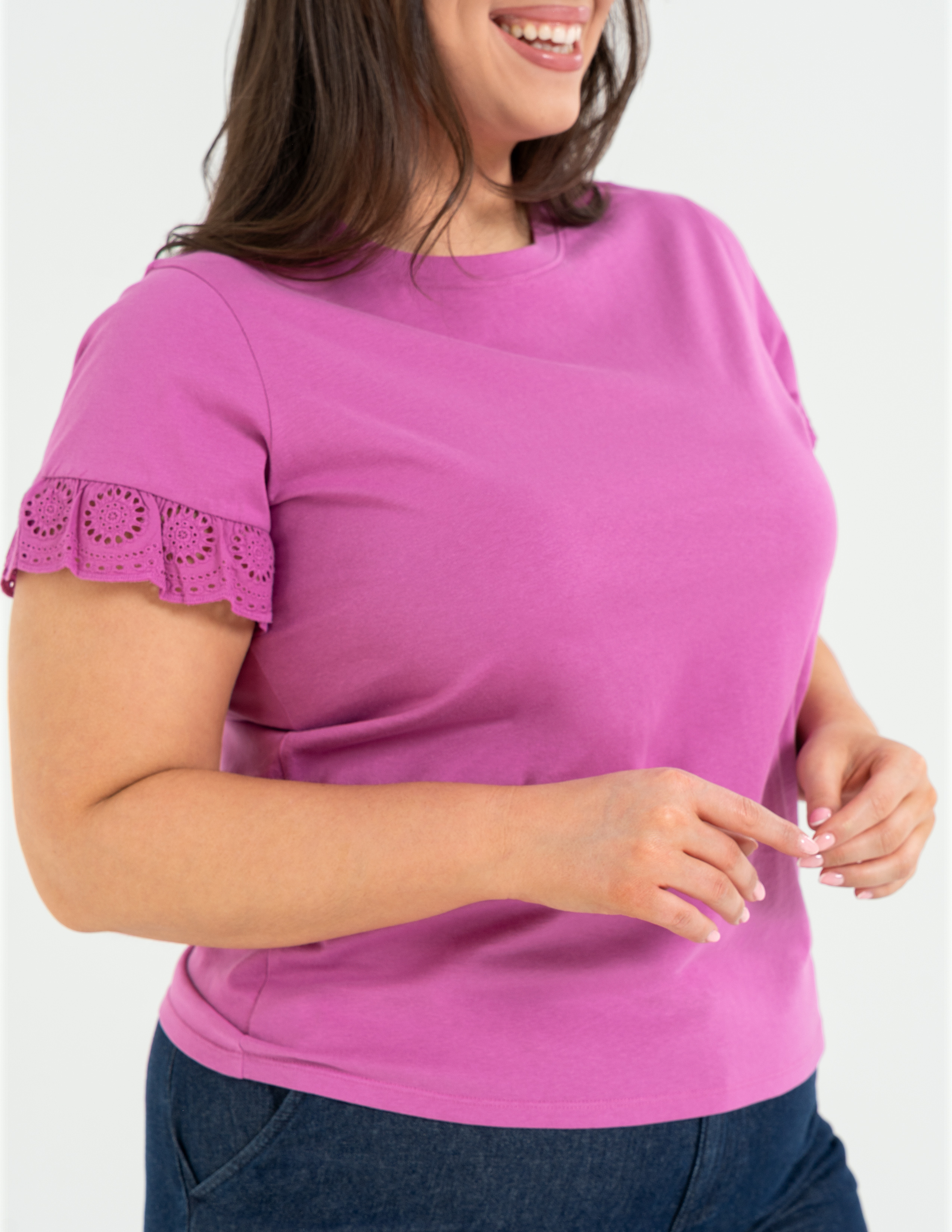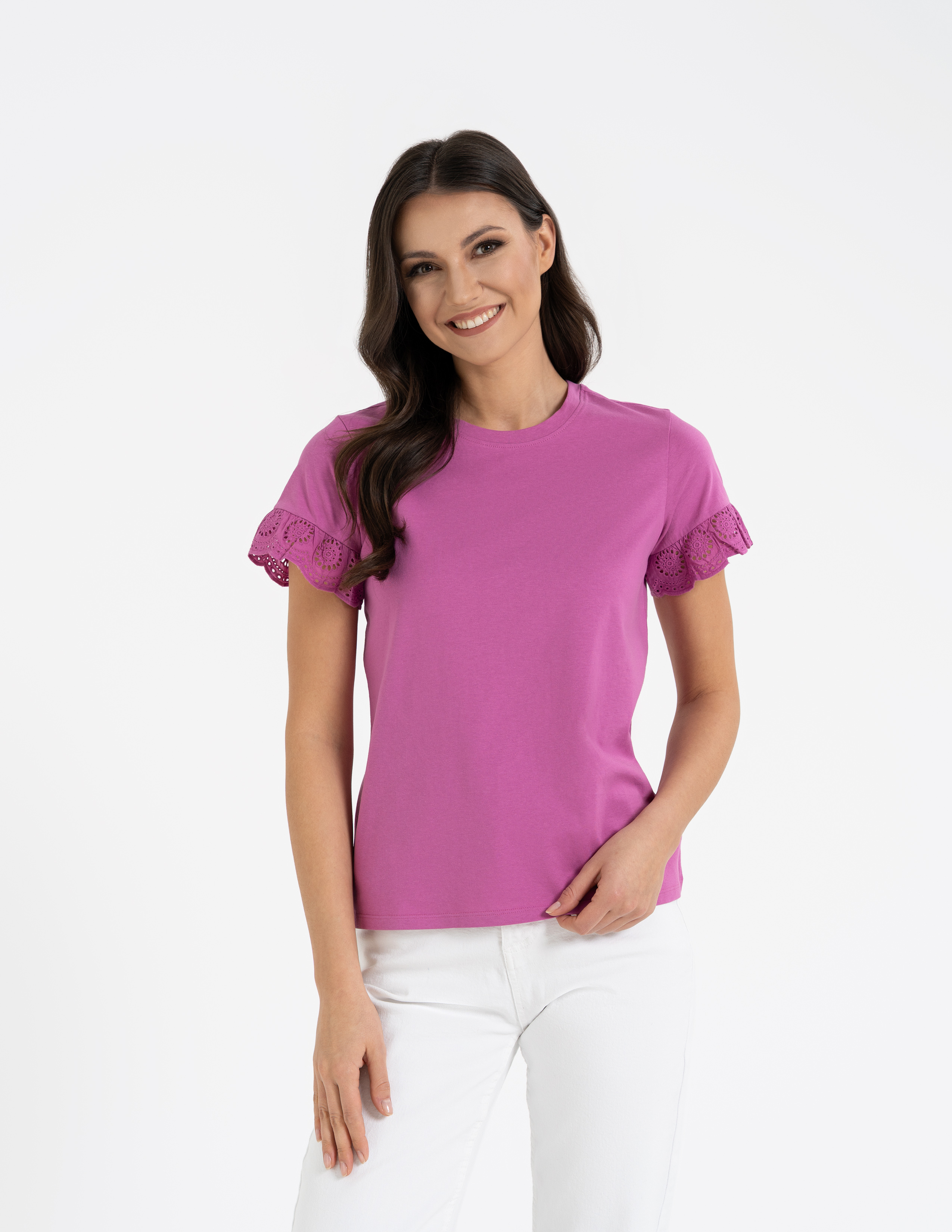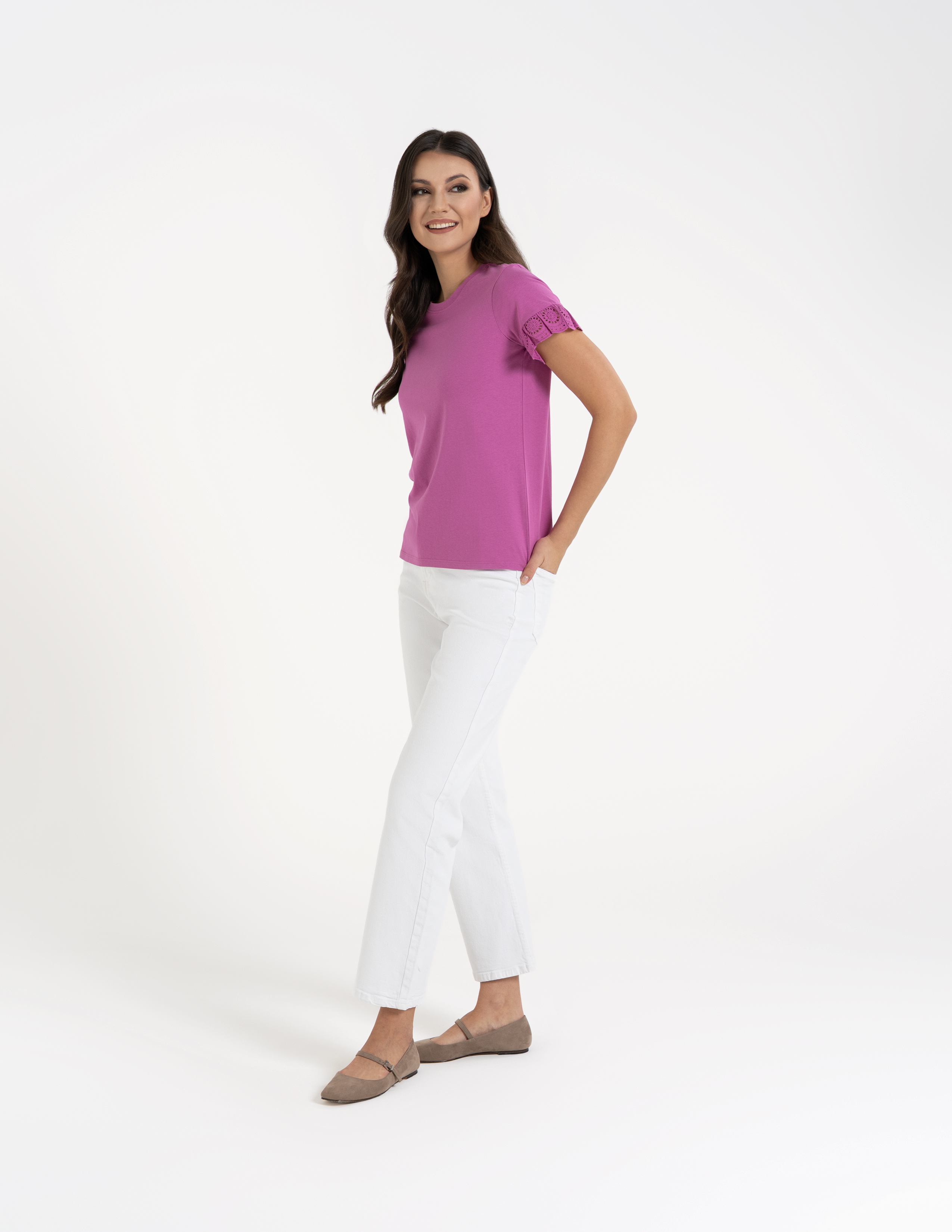- Romantyczny Akcent: Krótkie rękawki zakończone delikatną, misterną koronką nadają bluzce unikalnego charakteru. Ten mały detal sprawia, że prosta stylizacja natychmiast staje się bardziej kobieca i dopracowana.