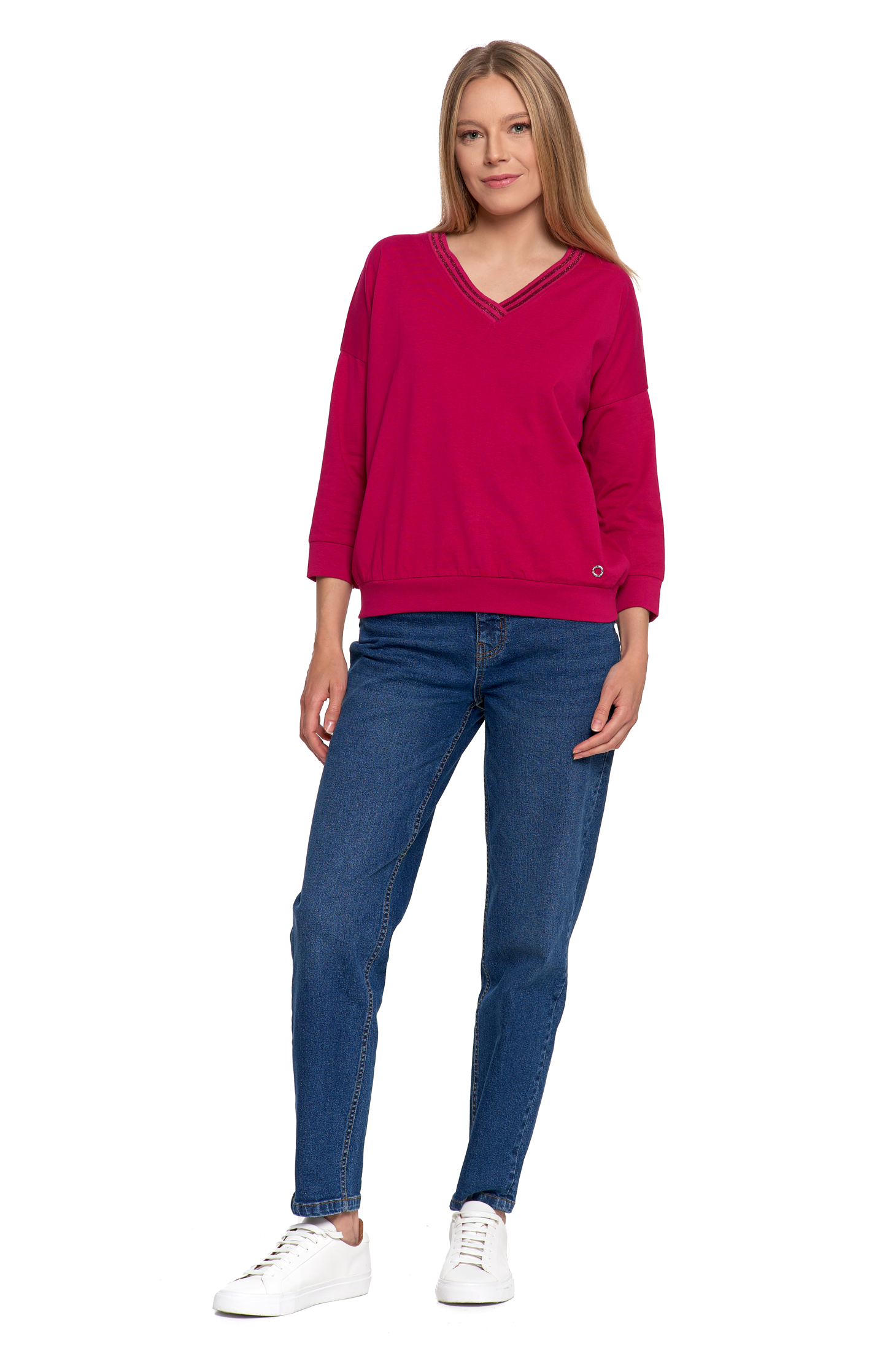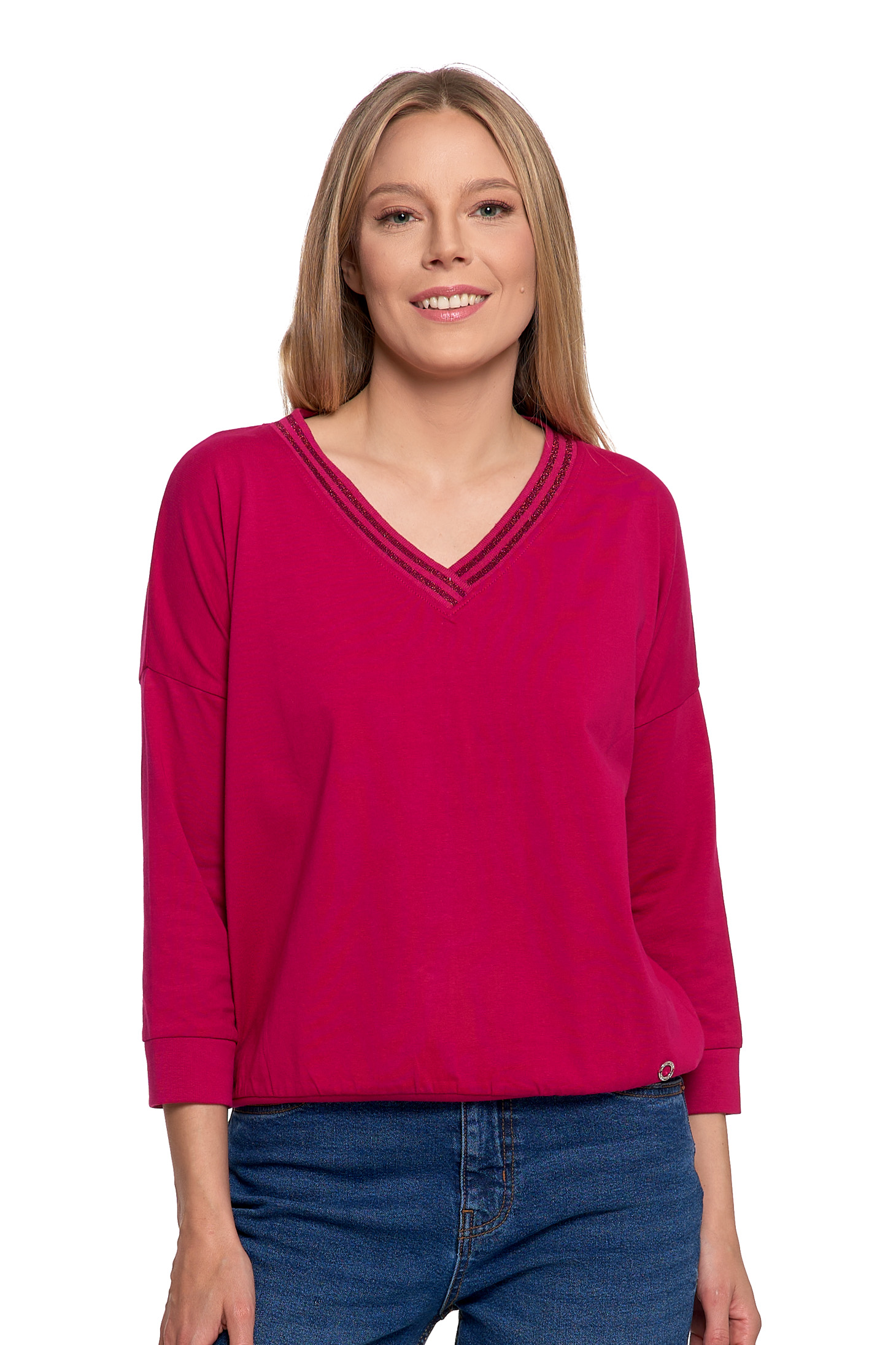 - Ozdobny dekolt: Detal przy dekolcie (np. subtelne marszczenie, delikatne wycięcie lub aplikacja) nadaje koszulce elegancki i kobiecy charakter.