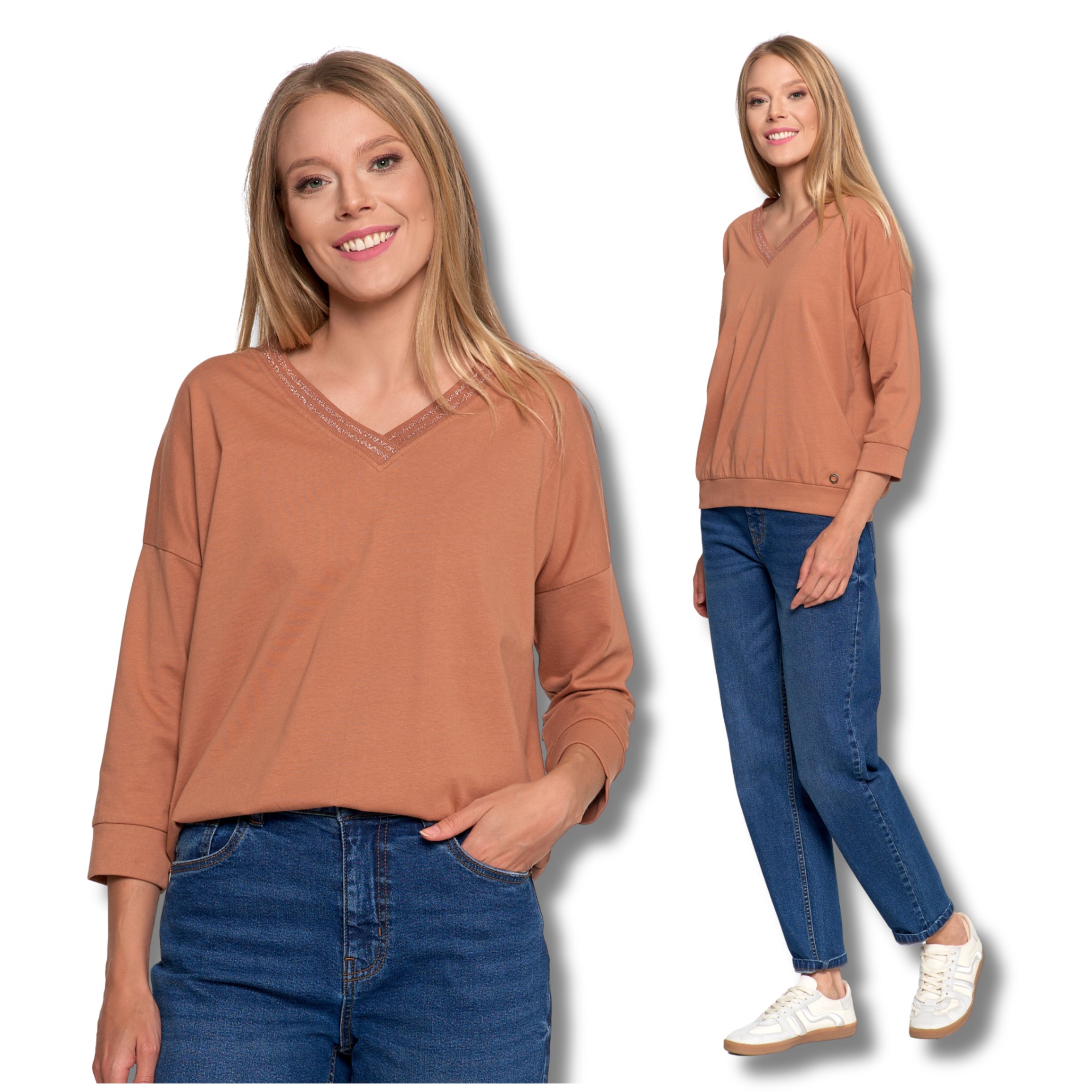 - Ozdobny dekolt: Detal przy dekolcie (np. subtelne marszczenie, delikatne wycięcie lub aplikacja) nadaje koszulce elegancki i kobiecy charakter.