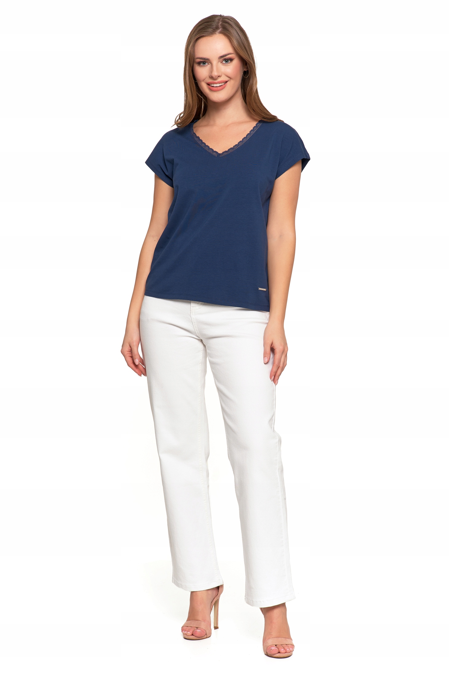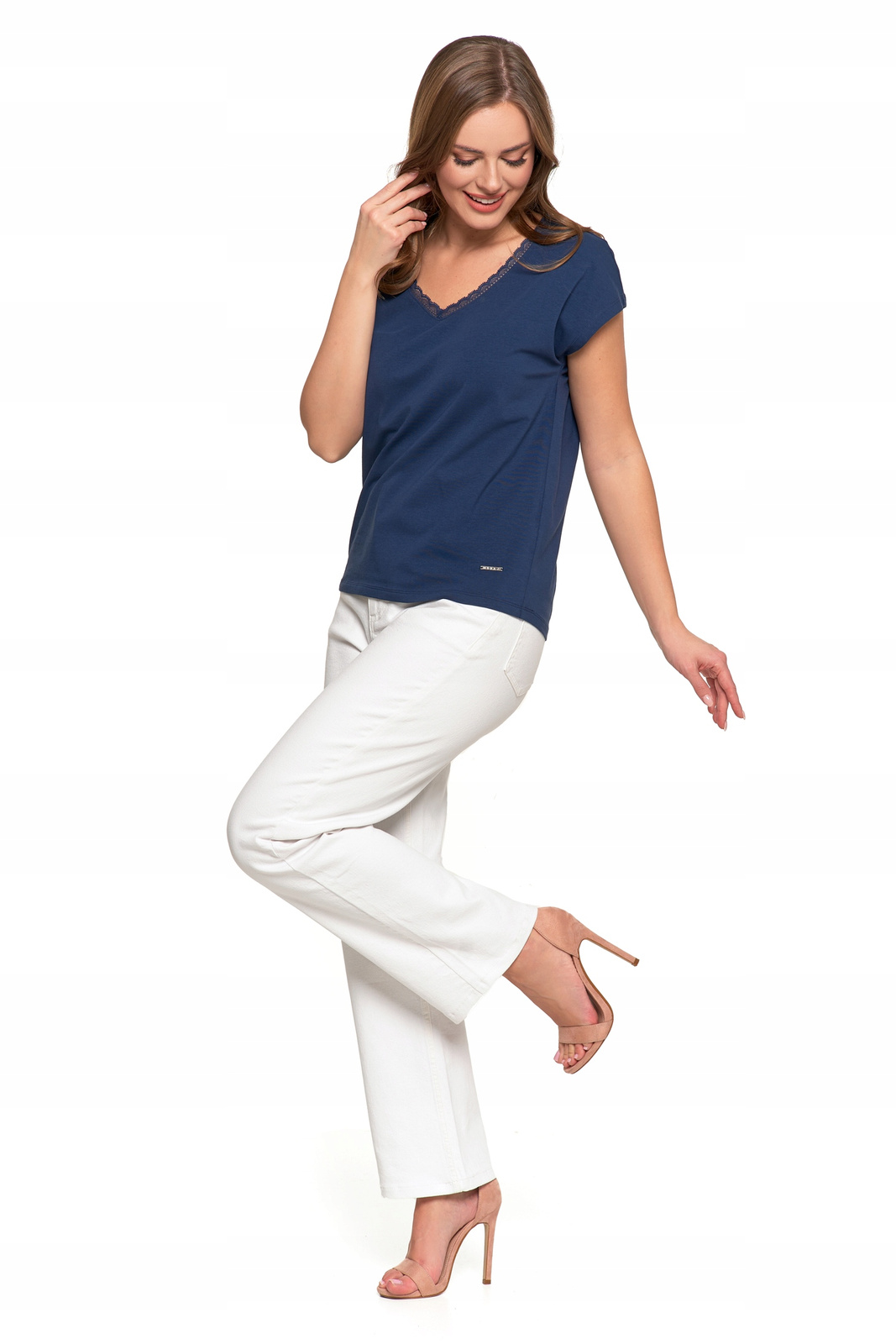 - Dekolt w serek z koronkowym wykończeniem – dodaje bluzce kobiecego uroku