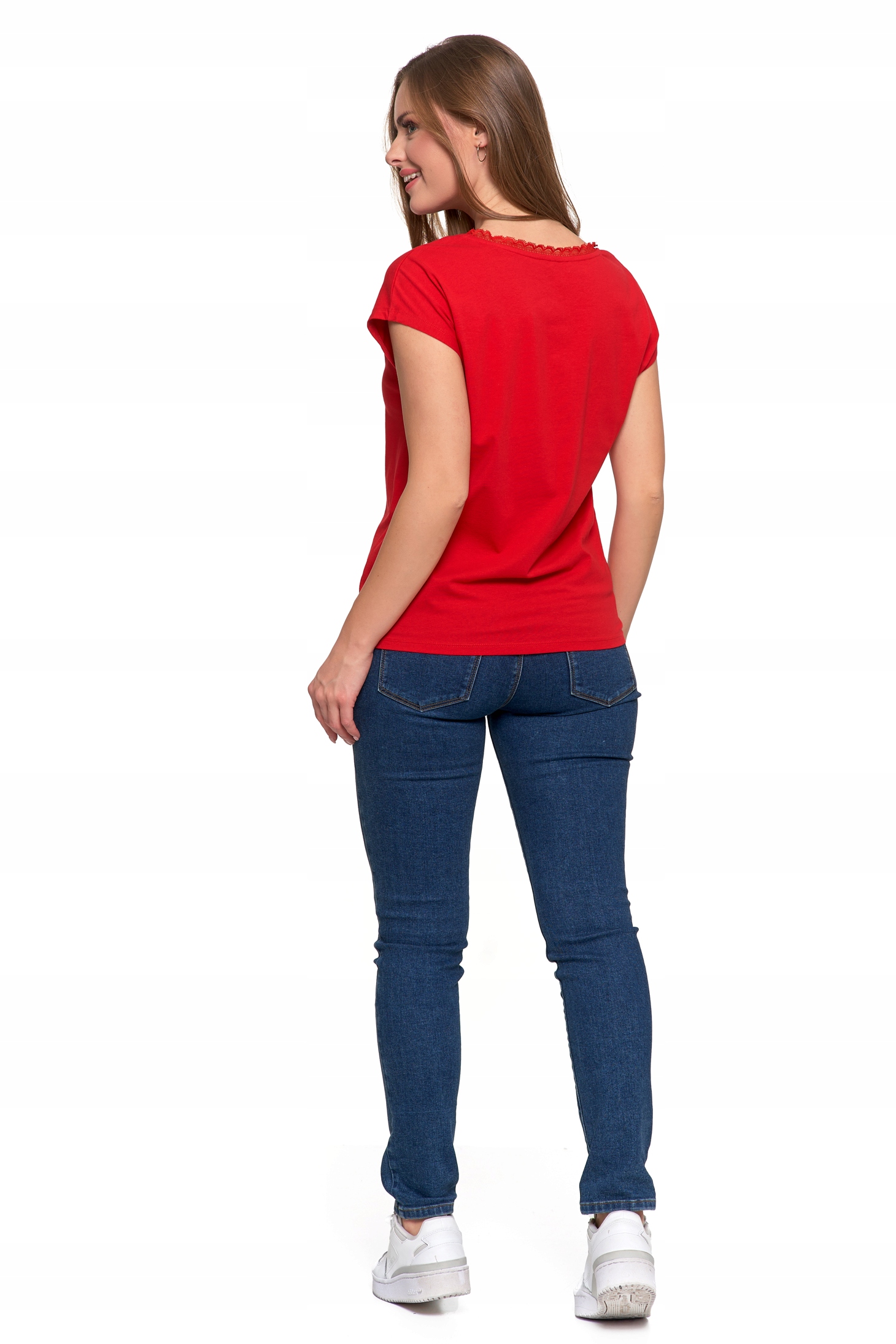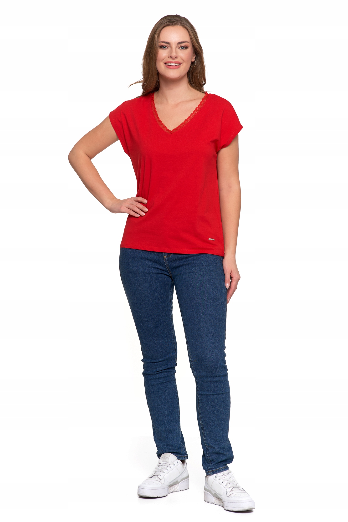 - Dekolt w serek z koronkowym wykończeniem – dodaje bluzce kobiecego uroku