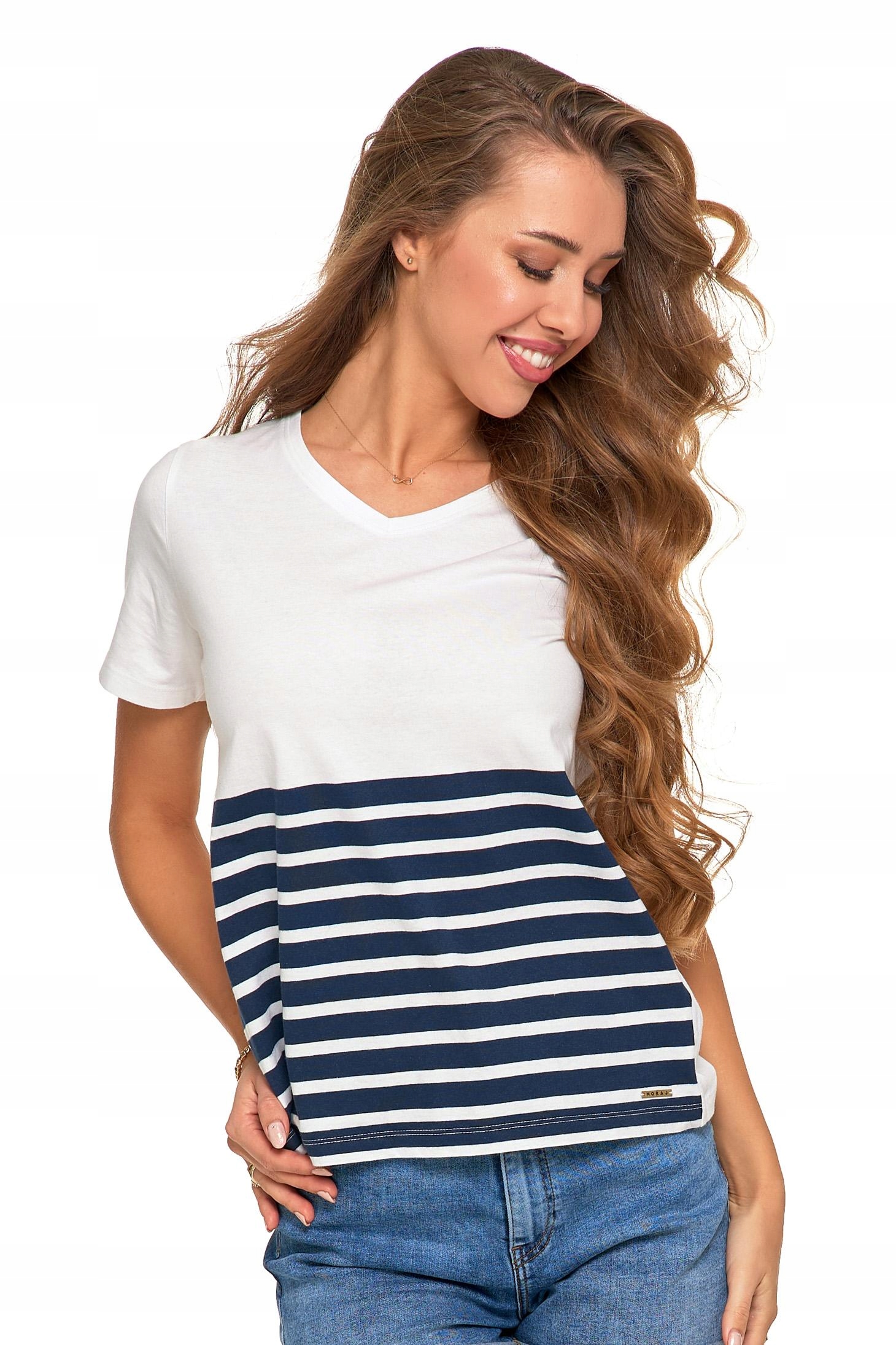 Bluzka Damska Krótki Rękaw  T-Shirt Koszulka Dekolt w Serek Paski MORAJ