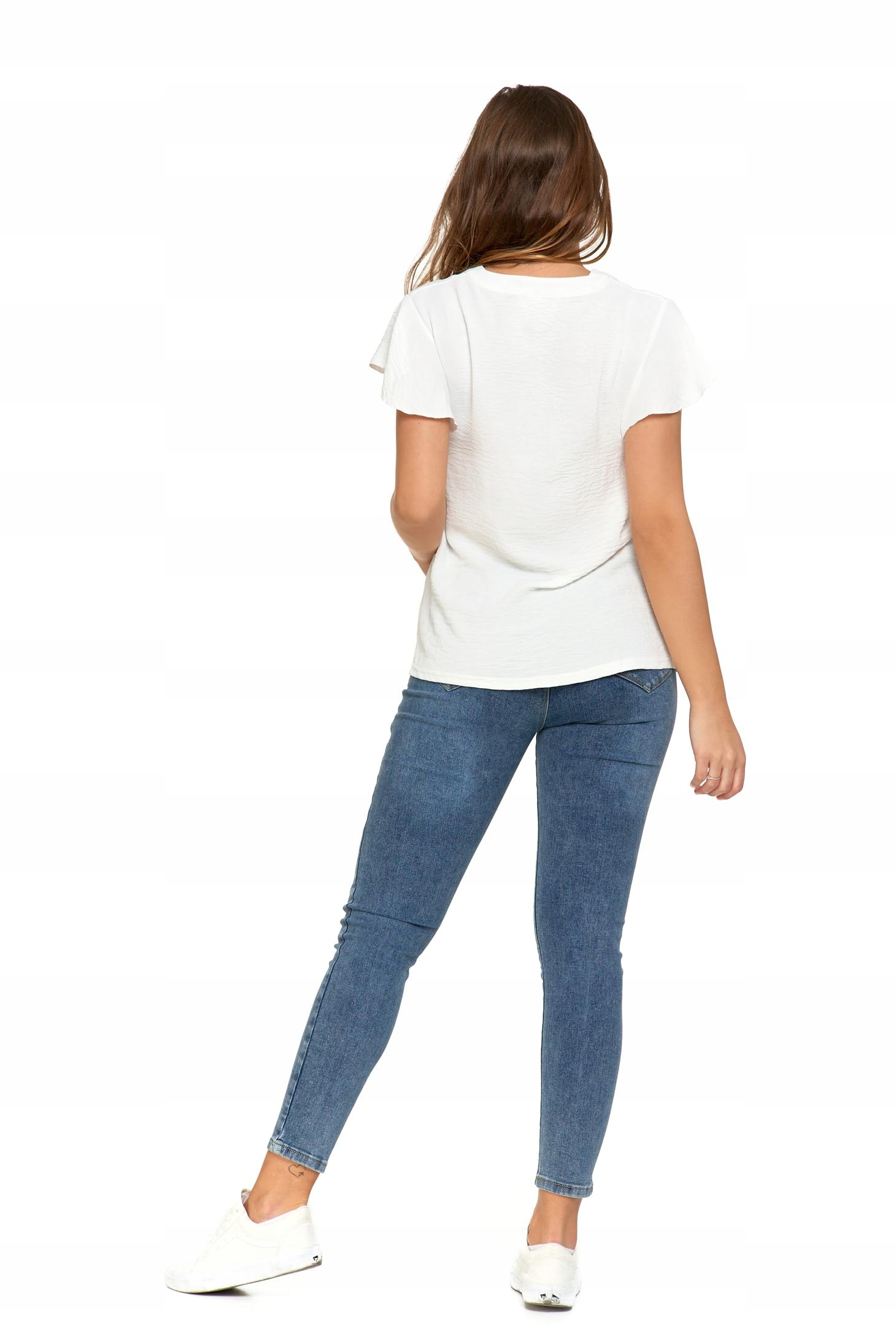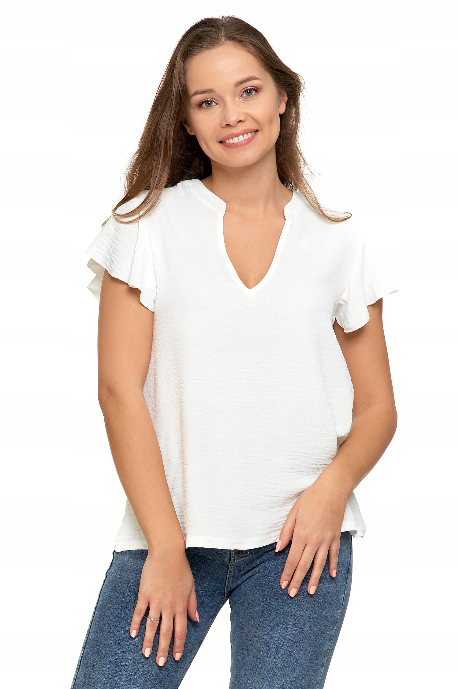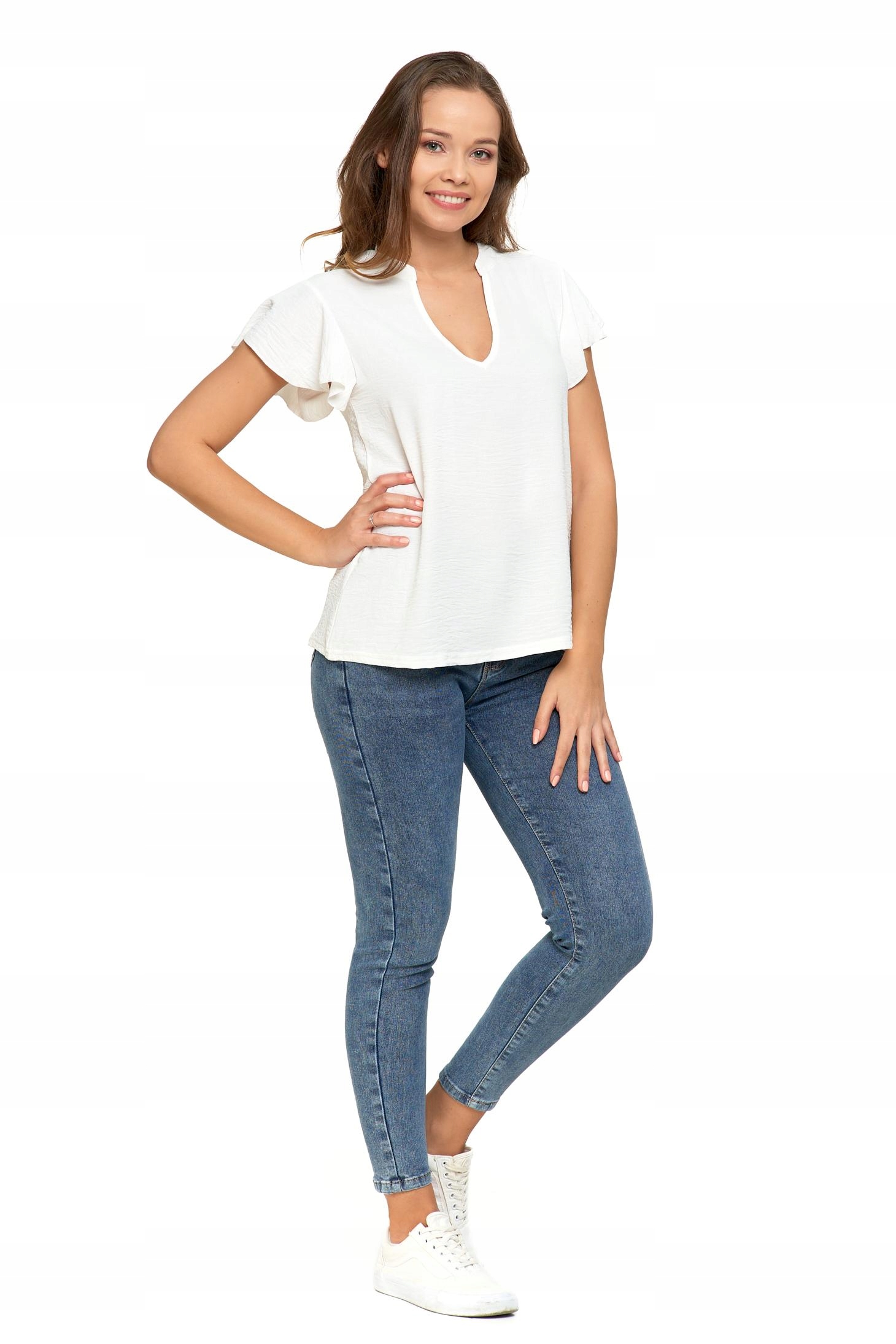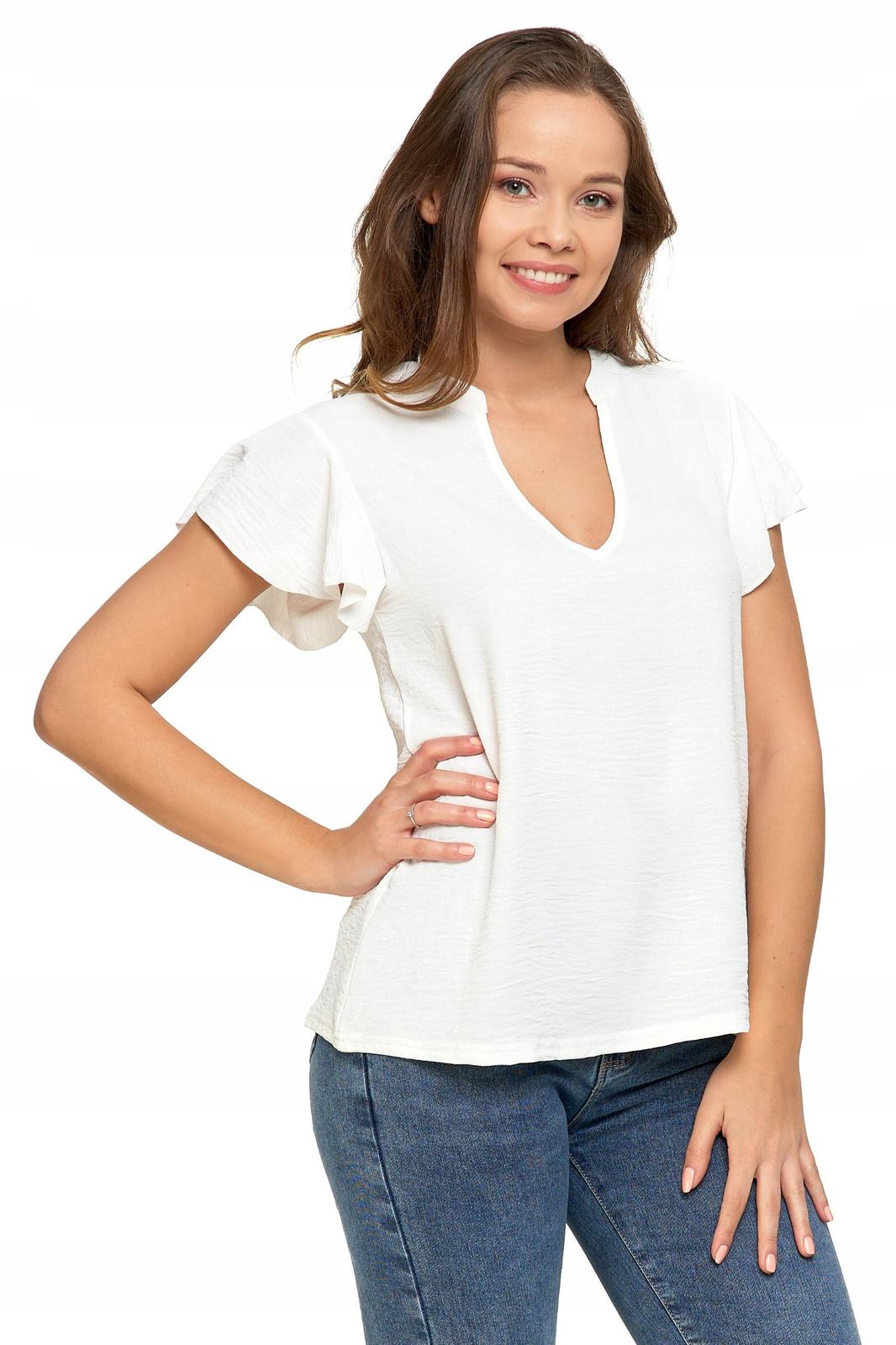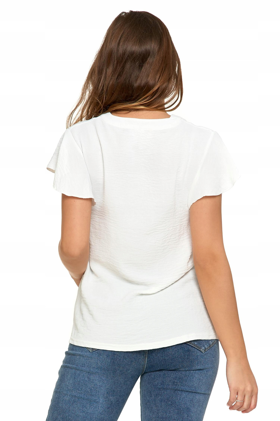 Bluzka wykonana jest z miękkiego i przyjemnego w dotyku materiału, który zapewnia komfort noszenia przez cały dzień. Motylkowe, krótkie rękawki to ciekawy element, który dodaje bluzce lekkości. Dekolt w kształcie litery V pięknie podkreśla szyję. Klasyczny krój bluzki doskonale pasuje do różnych stylizacji - zarówno tych casualowych, jak i bardziej eleganckich.