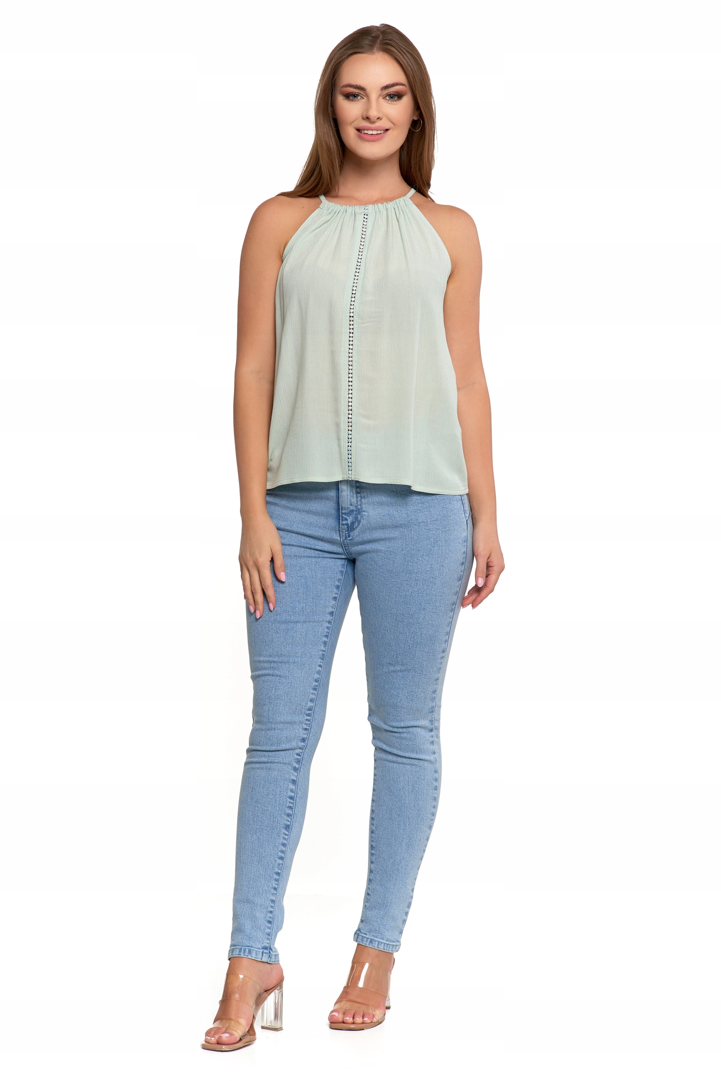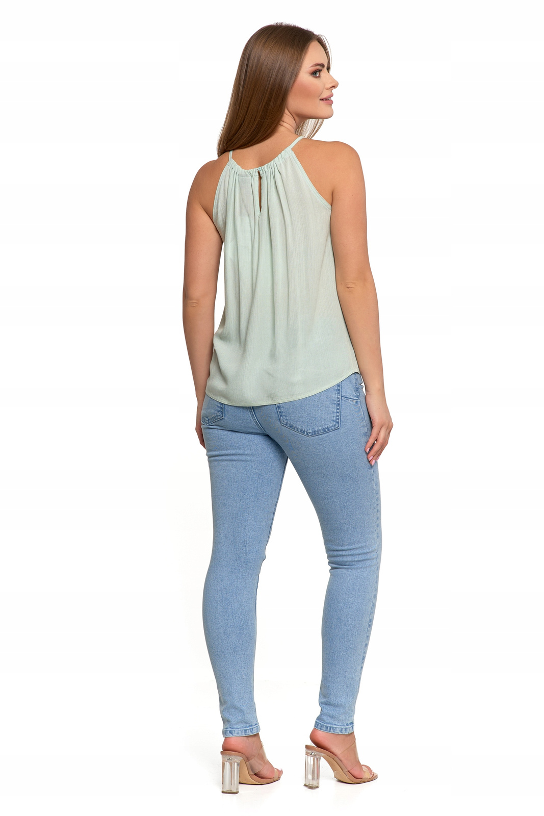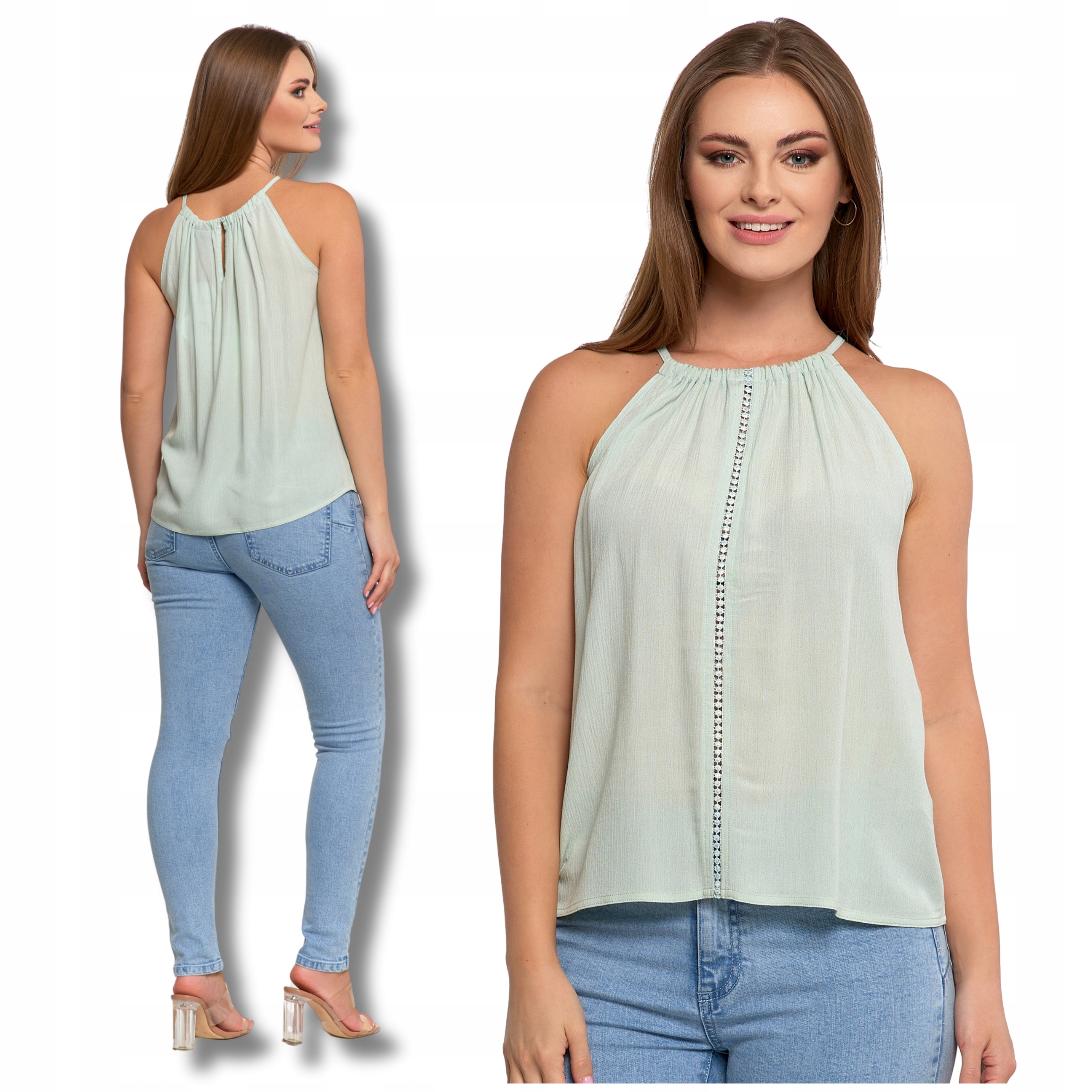 - Dekolt halter – subtelnie eksponuje ramiona i szyję, nadając eleganckiego charakteru.