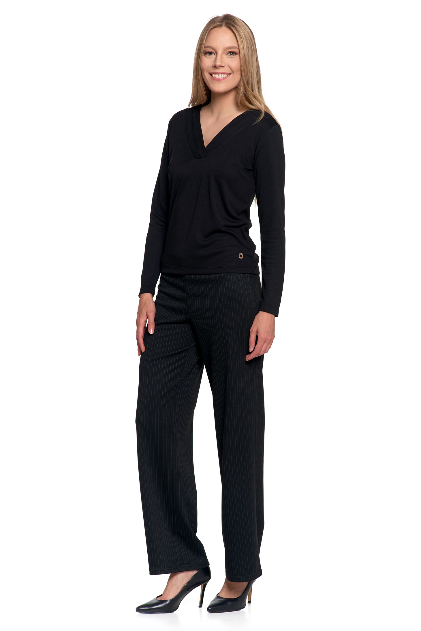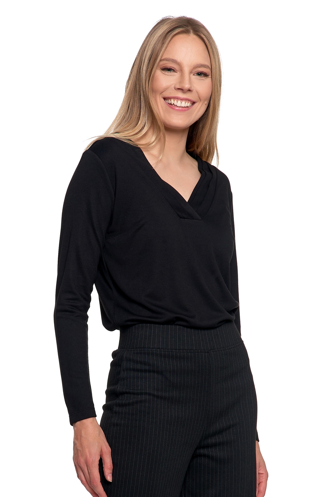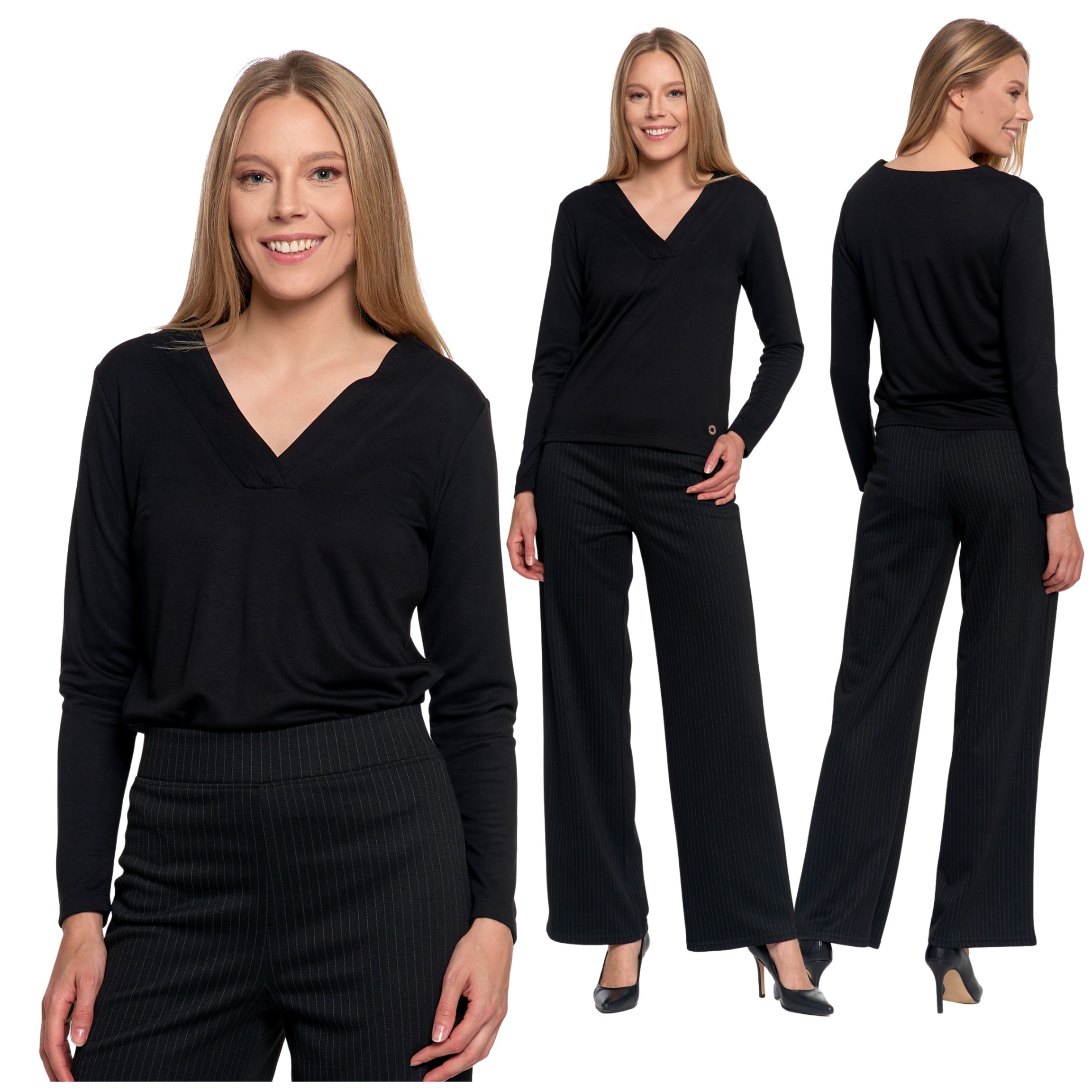 • Design: Dekolt w kształcie litery V subtelnie wysmukla szyję i dodaje bluzce kobiecego charakteru.