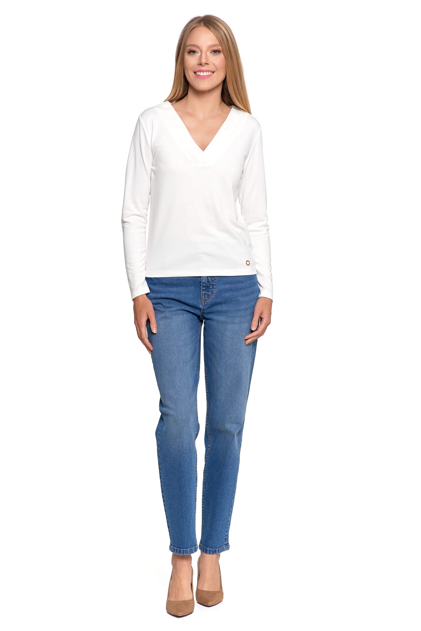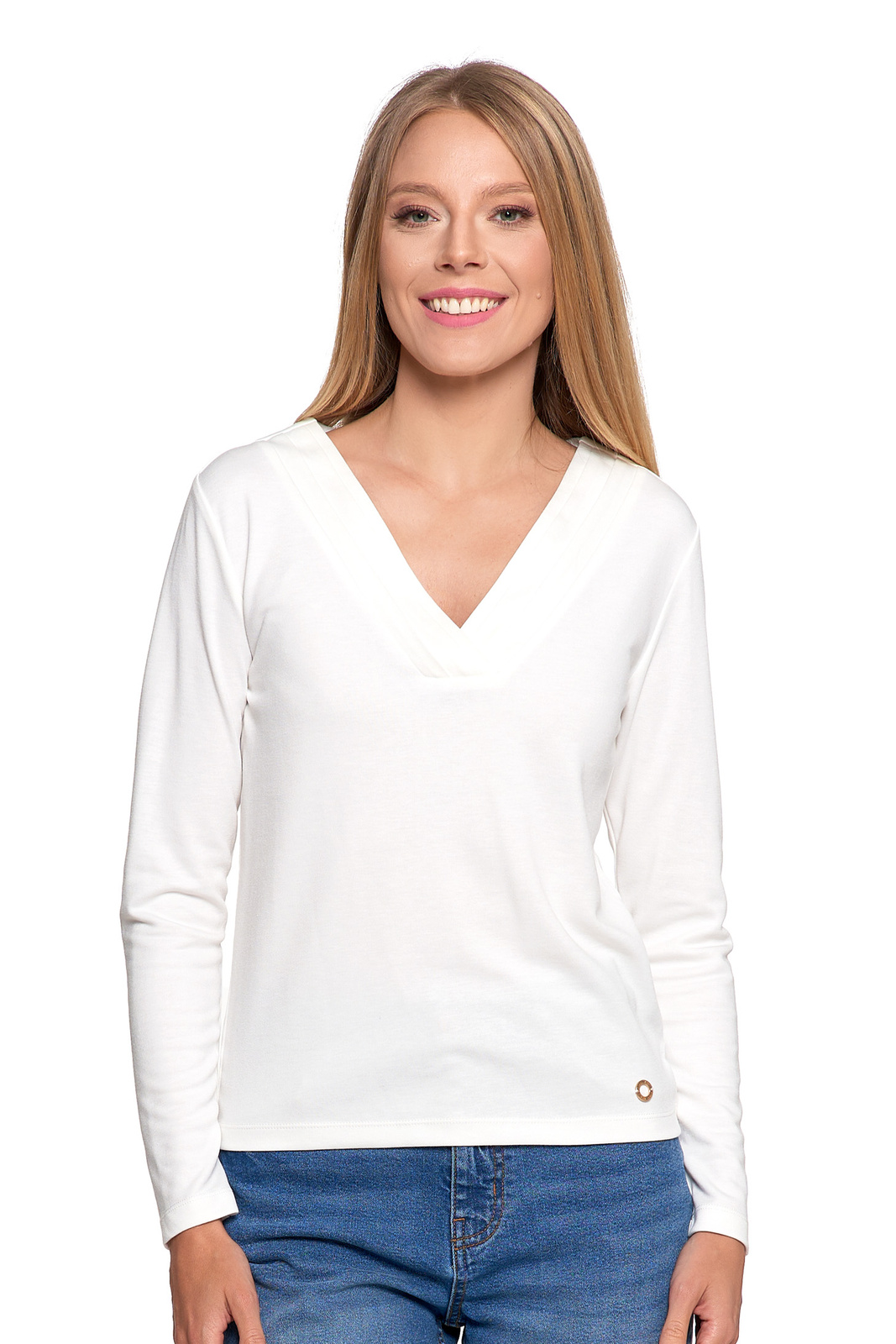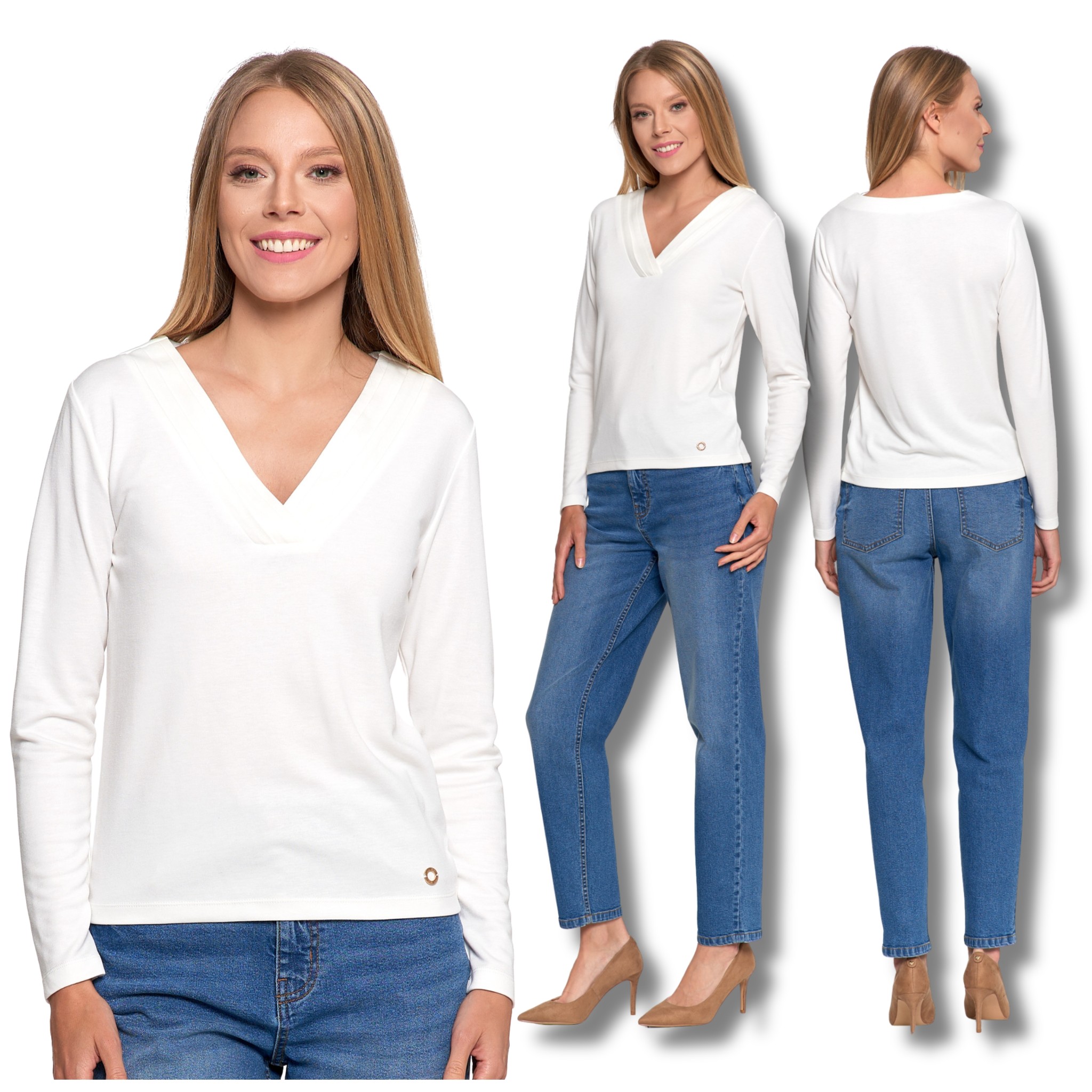 • Design: Dekolt w kształcie litery V subtelnie wysmukla szyję i dodaje bluzce kobiecego charakteru.