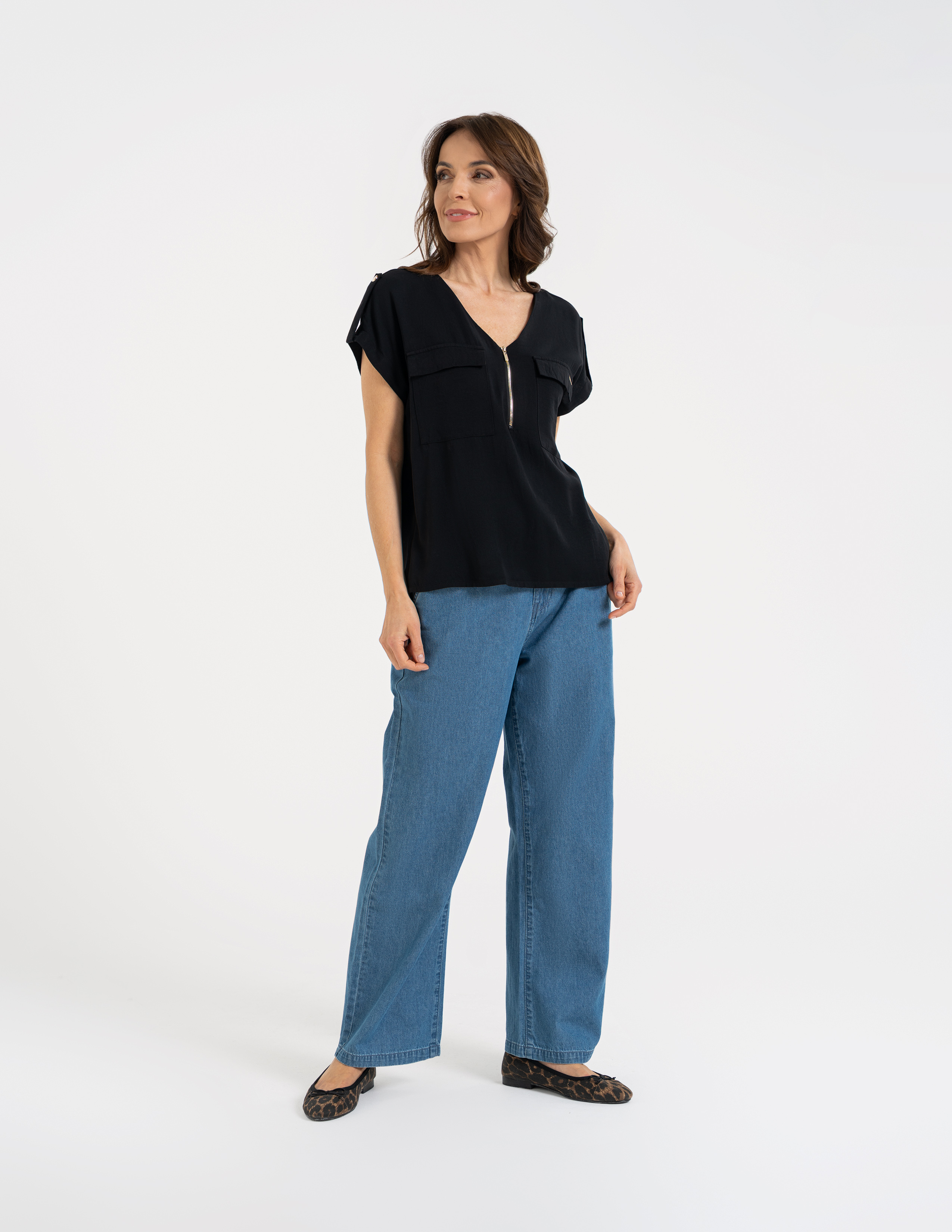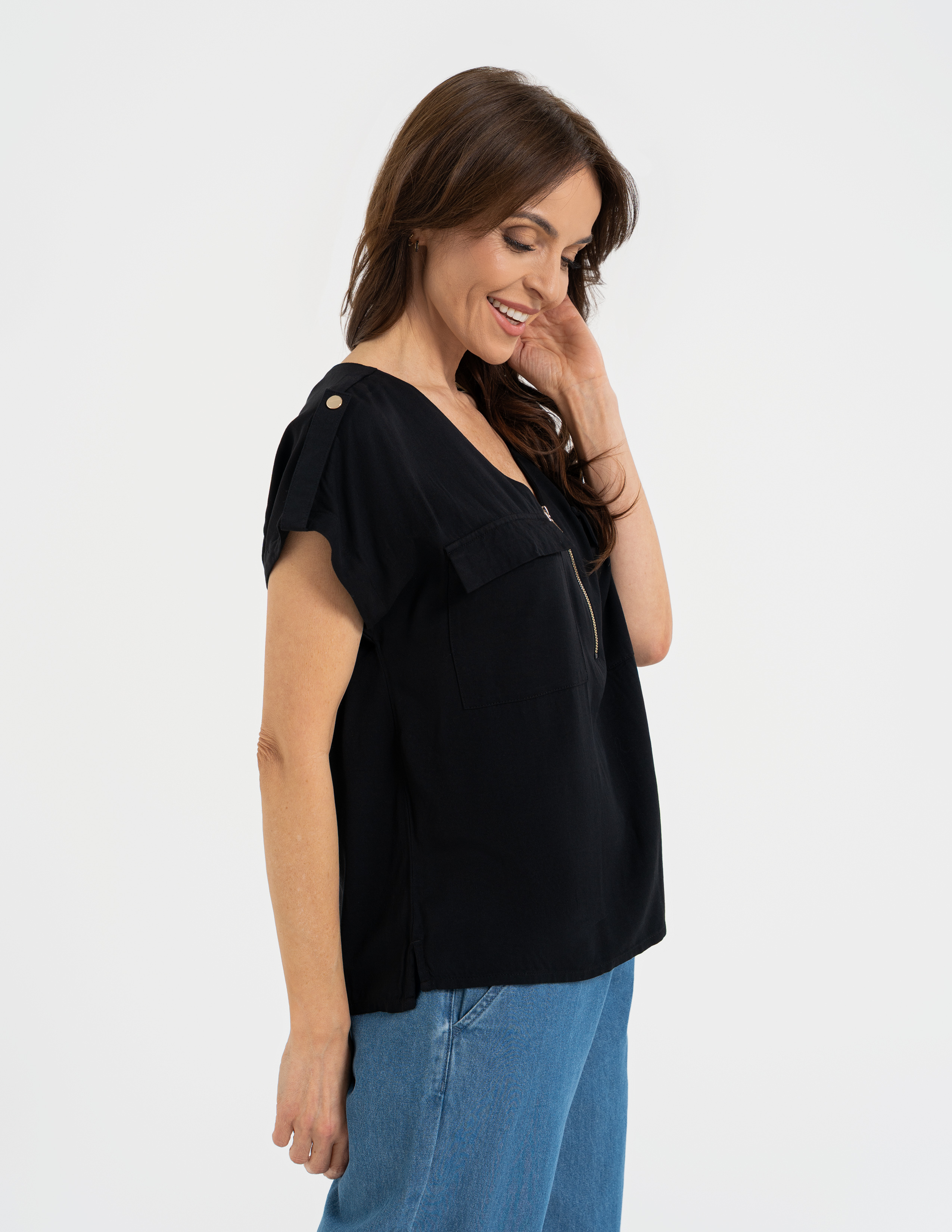 Bluzka Moraj z wiskozy to mistrzyni uniwersalności. Dzięki zapięciu na suwak i dekoracyjnym kieszonkom, wyróżnia się na tle klasycznych koszulek, pozostając przy tym niesamowicie wygodną. Naturalna tkanina pięknie odbija światło i doskonale układa się w ruchu, sprawiając, że wyglądasz świeżo i stylowo od rana do późnego wieczora.