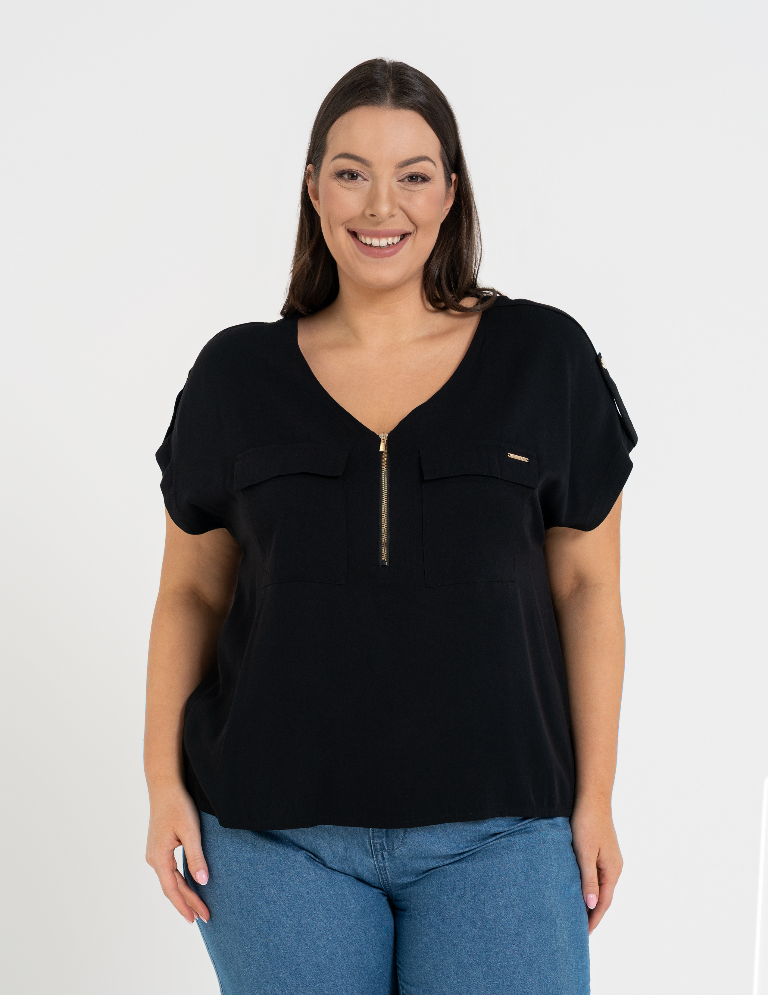 - Casualowe Detale: Dekoracyjne kieszonki na piersiach oraz krótkie rękawy z modnym podwinięciem nadają bluzce swobodnego, miejskiego charakteru, przełamując jej elegancki materiał.