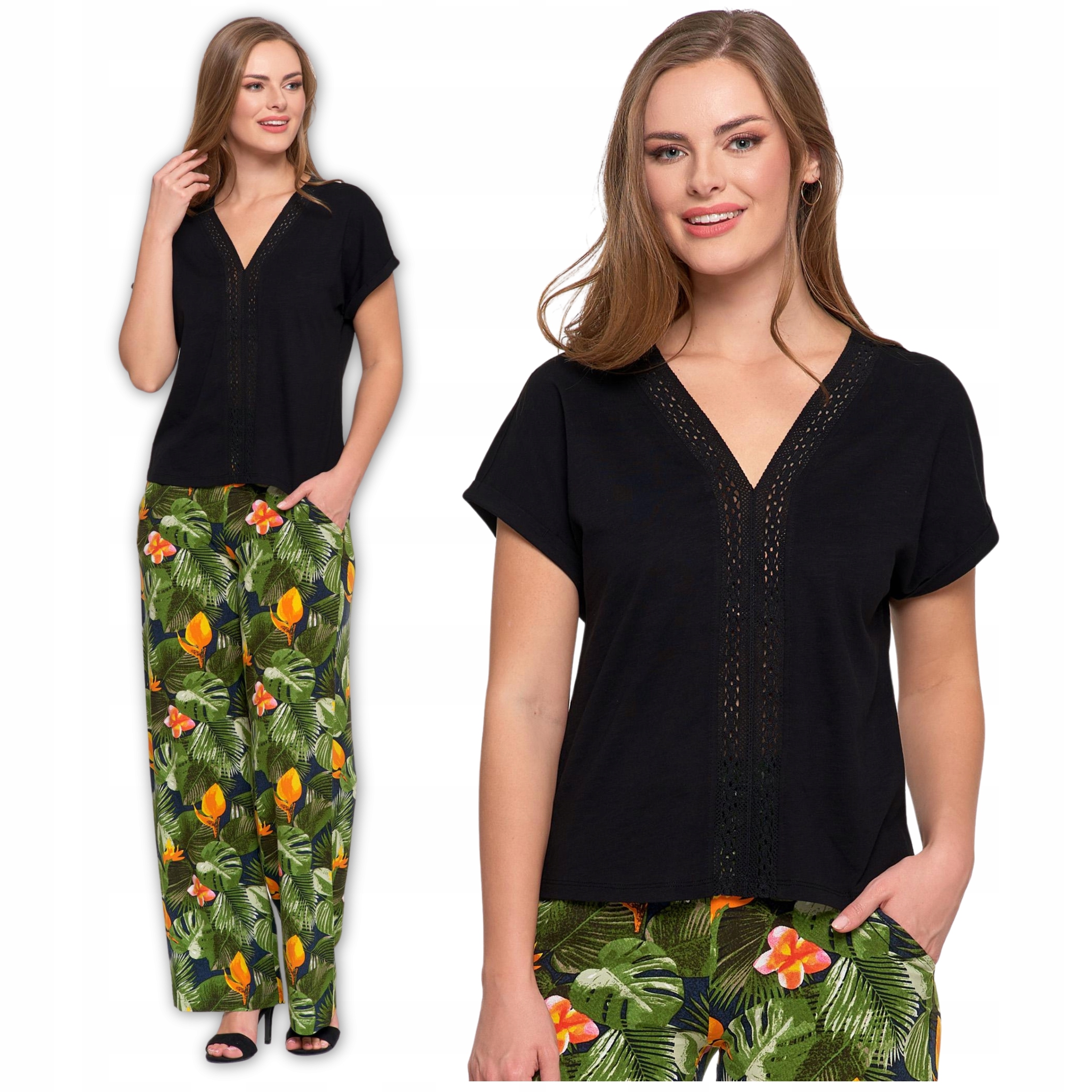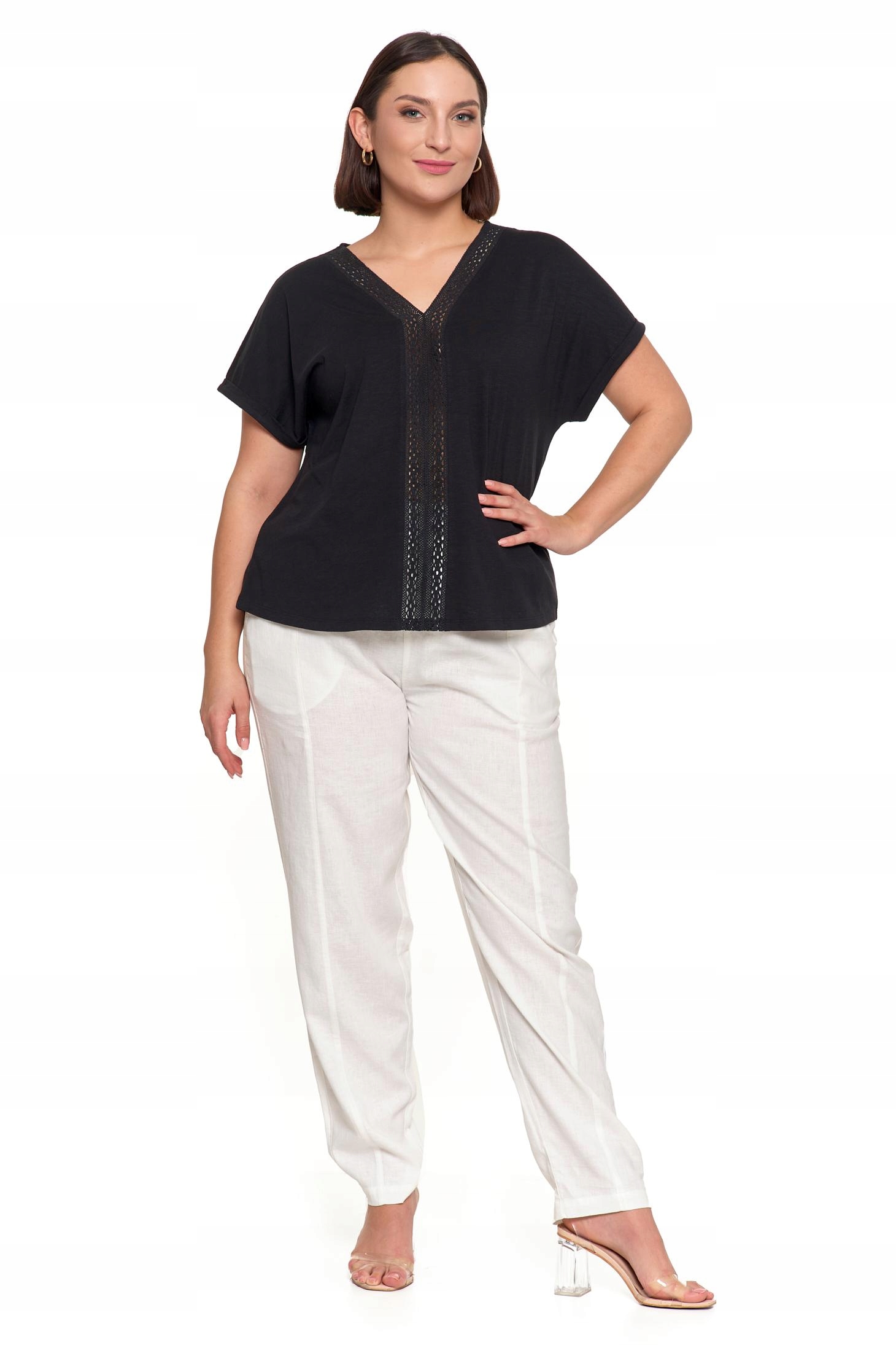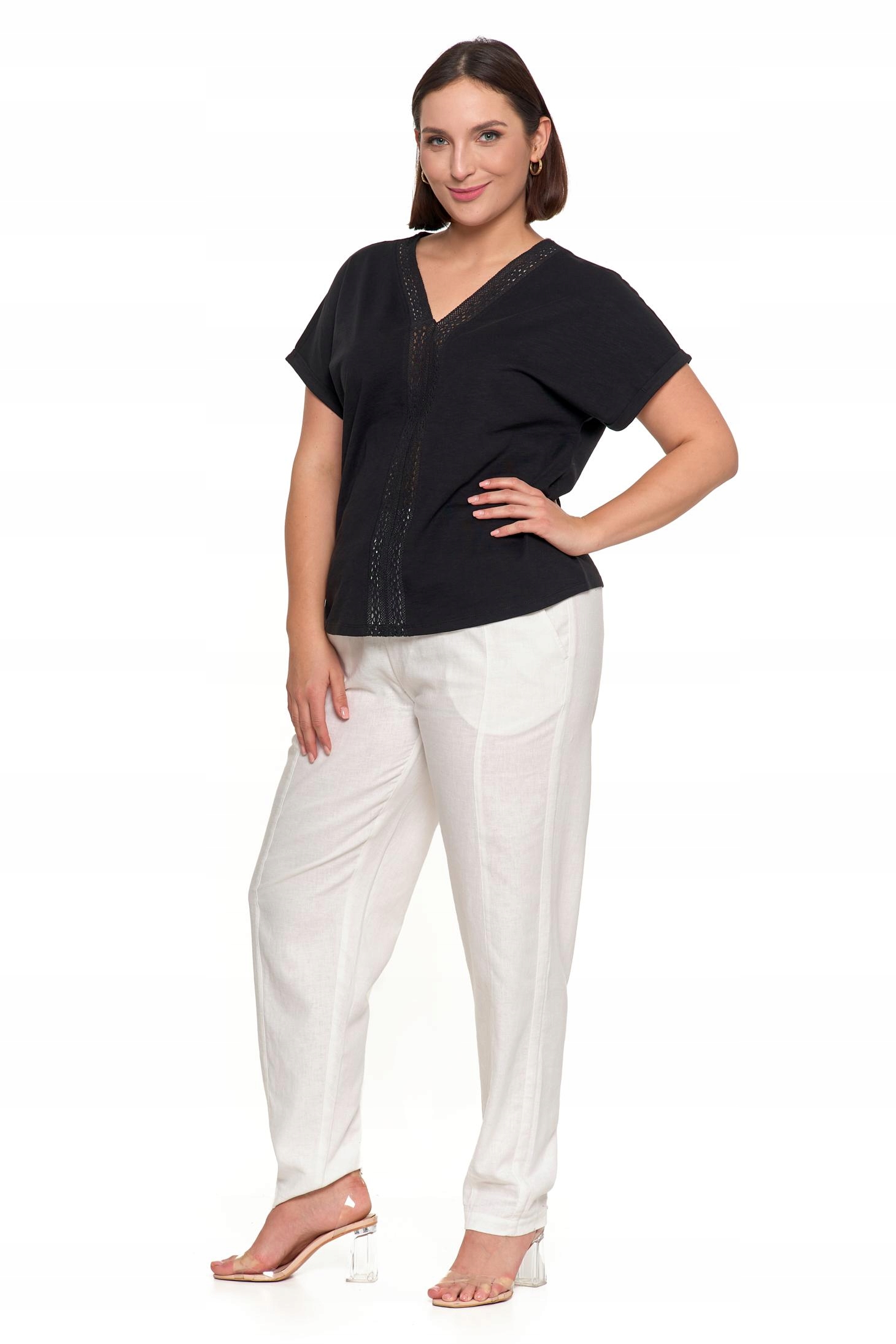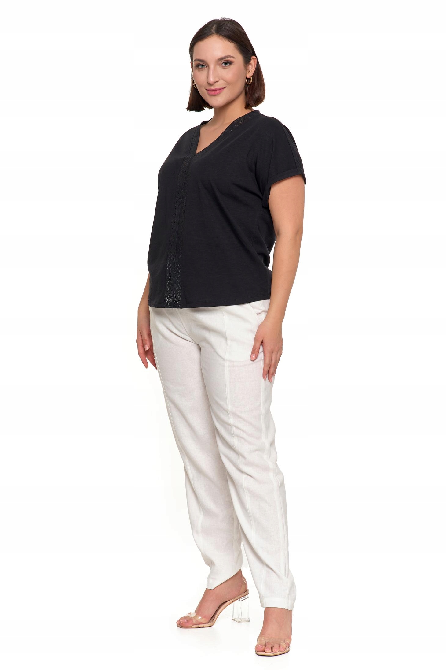 - Koronkowa, ażurowa wstawka, dodająca bluzce delikatności i elegancji.