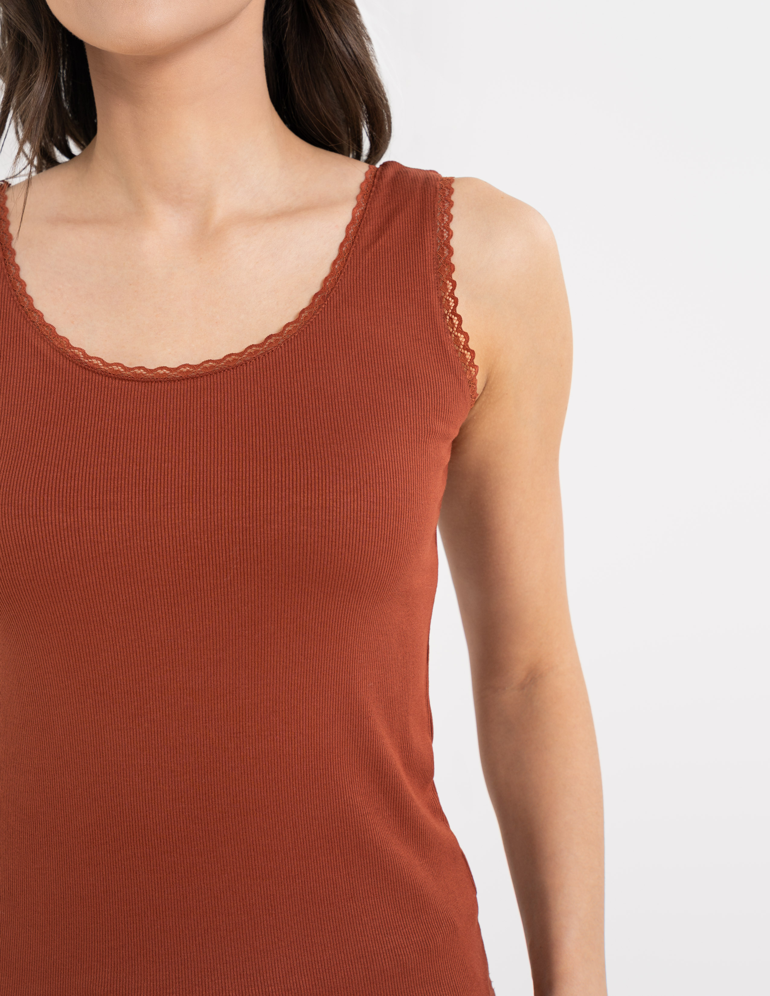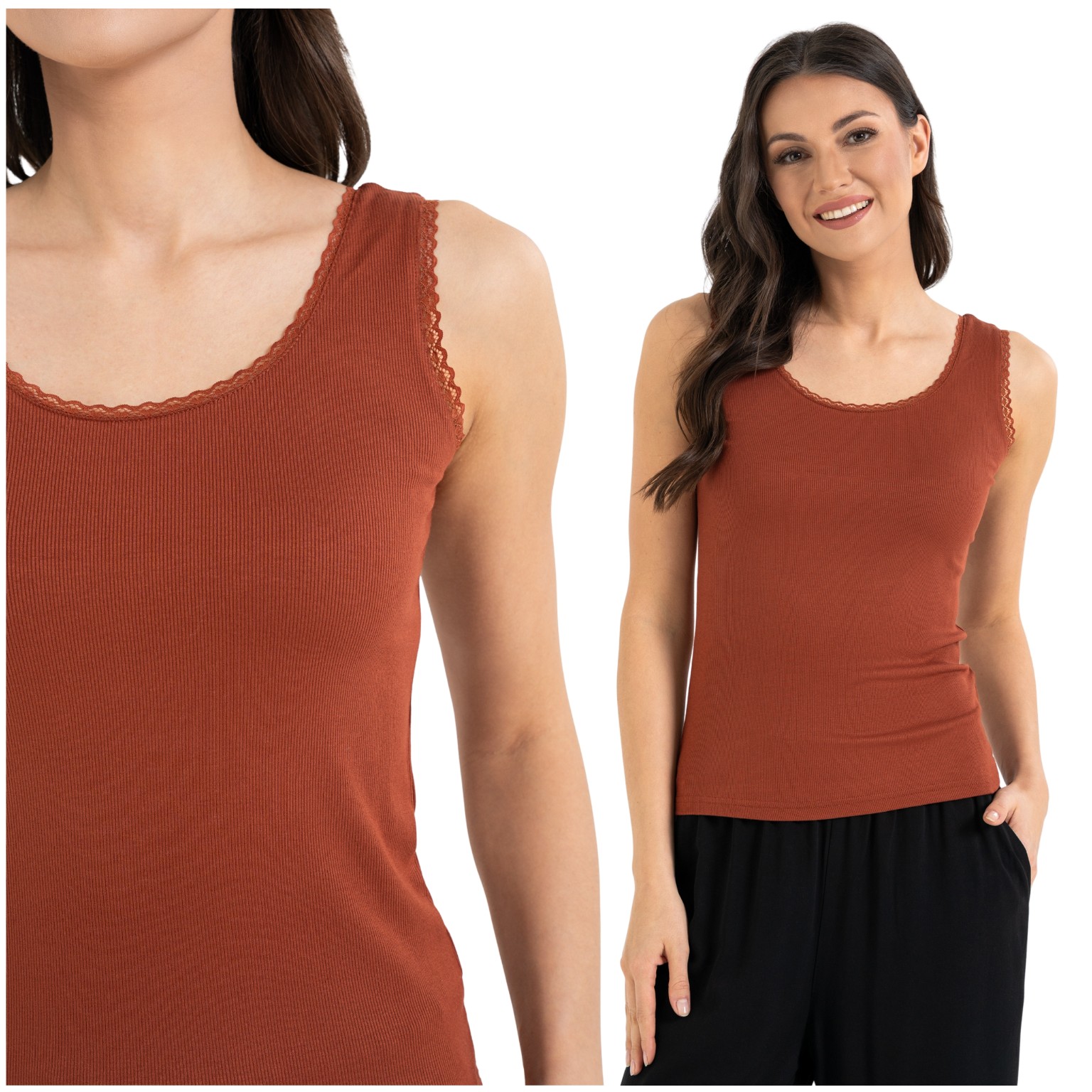 - Zmysłowa Koronka: Miękkie wykończenie dekoltu i ramiączek dodaje elegancji, sprawiając, że top świetnie prezentuje się wystając spod swetra lub marynarki.