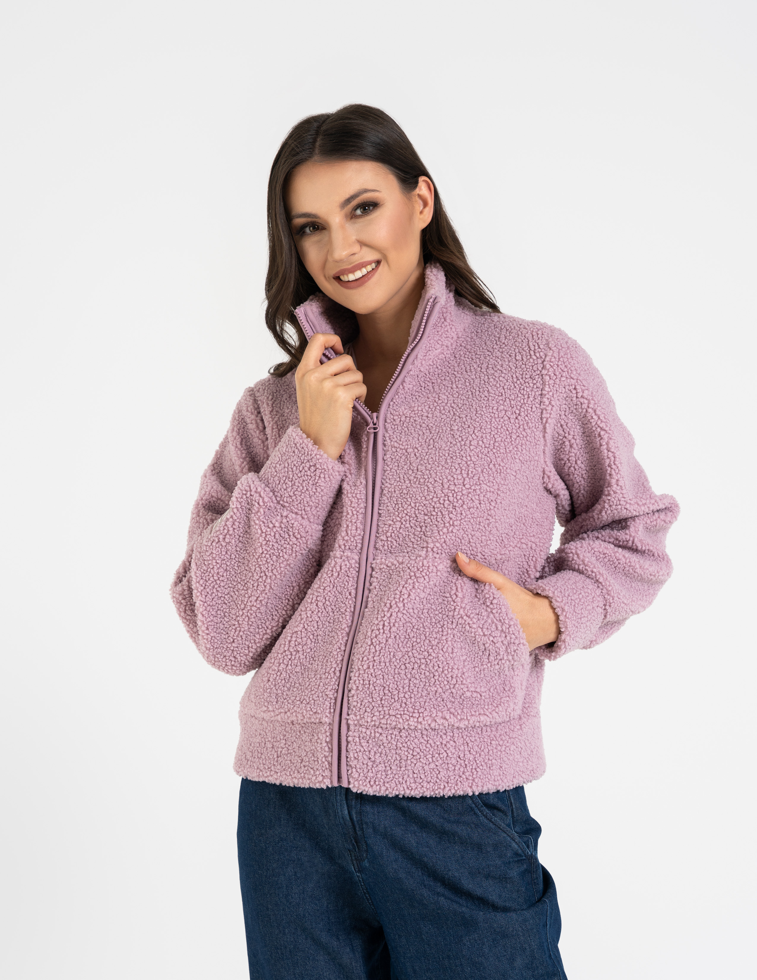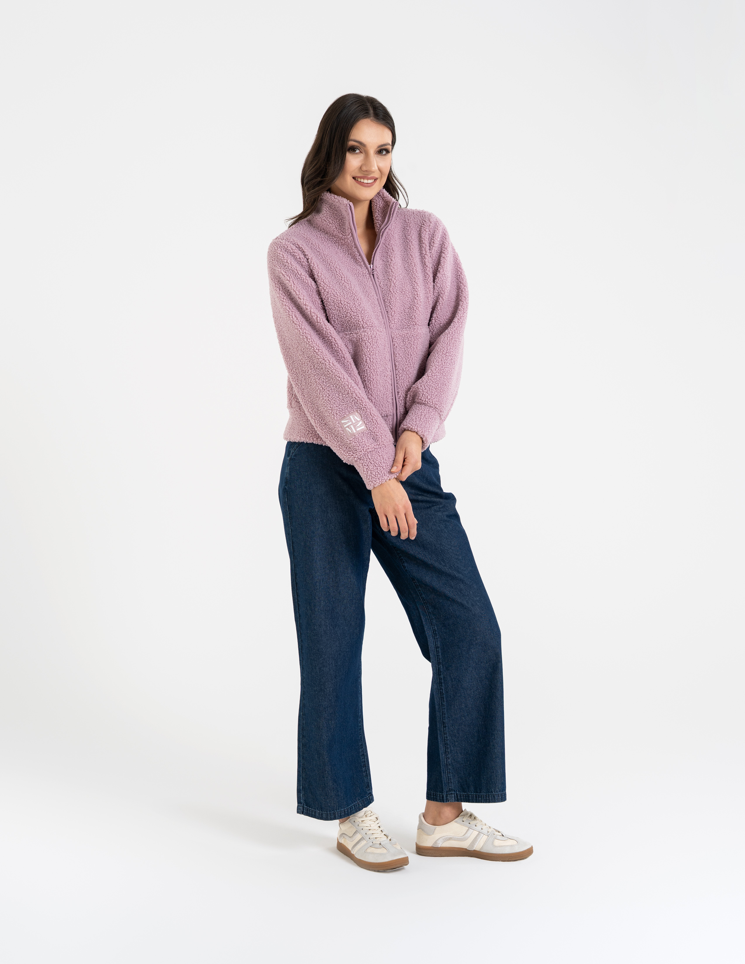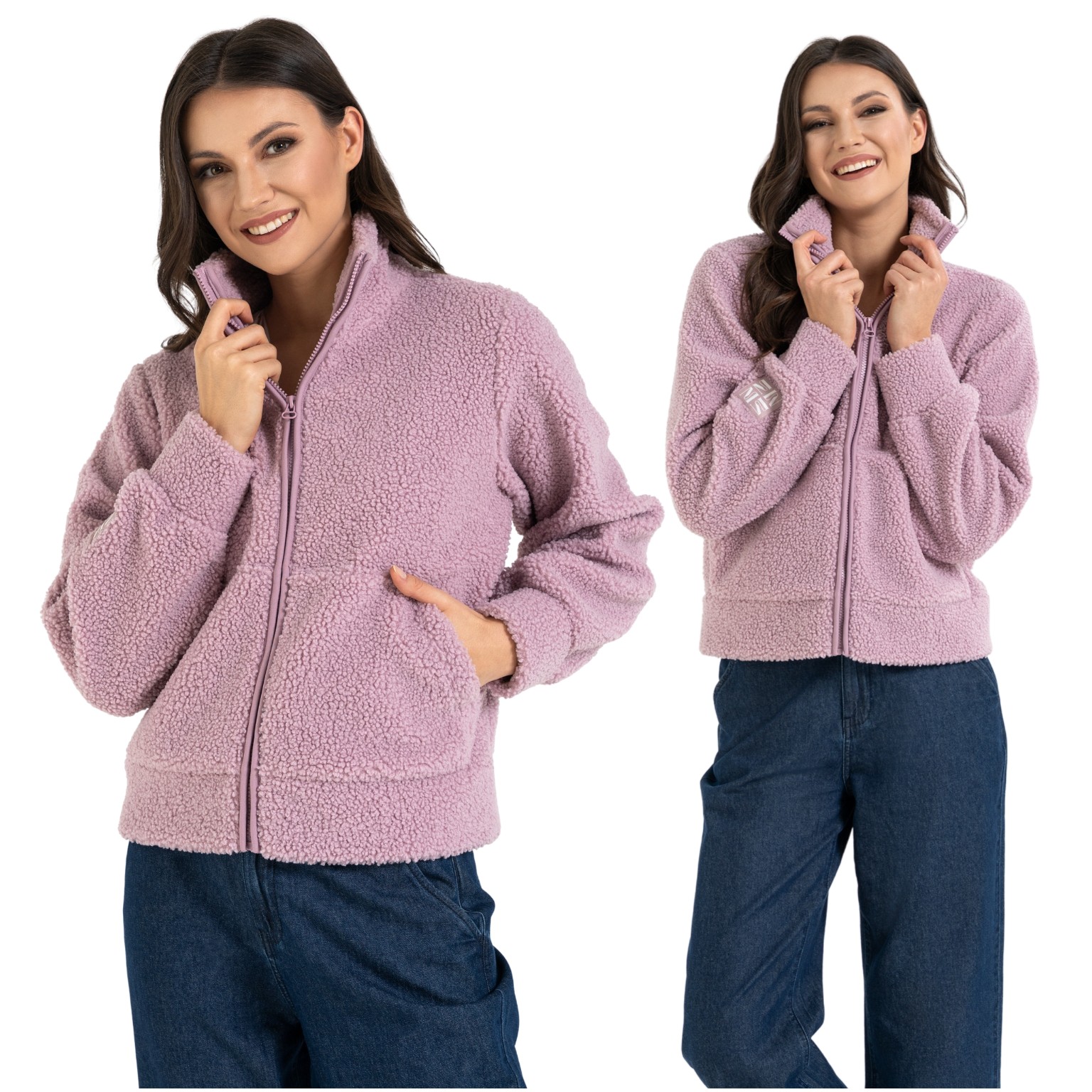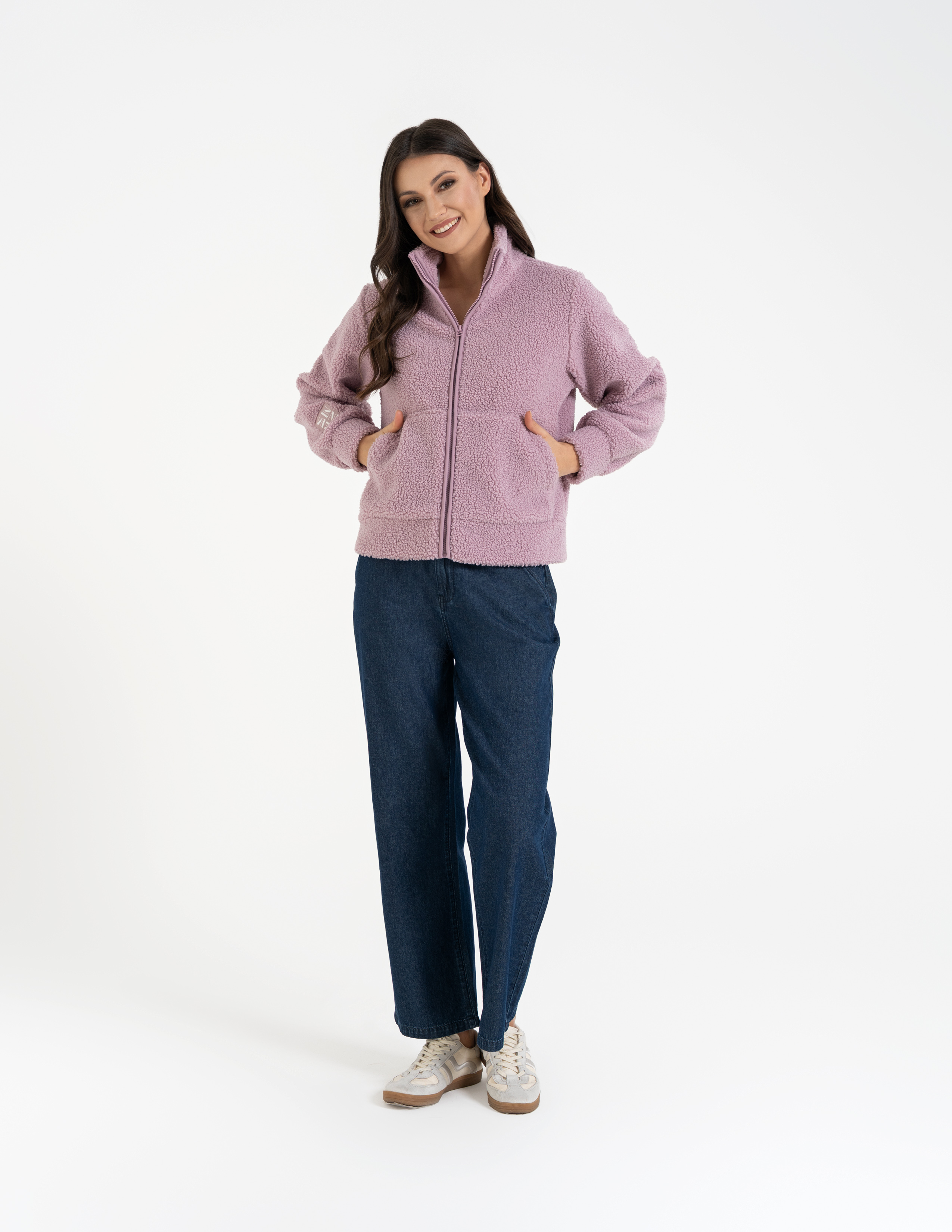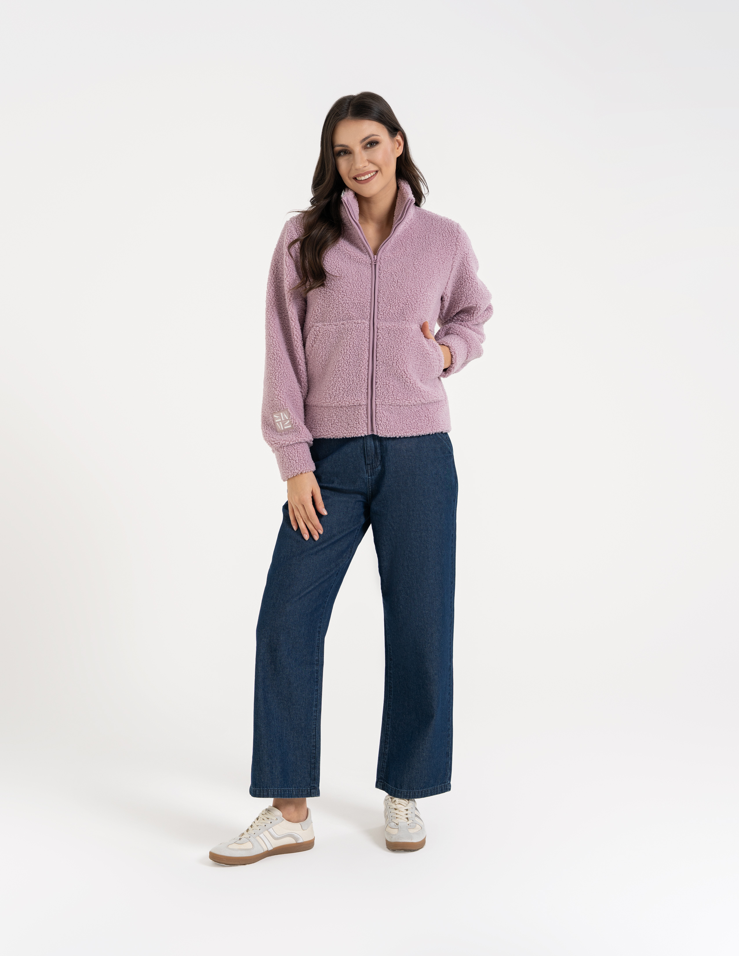 - Struktura Sherpa (Baranek): Wyjątkowo gęsty i puszysty materiał, który doskonale kumuluje ciepło, zapewniając termiczny komfort nawet w mroźne dni.