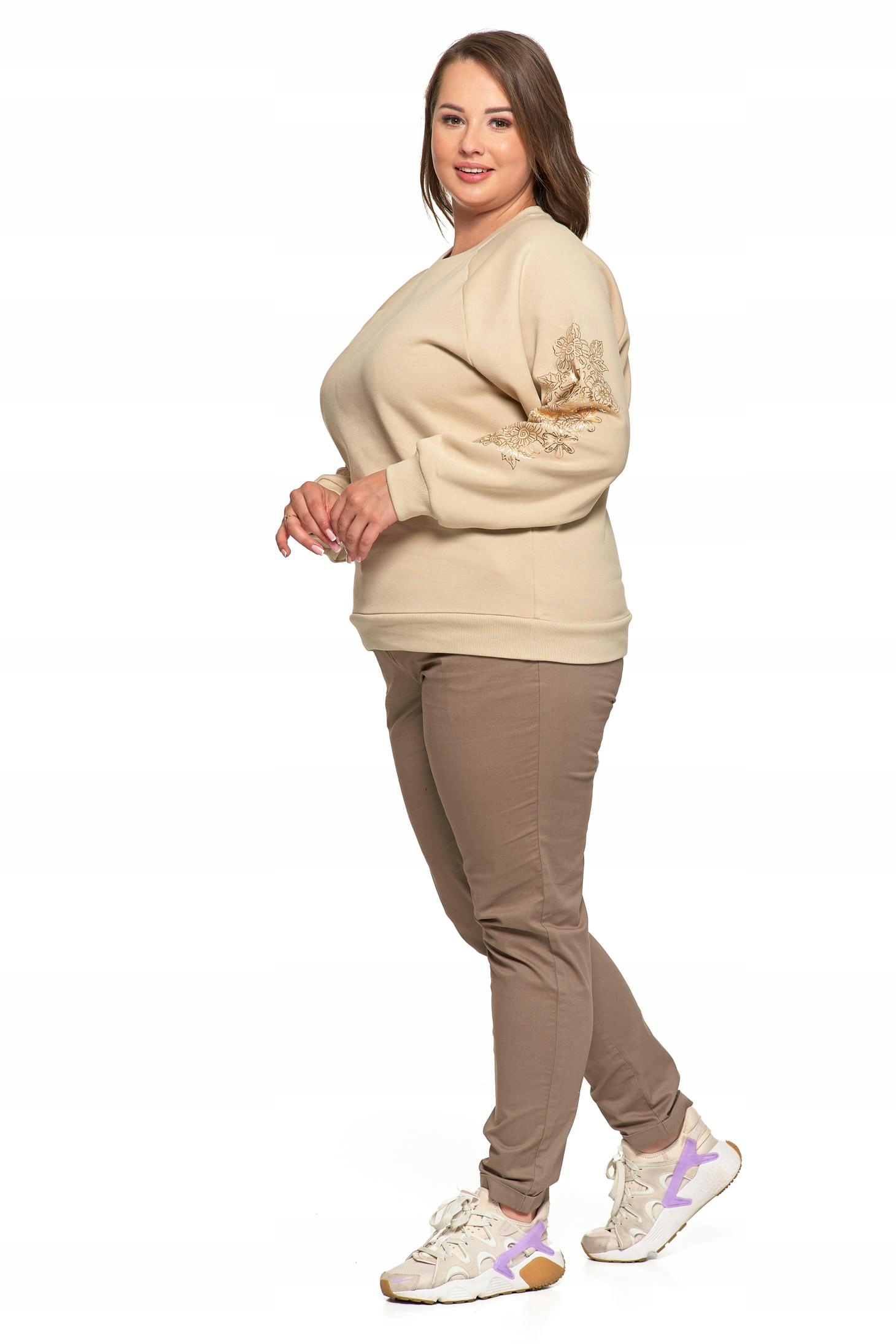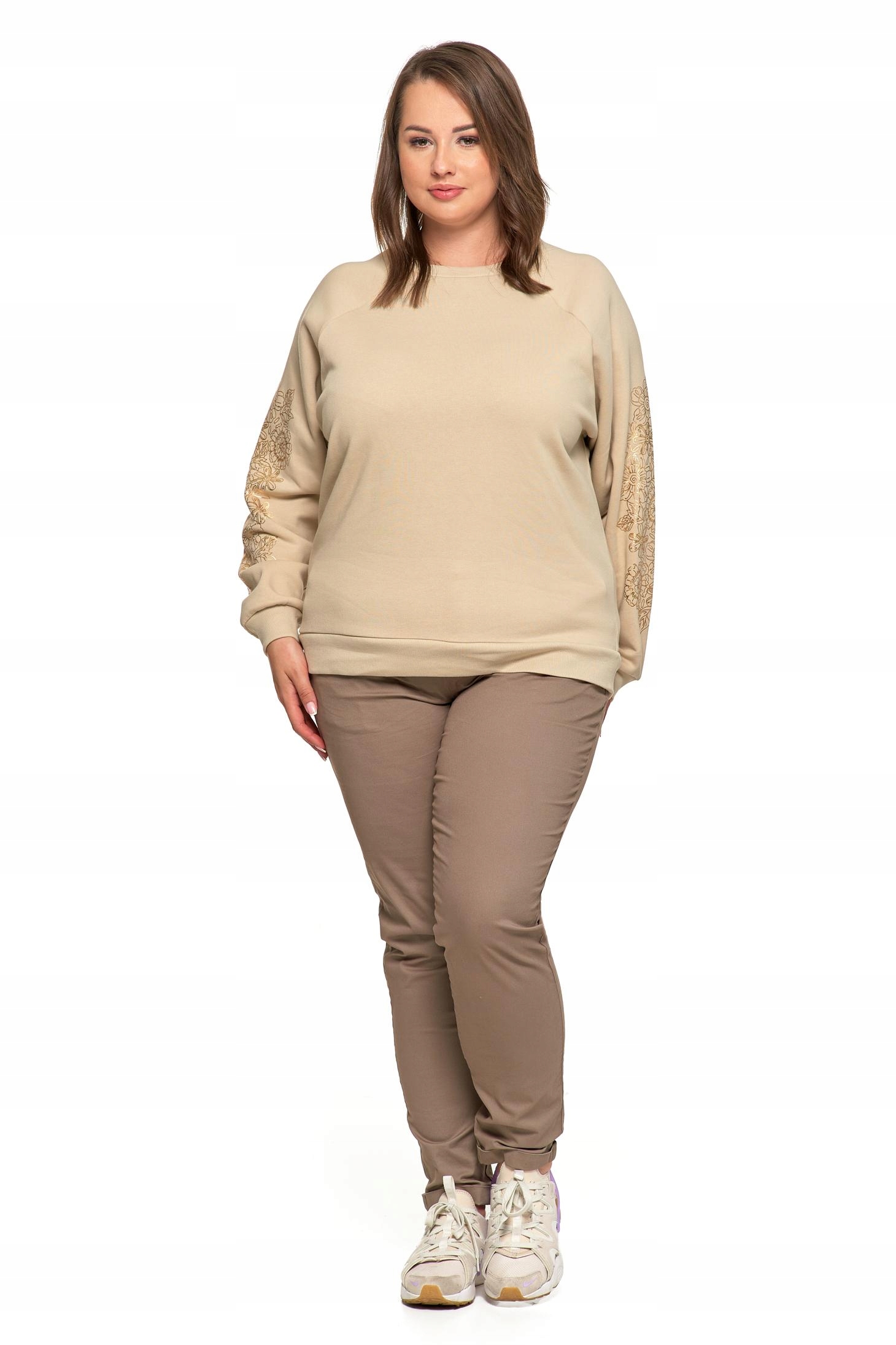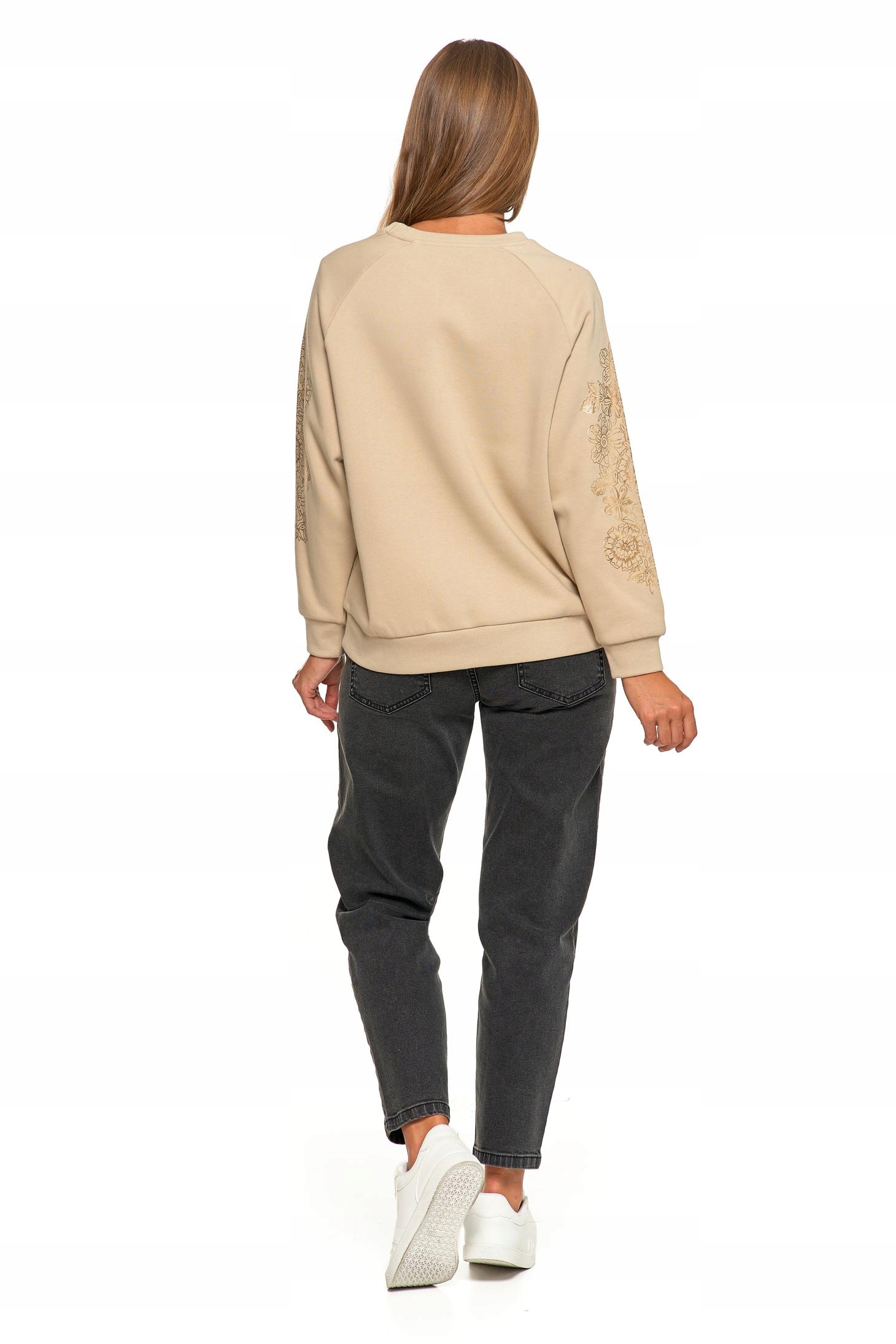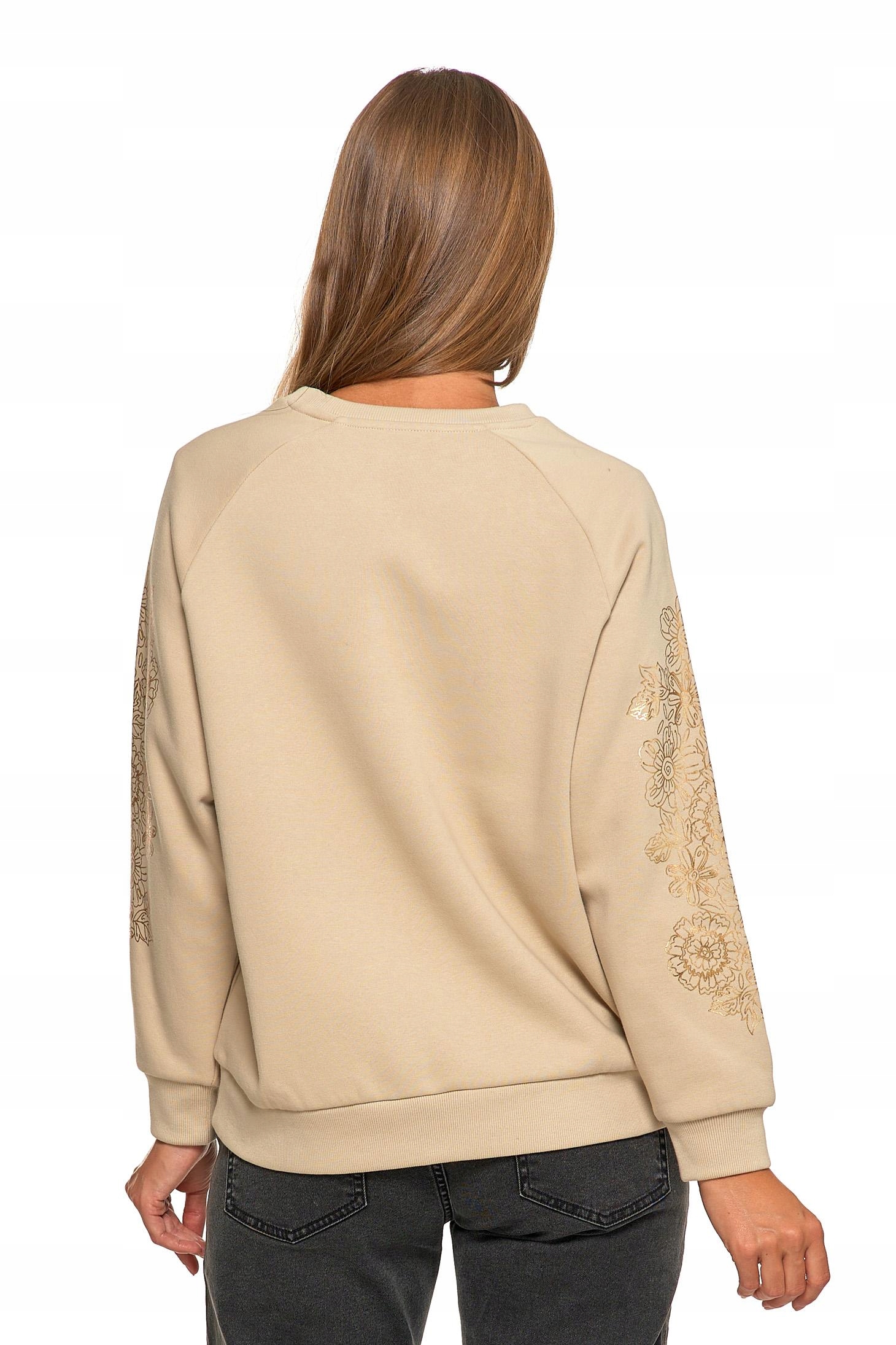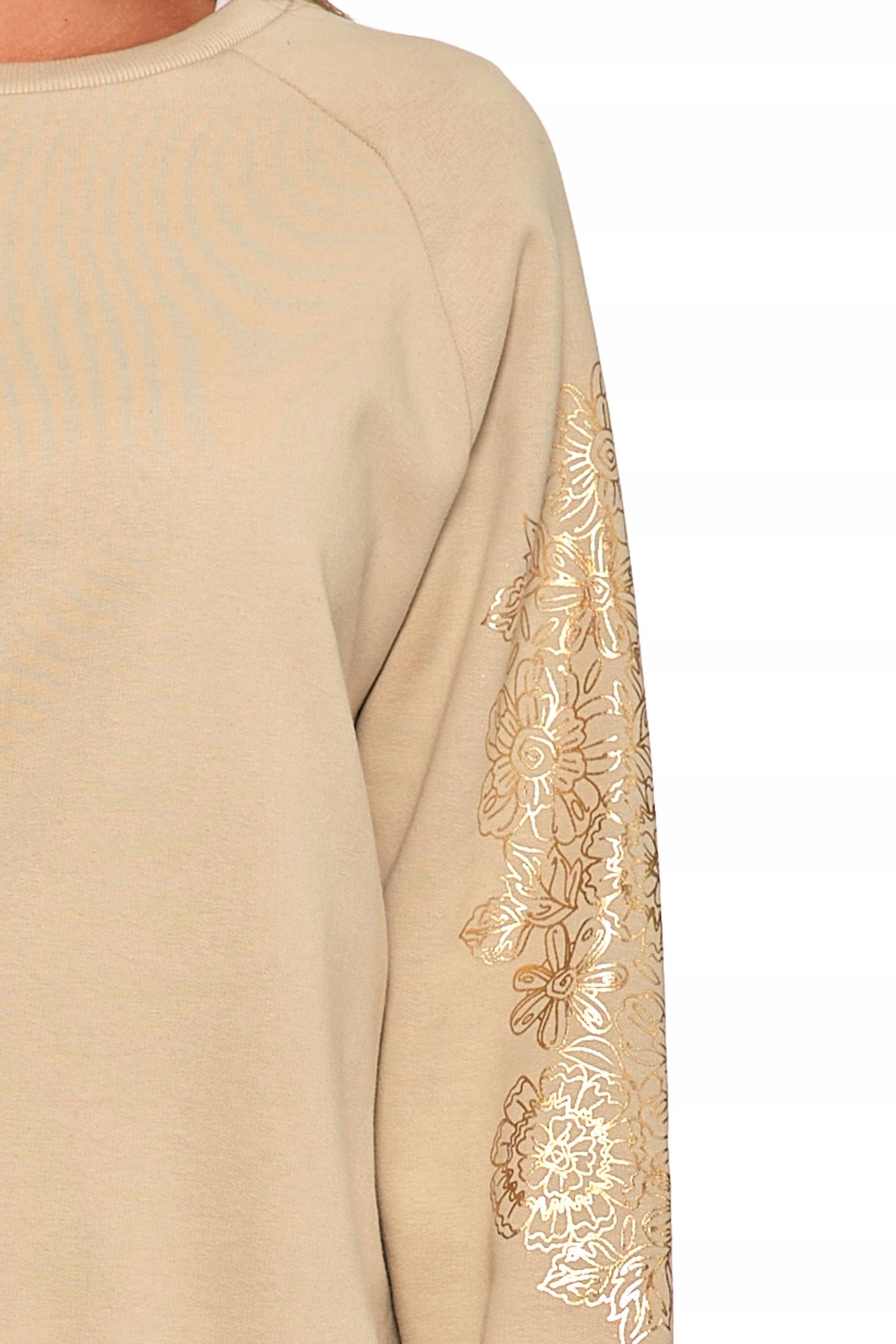 Wykonana z wysokiej jakości bawełny z domieszką, zapewnia miękkość, trwałość i elastyczność. Wewnątrz wykończona przyjemnym meszkiem, który otula ciepłem i podnosi komfort noszenia. Ozdobiona unikatowym, złotym nadrukiem w kwiatowy wzór na rękawach, który dodaje jej wyjątkowego charakteru i subtelnej elegancji.