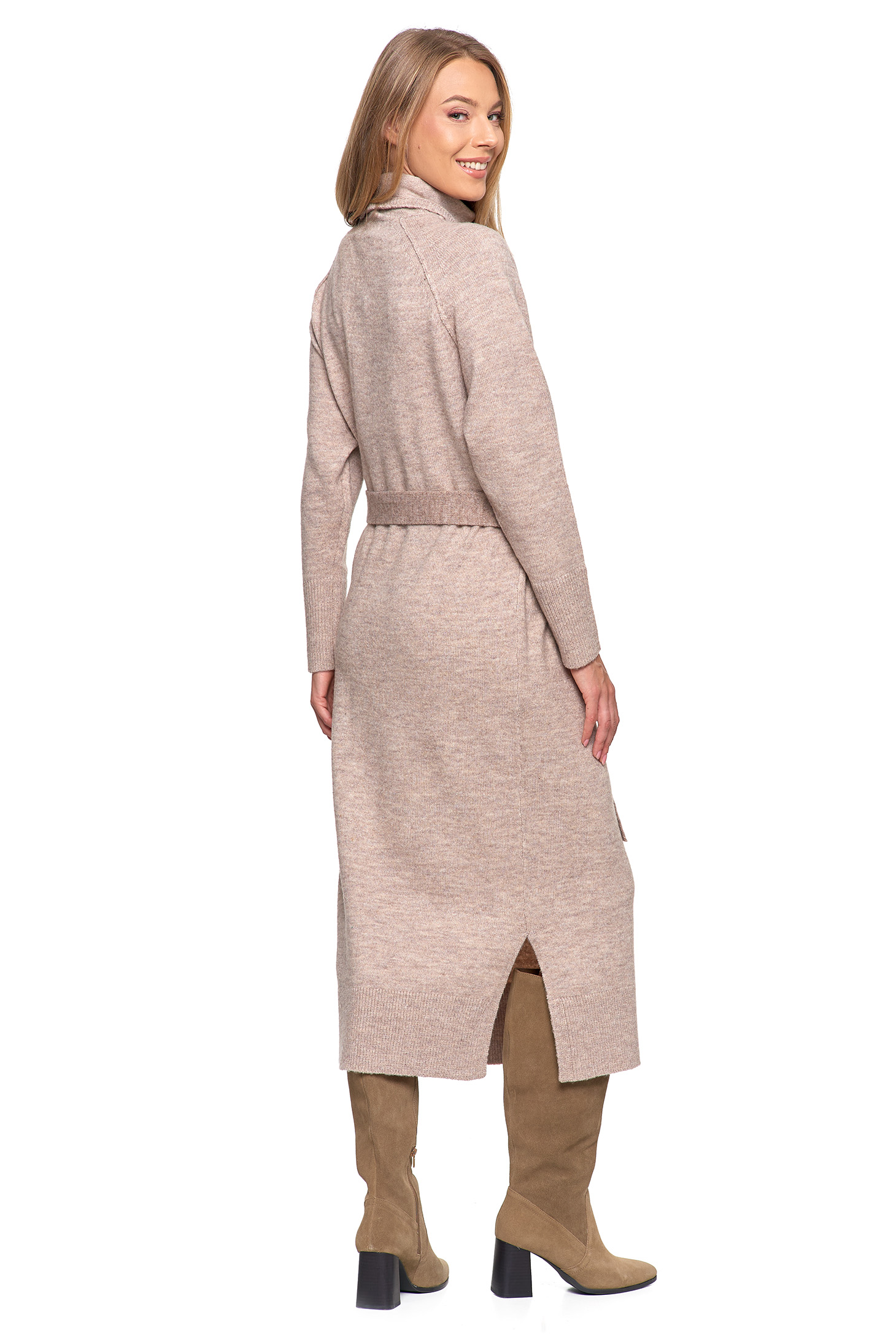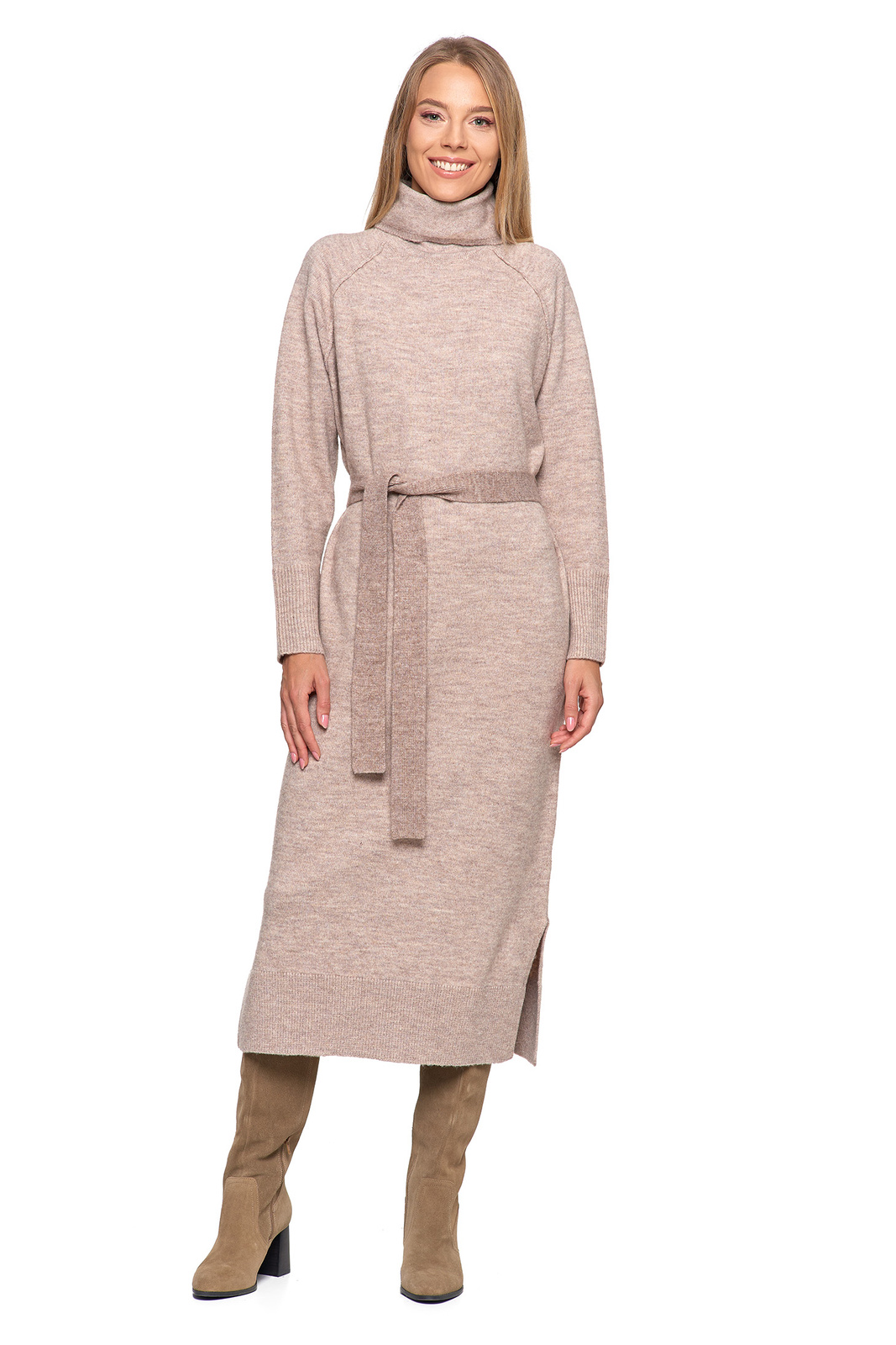 Komfort i Elegancja: Dzianinowa Sukienka Maxi z Golfem i Paskiem
