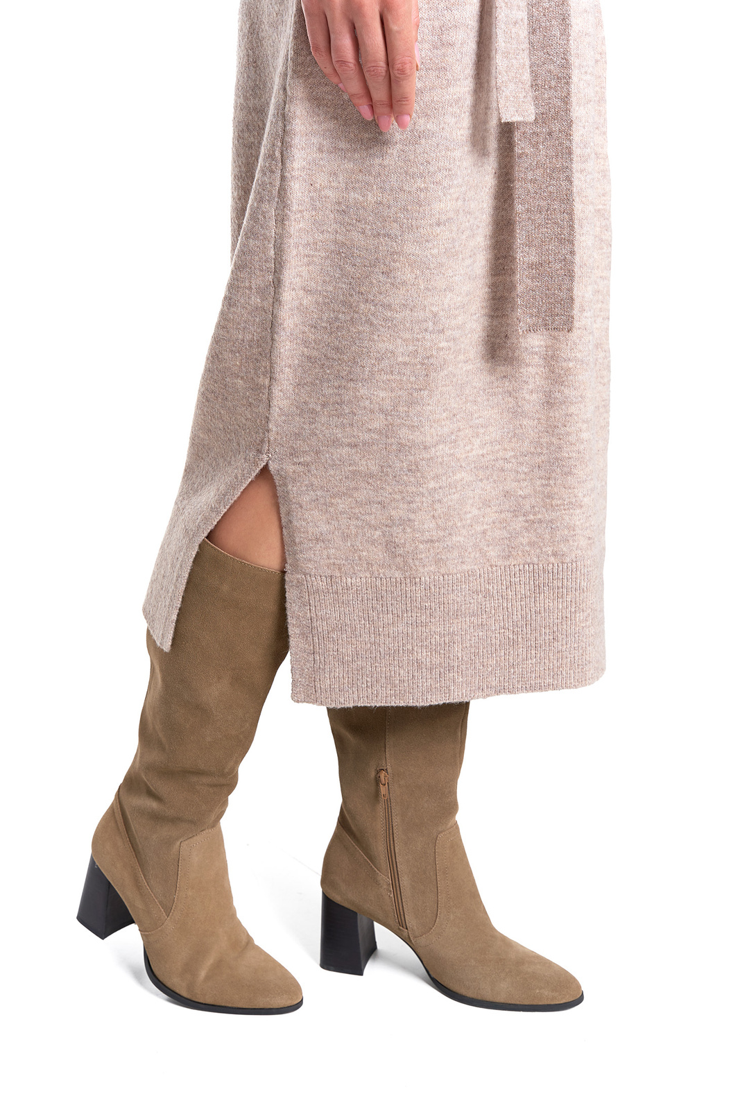 - Talia: Praktyczne wiązanie z dzianinowego paska (w komplecie), które akcentuje kobiecą sylwetkę.