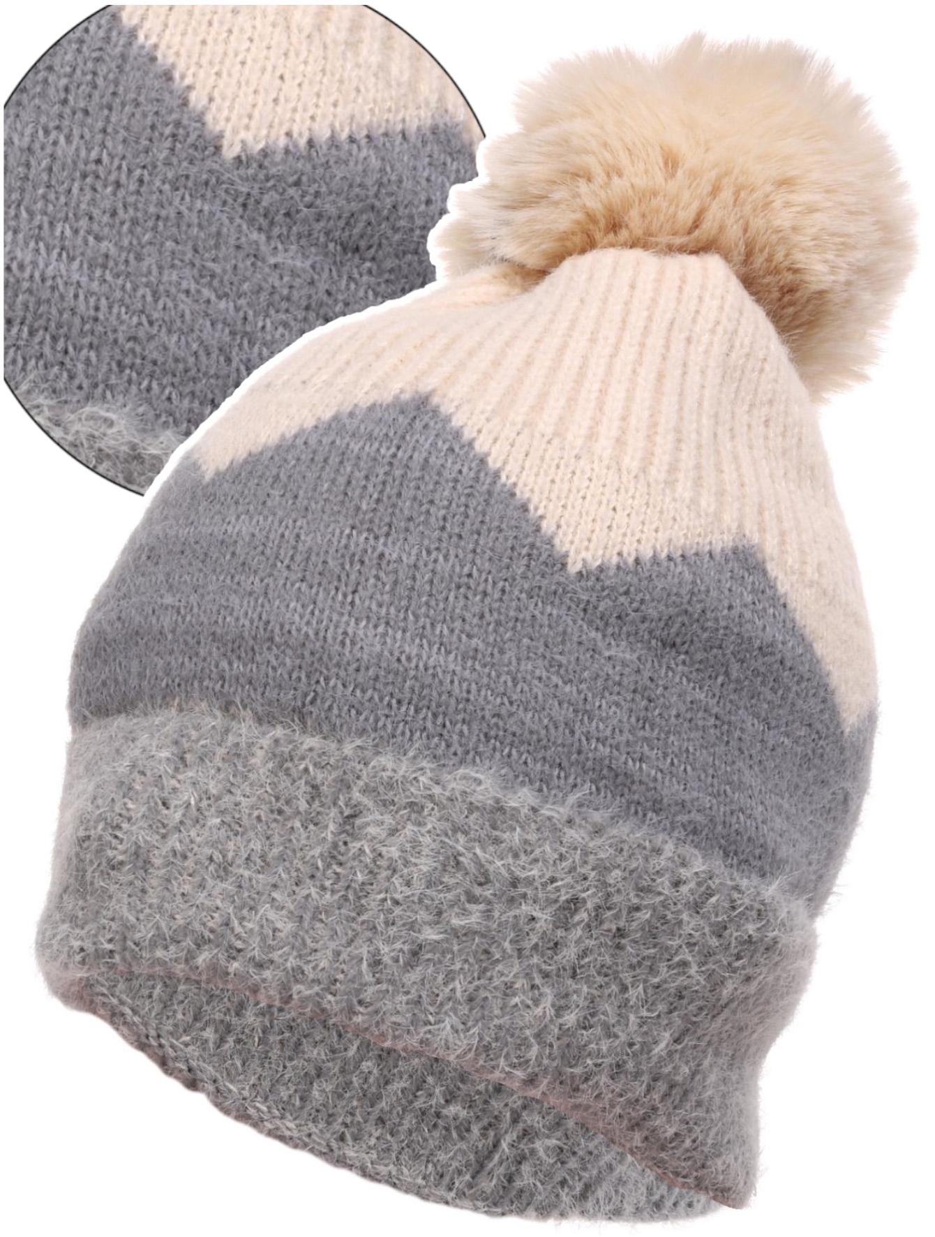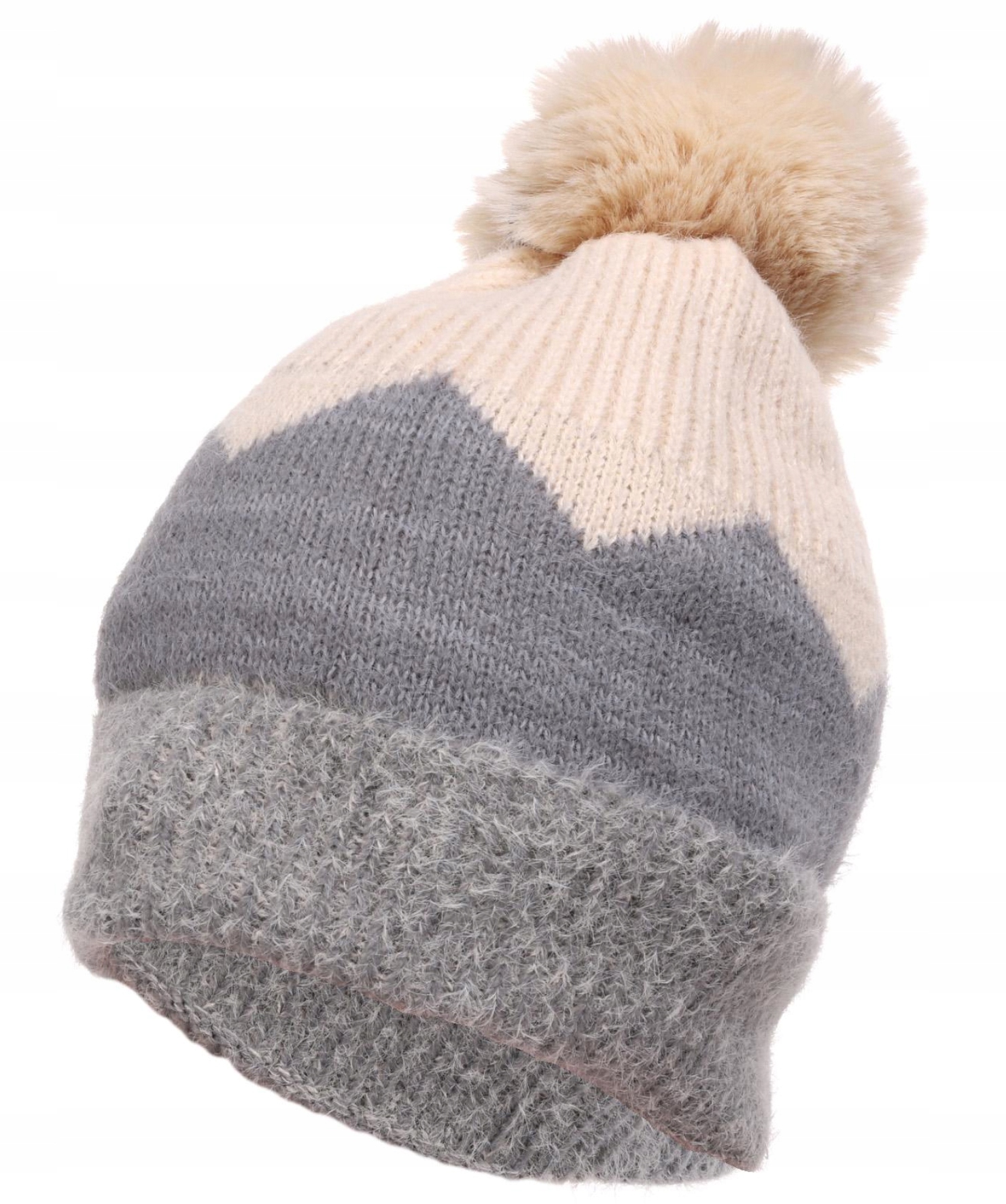 Czapka damska która ma efektowny wzór modnego i efektownego splotu dziewiarskiego. Jest ciepła i przyjemna w dotyku. Podszewka czapki jest wykonana z materiału typu polar, który skutecznie ogrzeje w chłodniejsze dni, ale także charakteryzuje się wyjątkową miękkością, zapewniając maksymalny poziom komfortu.Dodatkowym zdobieniem jest wiecznie modny, duży puszysty pompon.