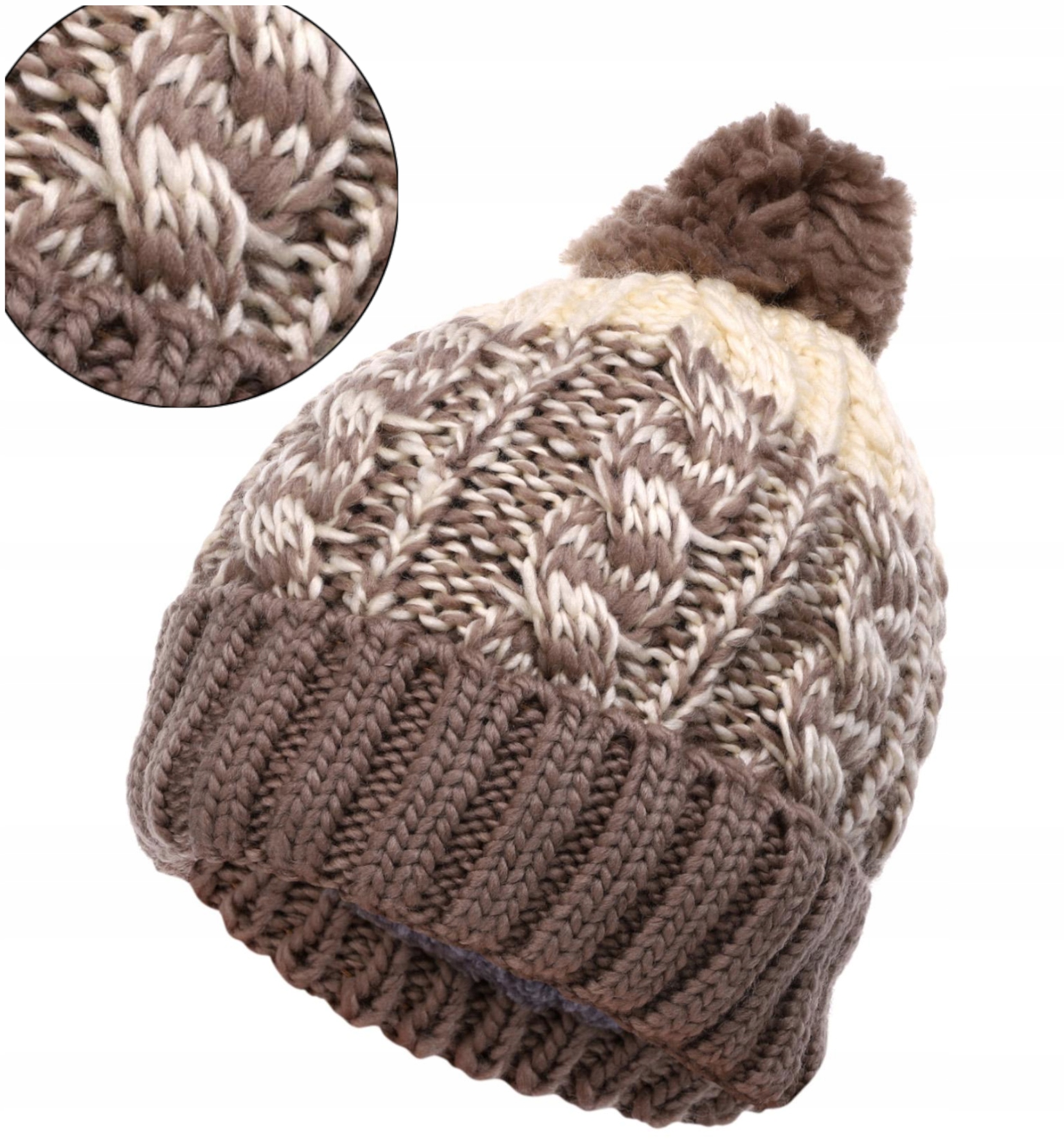 Czapka damska która ma efektowny wzór modnego i efektownego splotu dziewiarskiego. Jest ciepła i przyjemna w dotyku. Podszewka czapki jest wykonana z materiału typu polar, który skutecznie ogrzeje w chłodniejsze dni, ale także charakteryzuje się wyjątkową miękkością, zapewniając maksymalny poziom komfortu.Dodatkowym zdobieniem jest wiecznie modny, duży puszysty pompon.