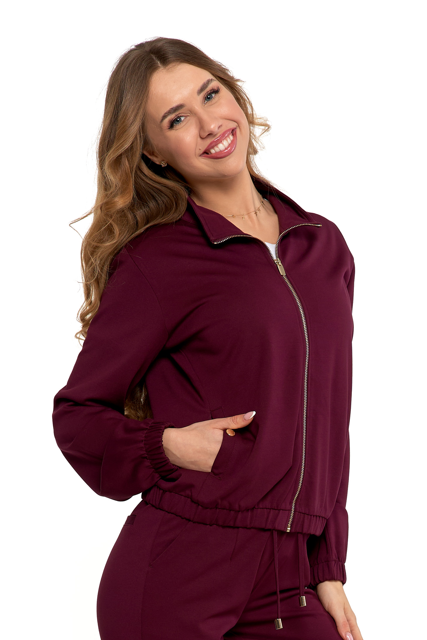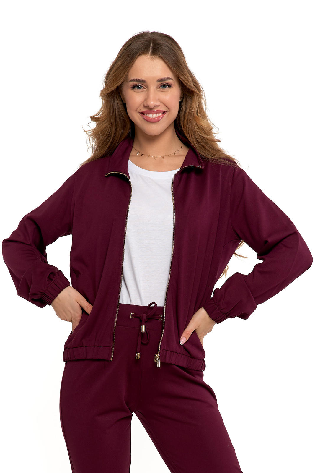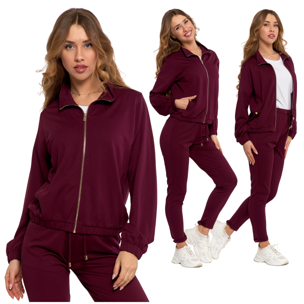 Komplet damski wykonany z miękkiej dzianiny wiskozowej z domieszkami to idealne połączenie komfortu, funkcjonalności i kobiecego stylu. Składa się z bluzy dresowej zapinanej oraz spodni dresowych o zwężanej nogawce, dzięki czemu świetnie sprawdzi się zarówno w domu, jak i podczas codziennych aktywności na mieście.