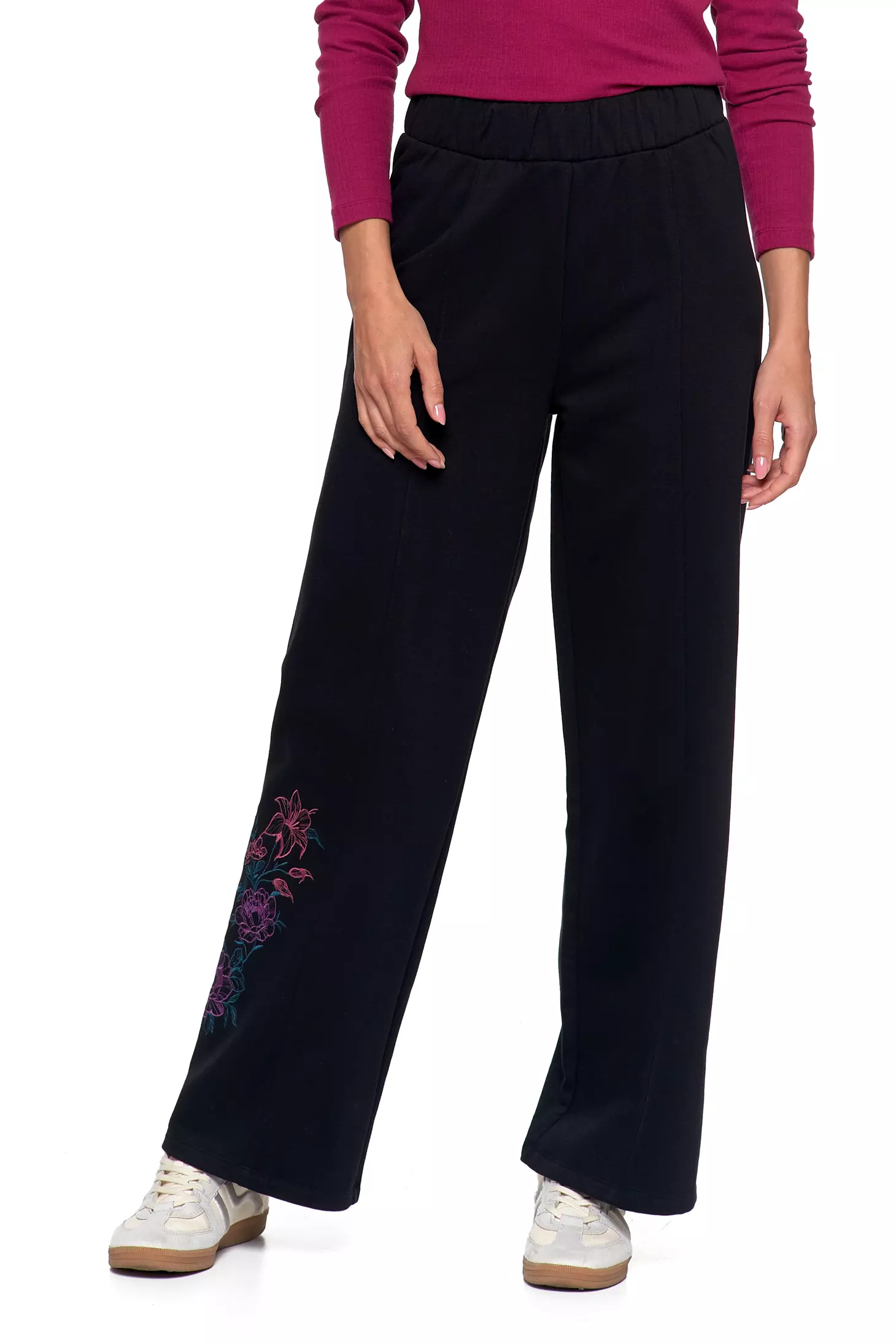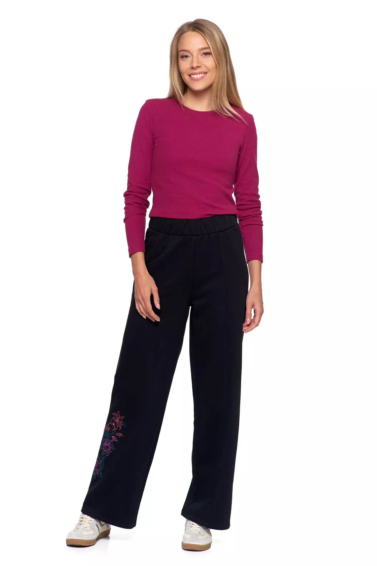 Krój: Modny fason wide leg (szeroka nogawka), nadający stylowego i swobodnego charakteru.