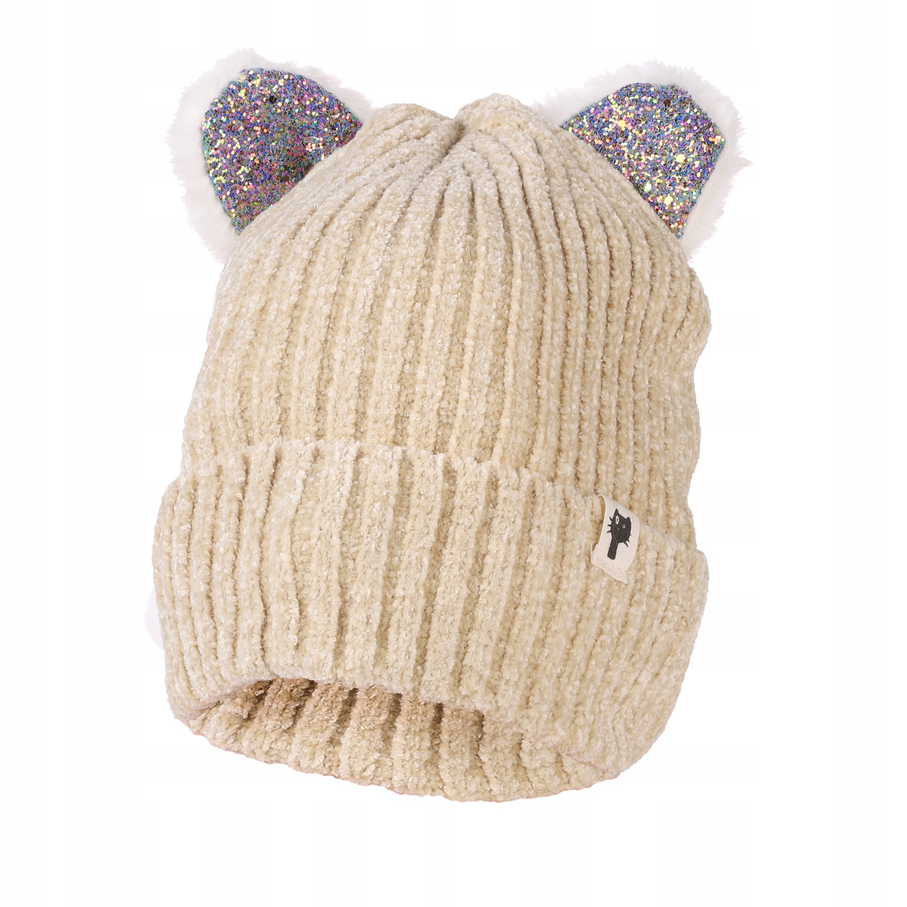 Czapka dziecięca z brokatowymi uszkami kota, wykonana z przyjemnego w dotyku, wysokogatunkowego materiału, który skutecznie ogrzeje w chłodniejsze dni. Dzianina o ciekawym splocie jest rozciągliwa i świetnie dopasowuje się do kształtu głowy. Z przodu czapka posiada naszywkę z kotkiem. Model dostępny jest w atrakcyjnych kolorach. Będzie znakomitym dopełnieniem jesienno-zimowych stylizacji.