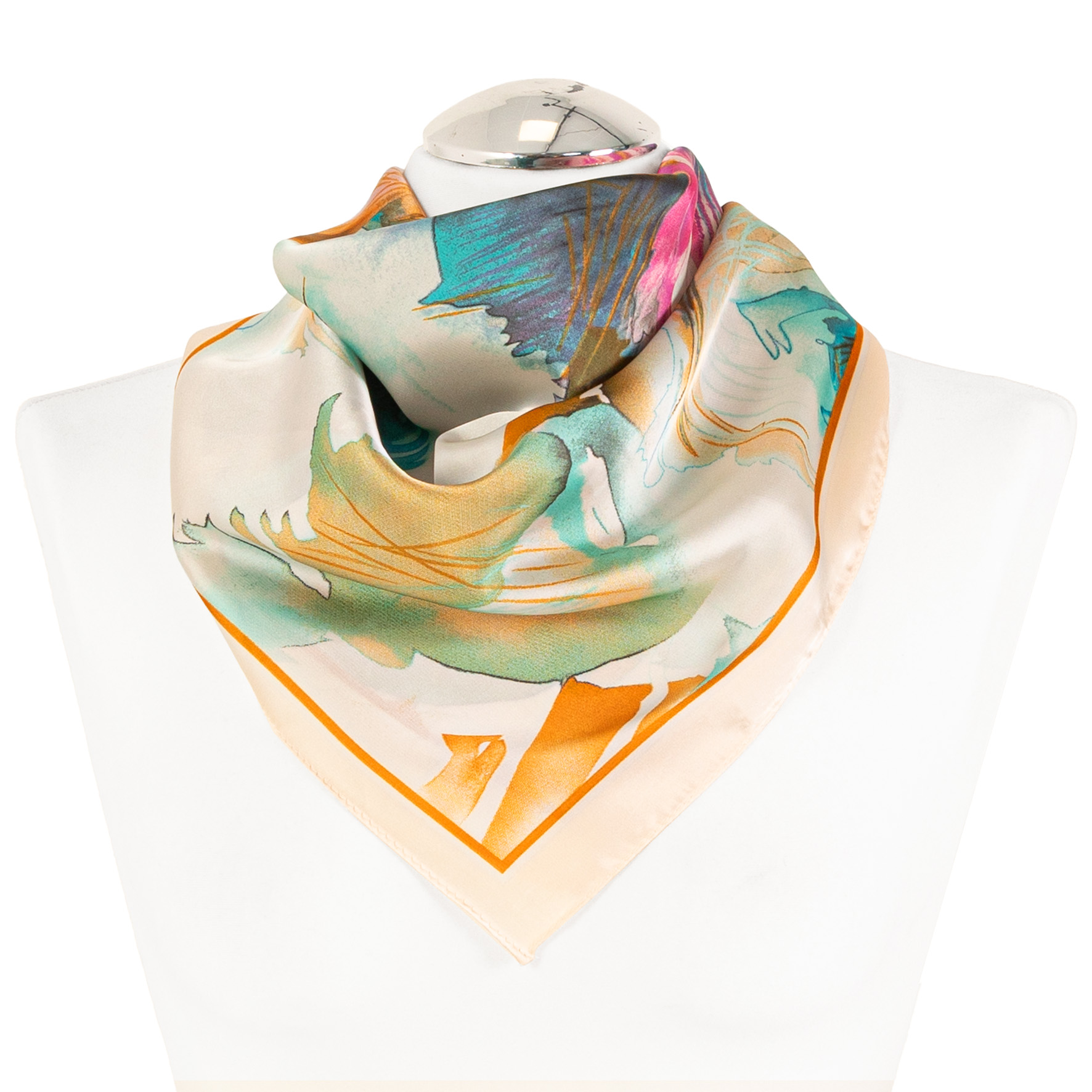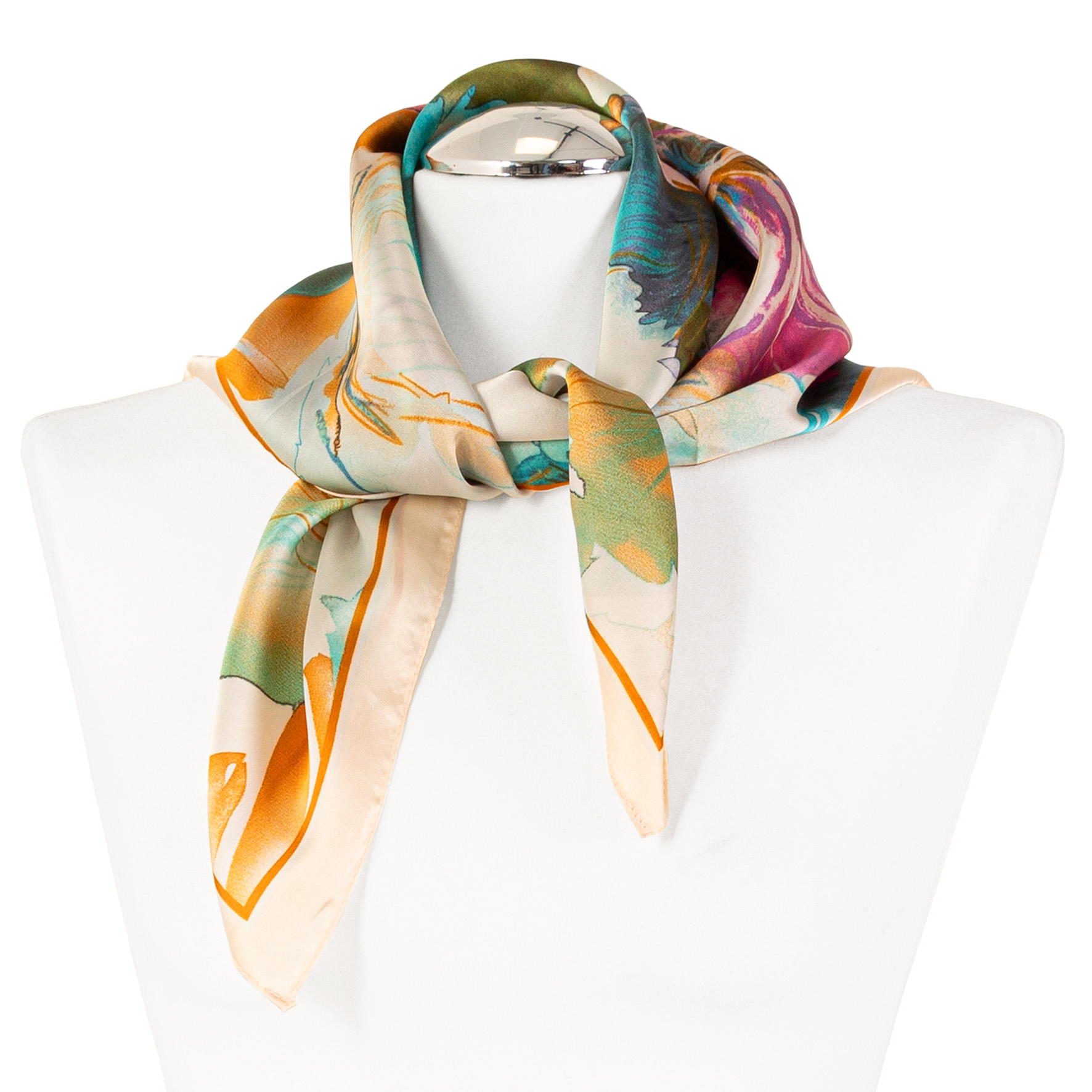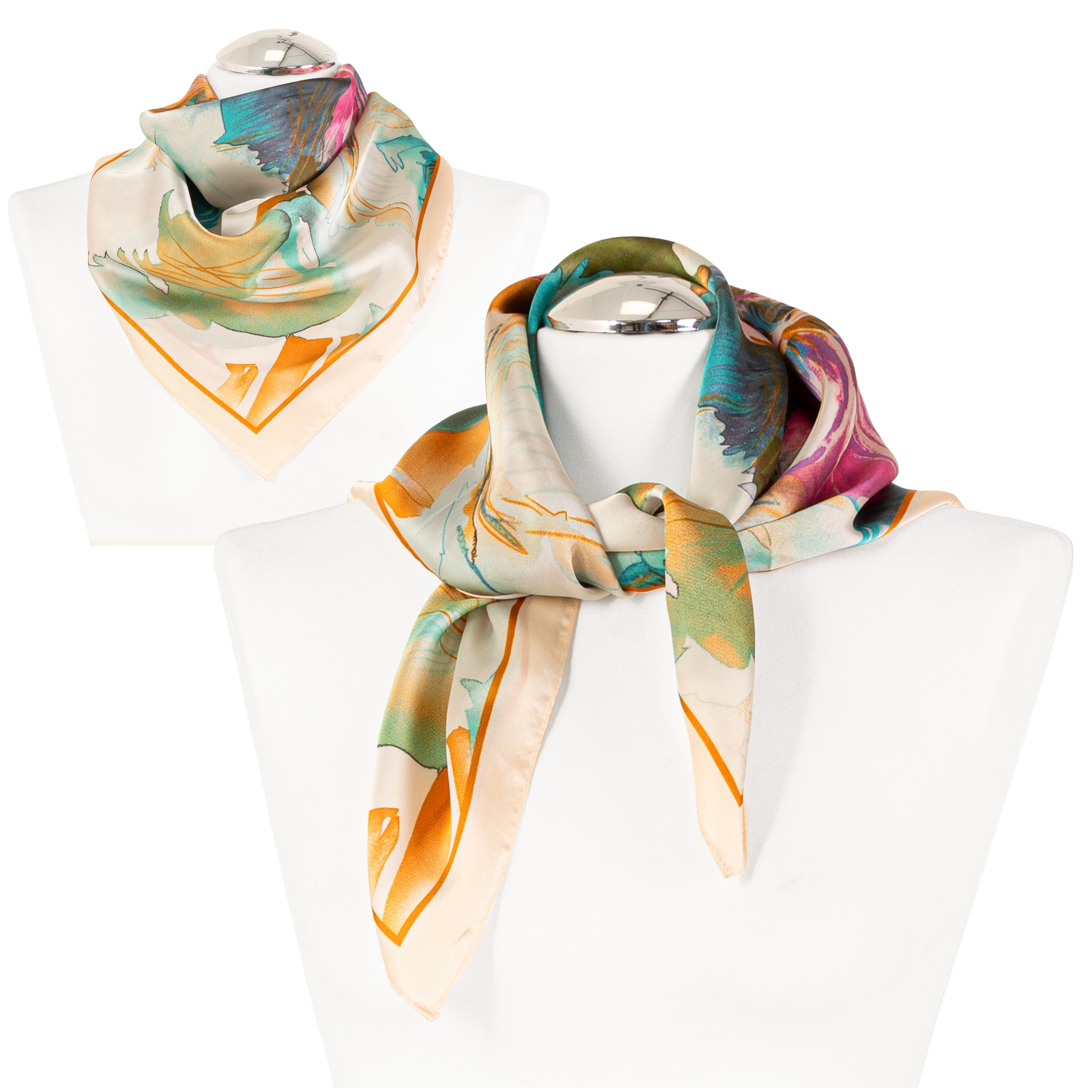 Klasyczny Format 68 × 68 cm: Kwadratowy kształt o optymalnych wymiarach daje mnóstwo możliwości stylizacji – od klasycznego wiązania na szyi, po ozdobę torebki lub modny akcent we włosach.