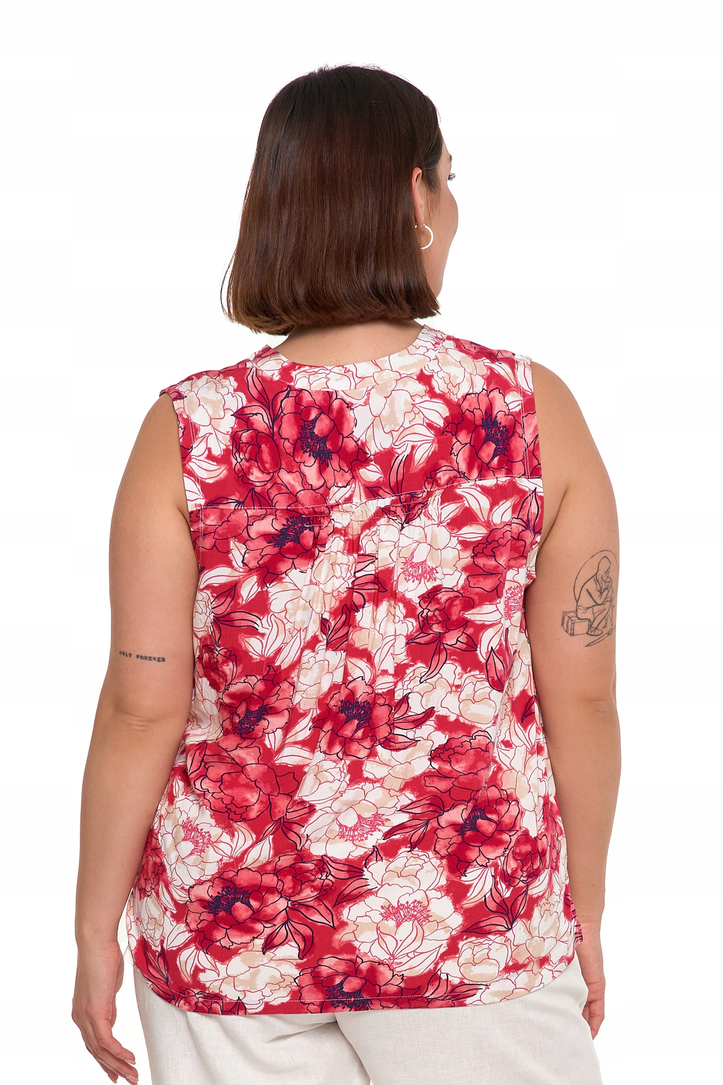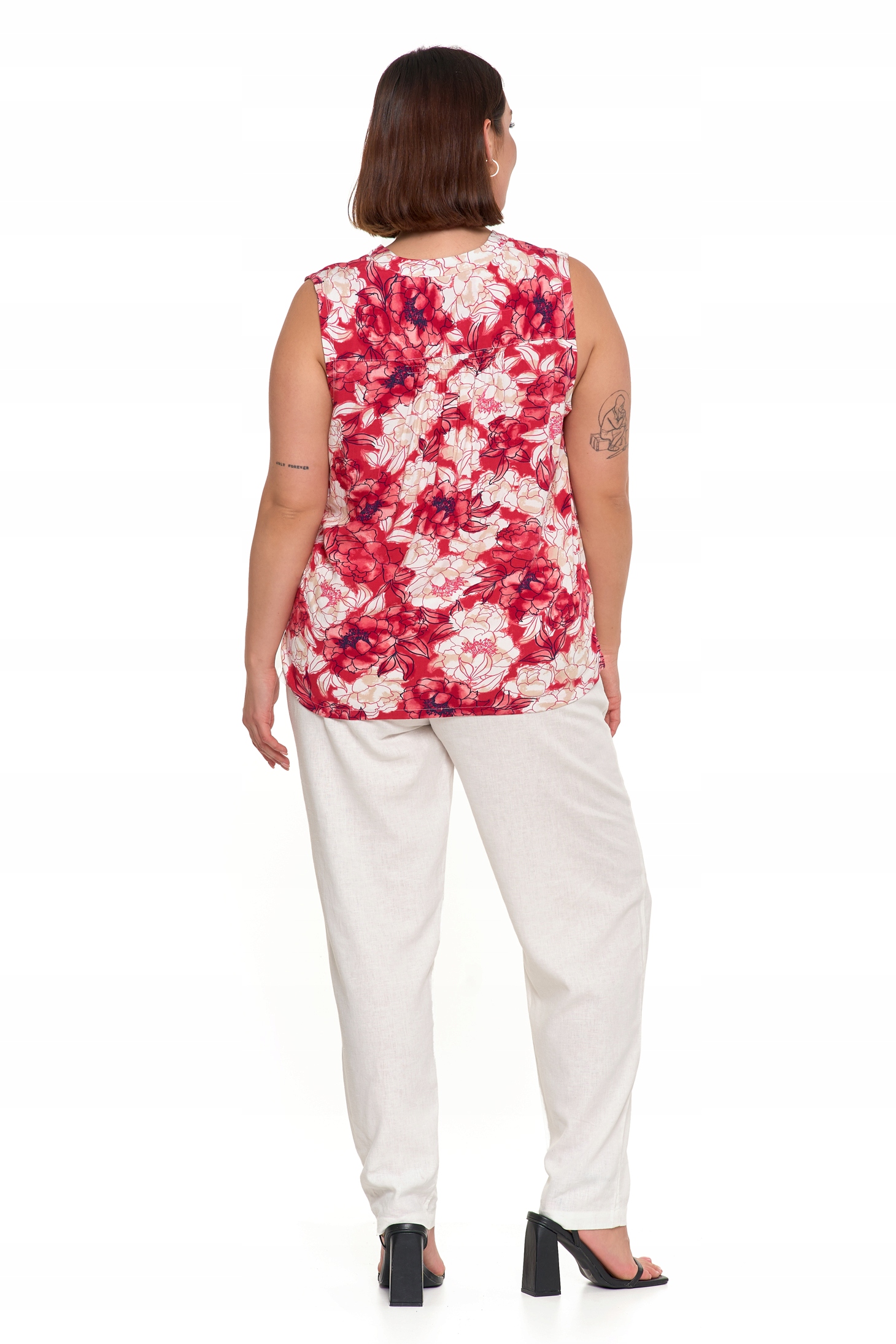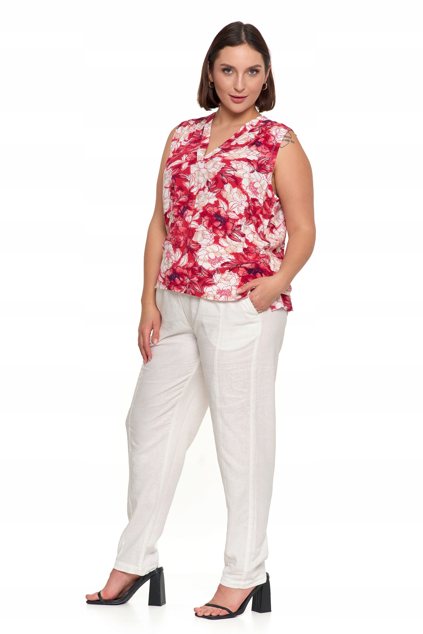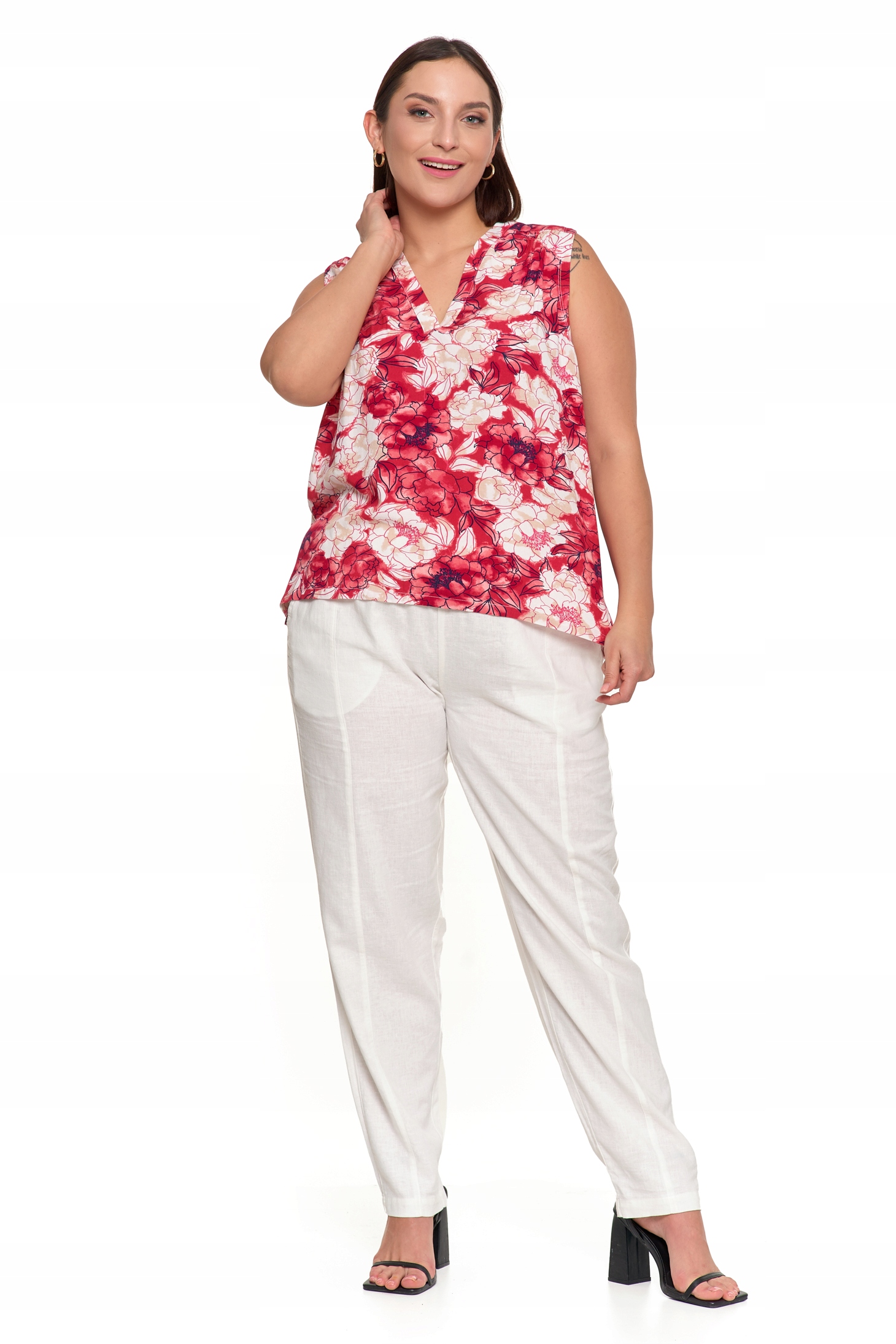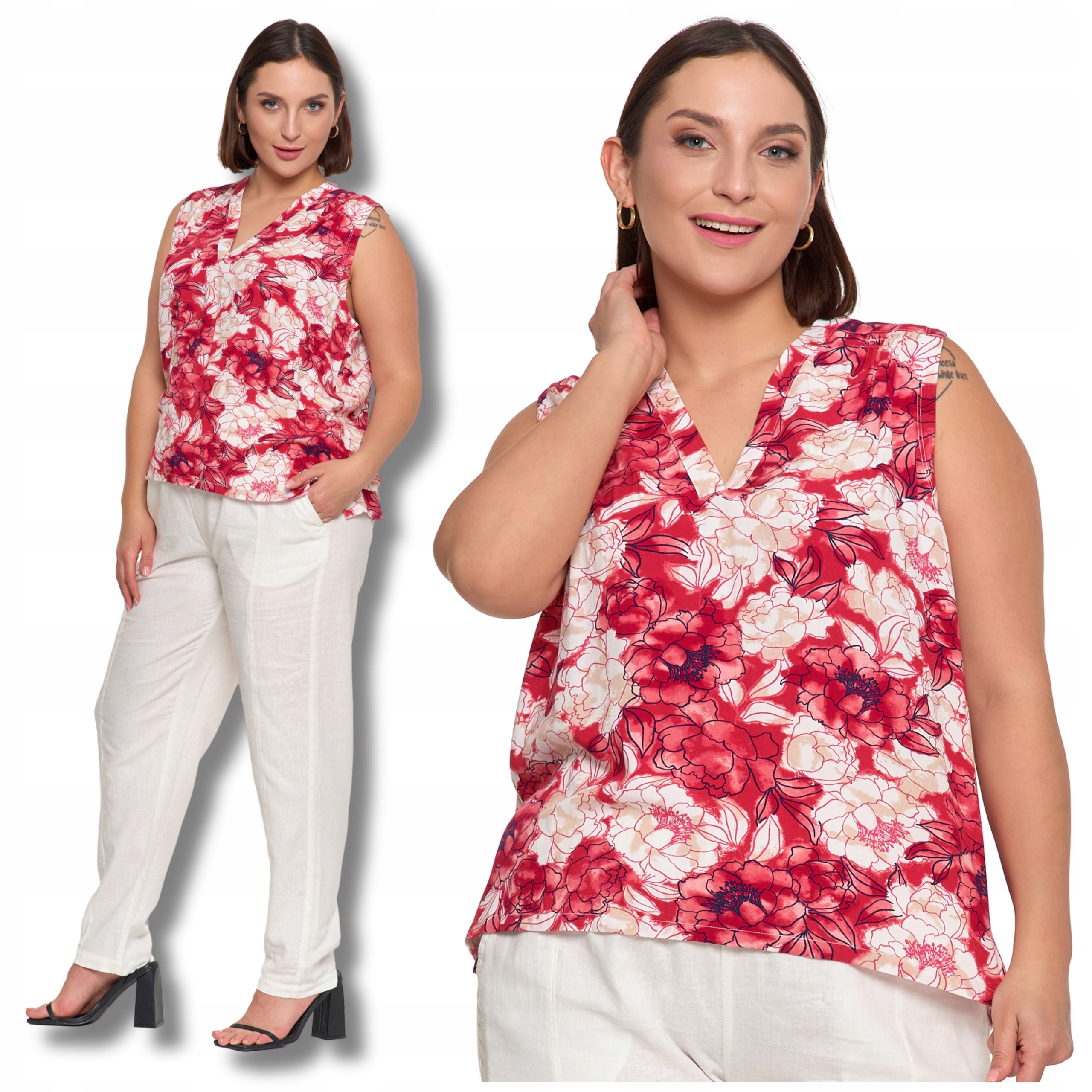 Ta wzorzysta bluzka bez rękawów to doskonały wybór na ciepłe dni, łączący komfort i modny wygląd. Wykonana z lekkiej, przewiewnej wiskozy, delikatnie otula skórę i zapewnia uczucie świeżości przez cały dzień. Luźny fason subtelnie podkreśla sylwetkę, gwarantując swobodę ruchów i wygodę noszenia.