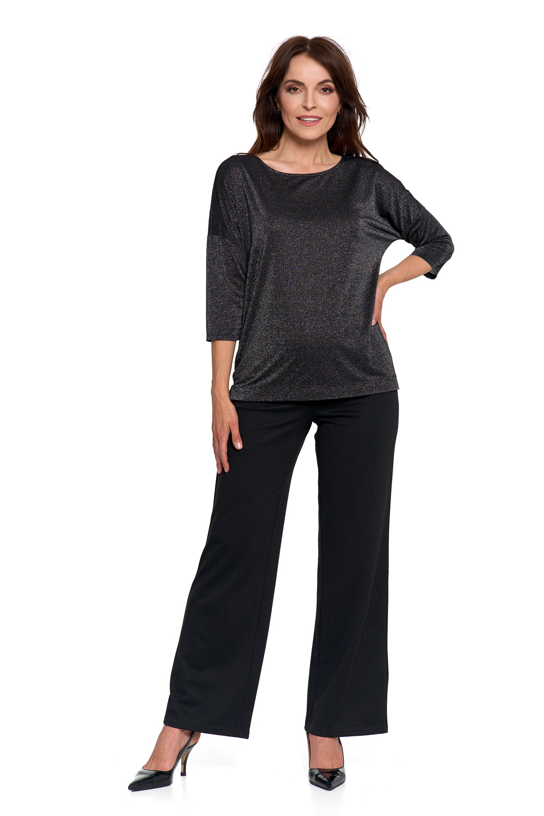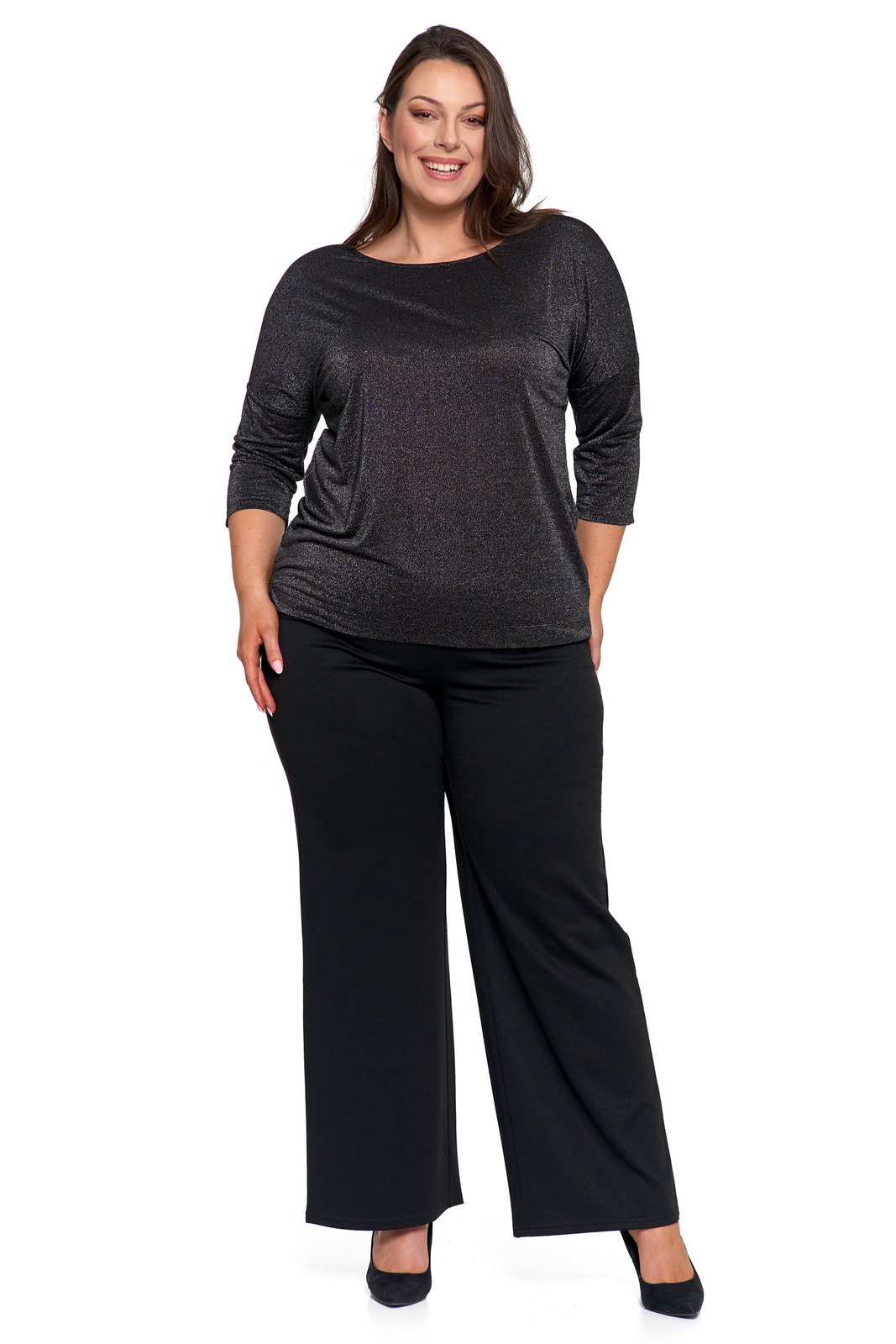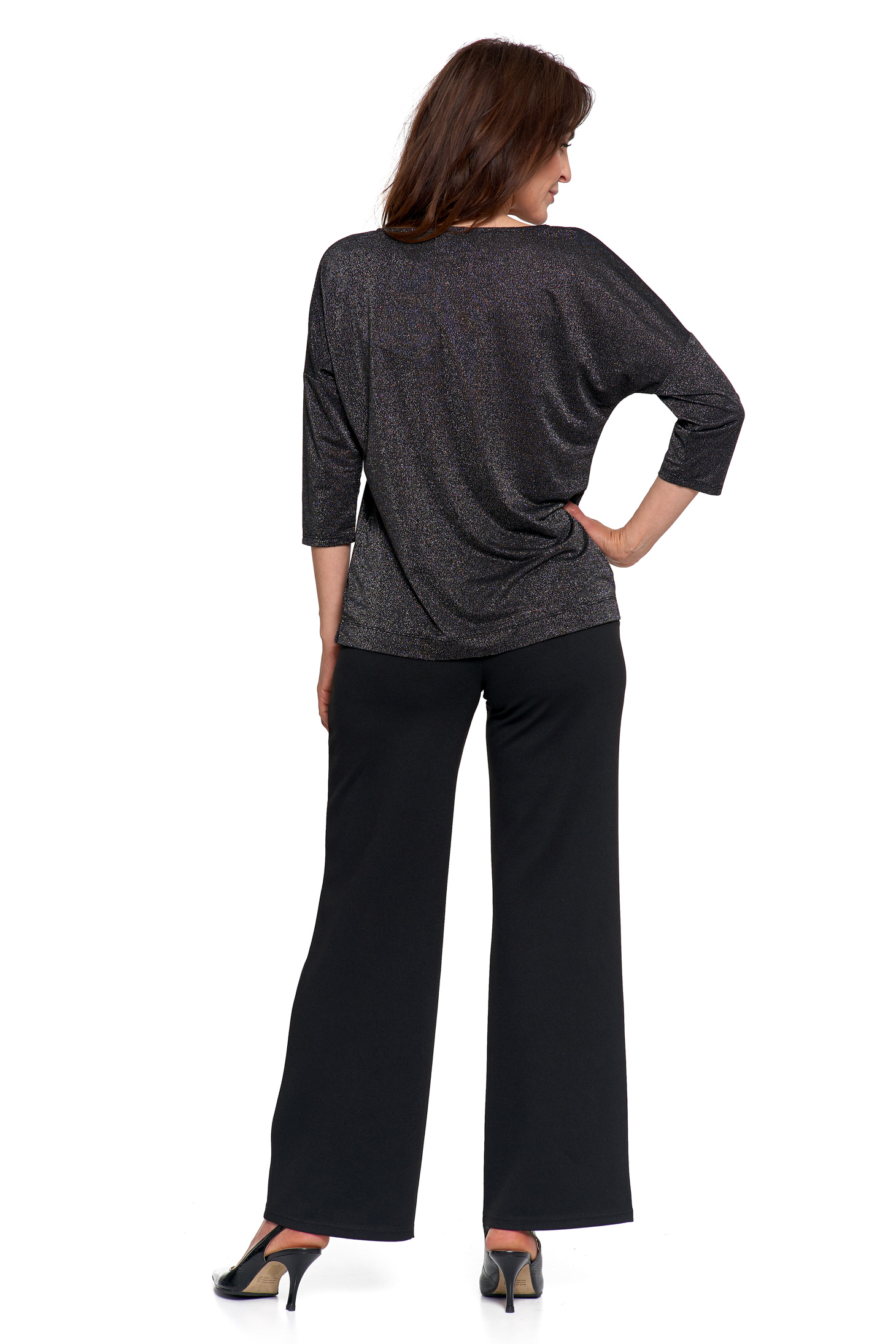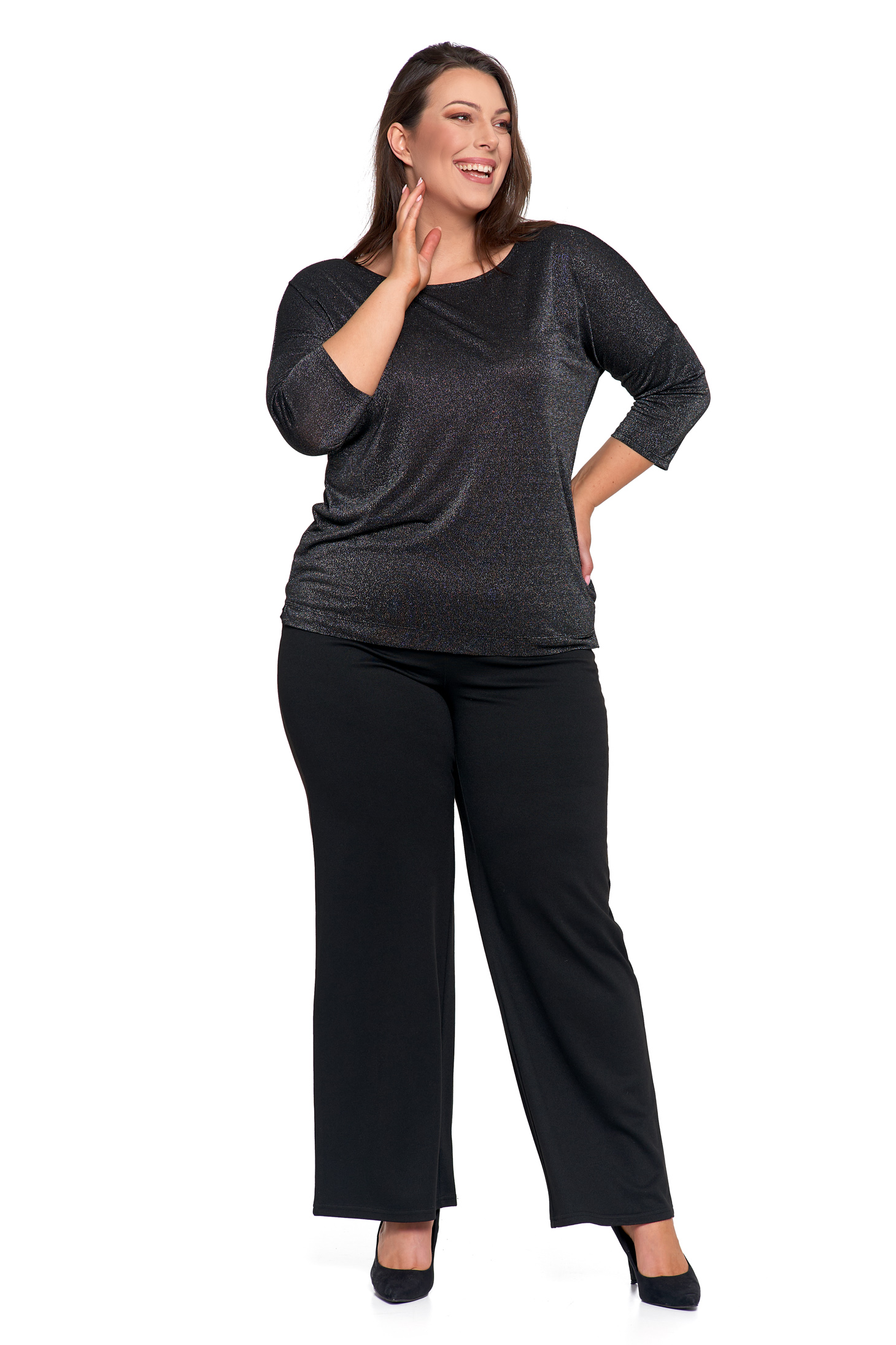Ta bluzka to idealny wybór, gdy szukasz połączenia swobodnego komfortu z odrobiną blasku. Wykonana z miękkiej dzianiny z domieszką metalizowanej przędzy, delikatnie mieni się w świetle, nadając Twojej stylizacji nowoczesnego charakteru.
