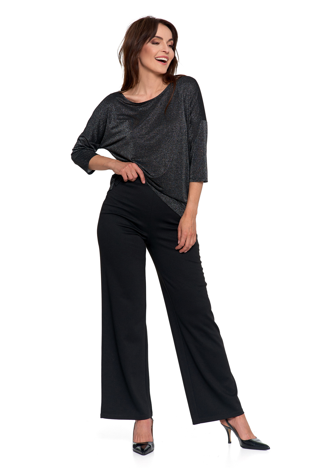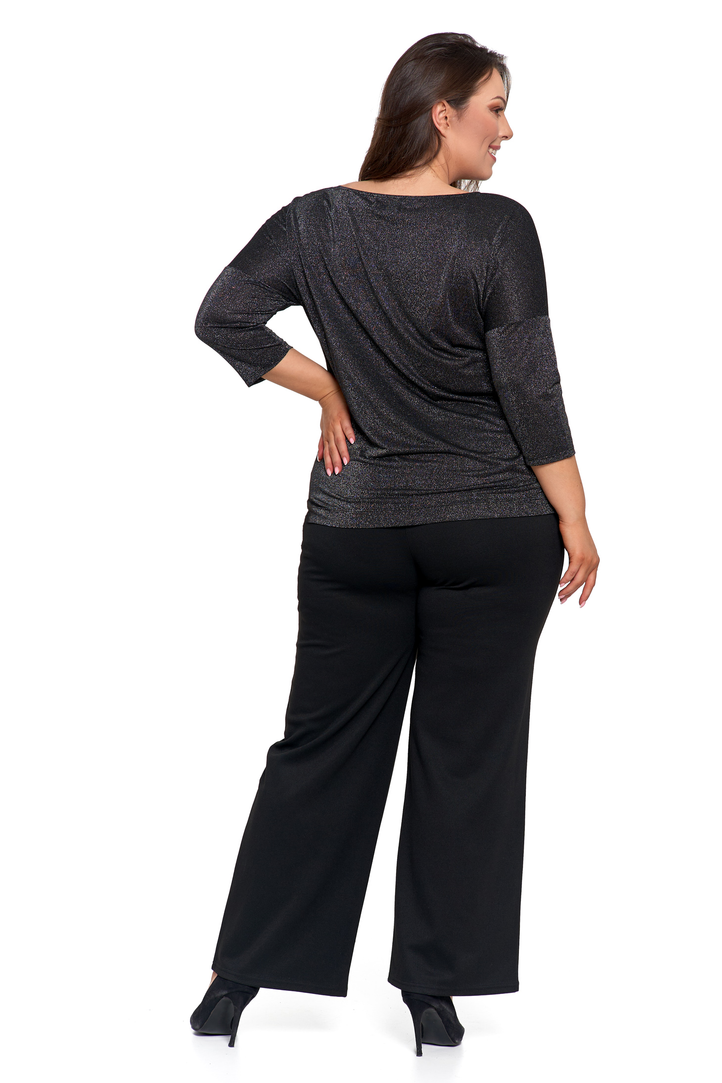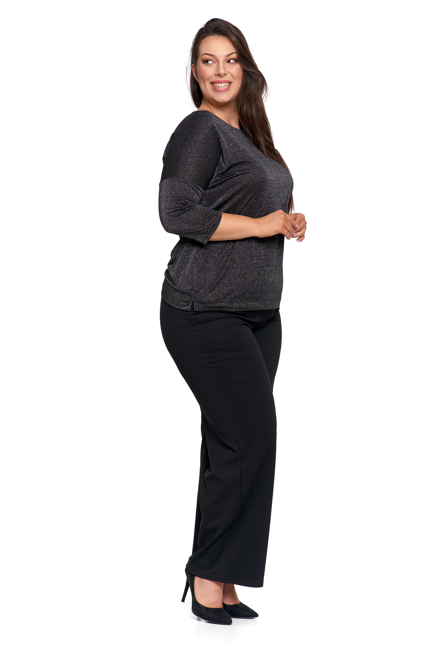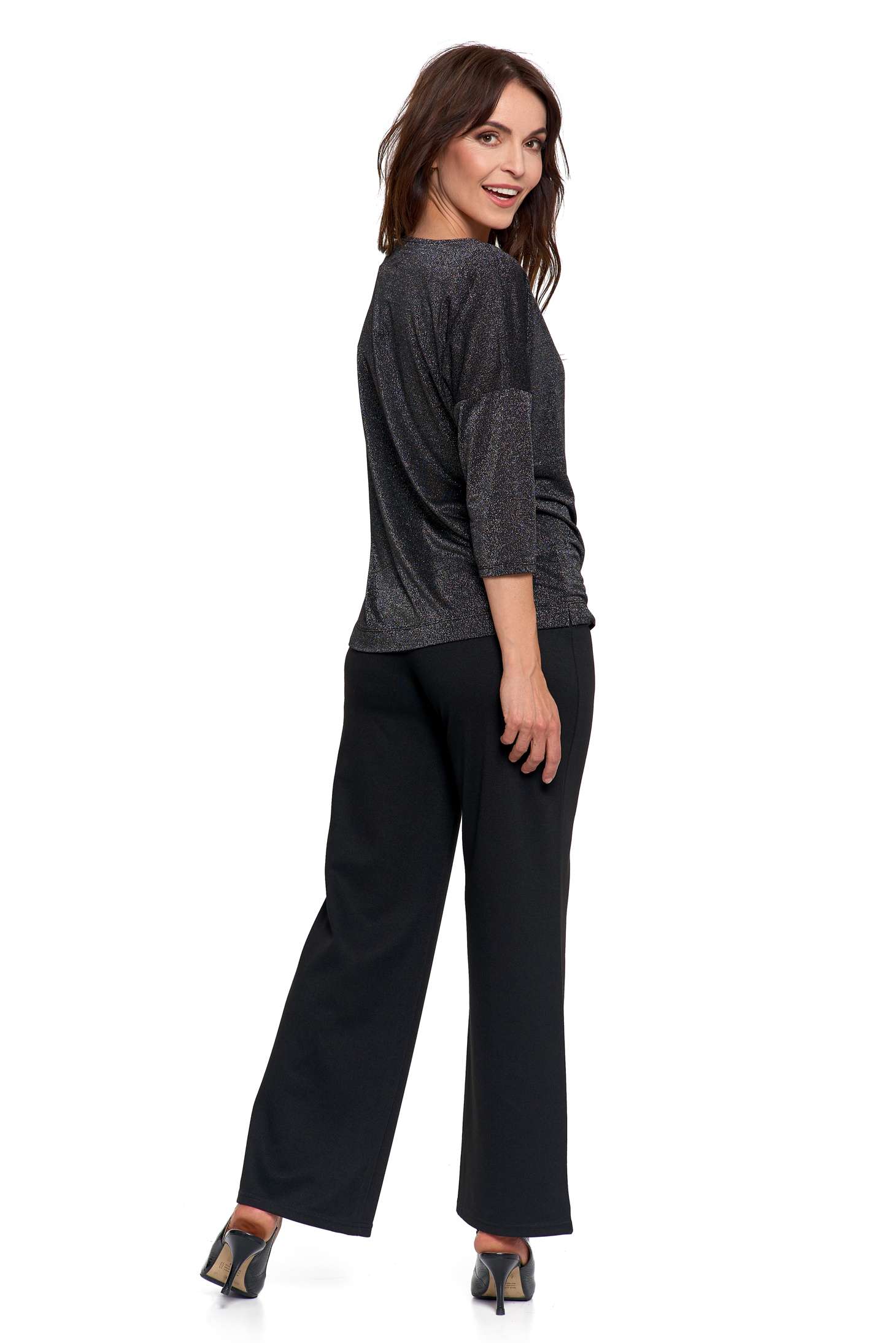 Ta bluzka to idealny wybór, gdy szukasz połączenia swobodnego komfortu z odrobiną blasku. Wykonana z miękkiej dzianiny z domieszką metalizowanej przędzy, delikatnie mieni się w świetle, nadając Twojej stylizacji nowoczesnego charakteru.
