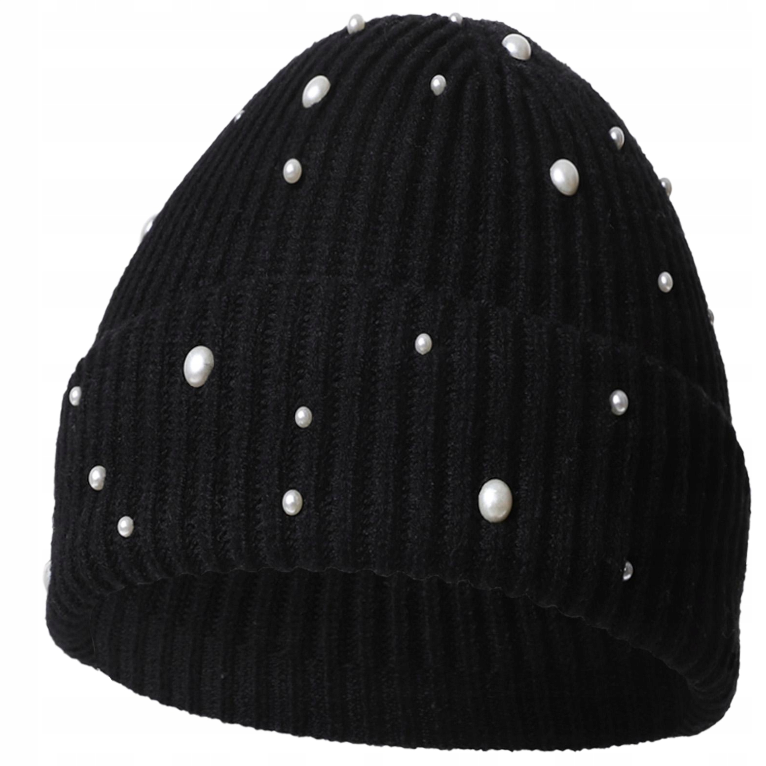 Elegancka CZAPKA DAMSKA Czarna z Perełkami Modna Stylowa Prążkowana MORAJ