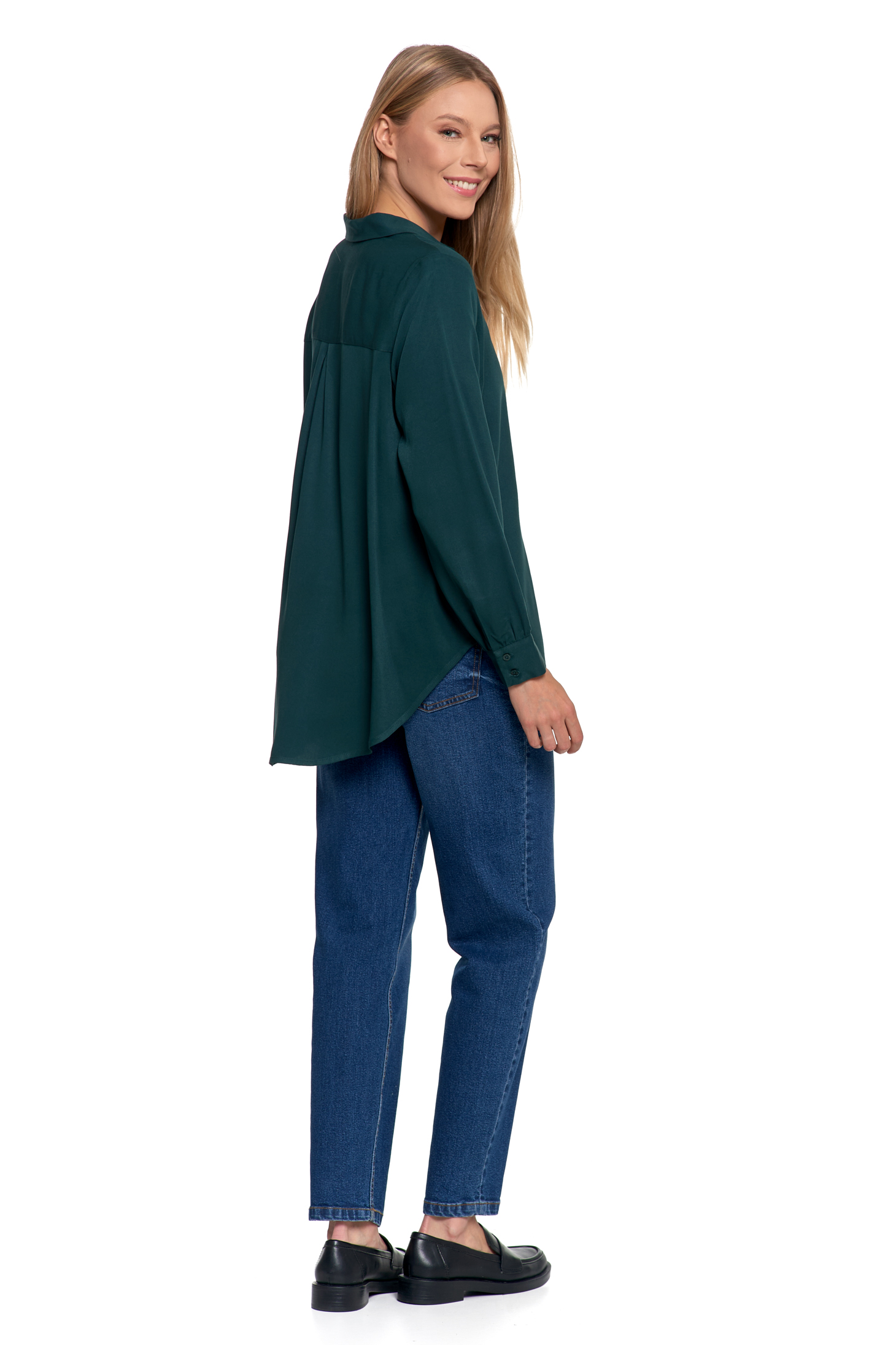 Design: Klasyczny kołnierzyk, pełne zapięcie na guziki oraz długie rękawy z mankietami podkreślają elegancki charakter.