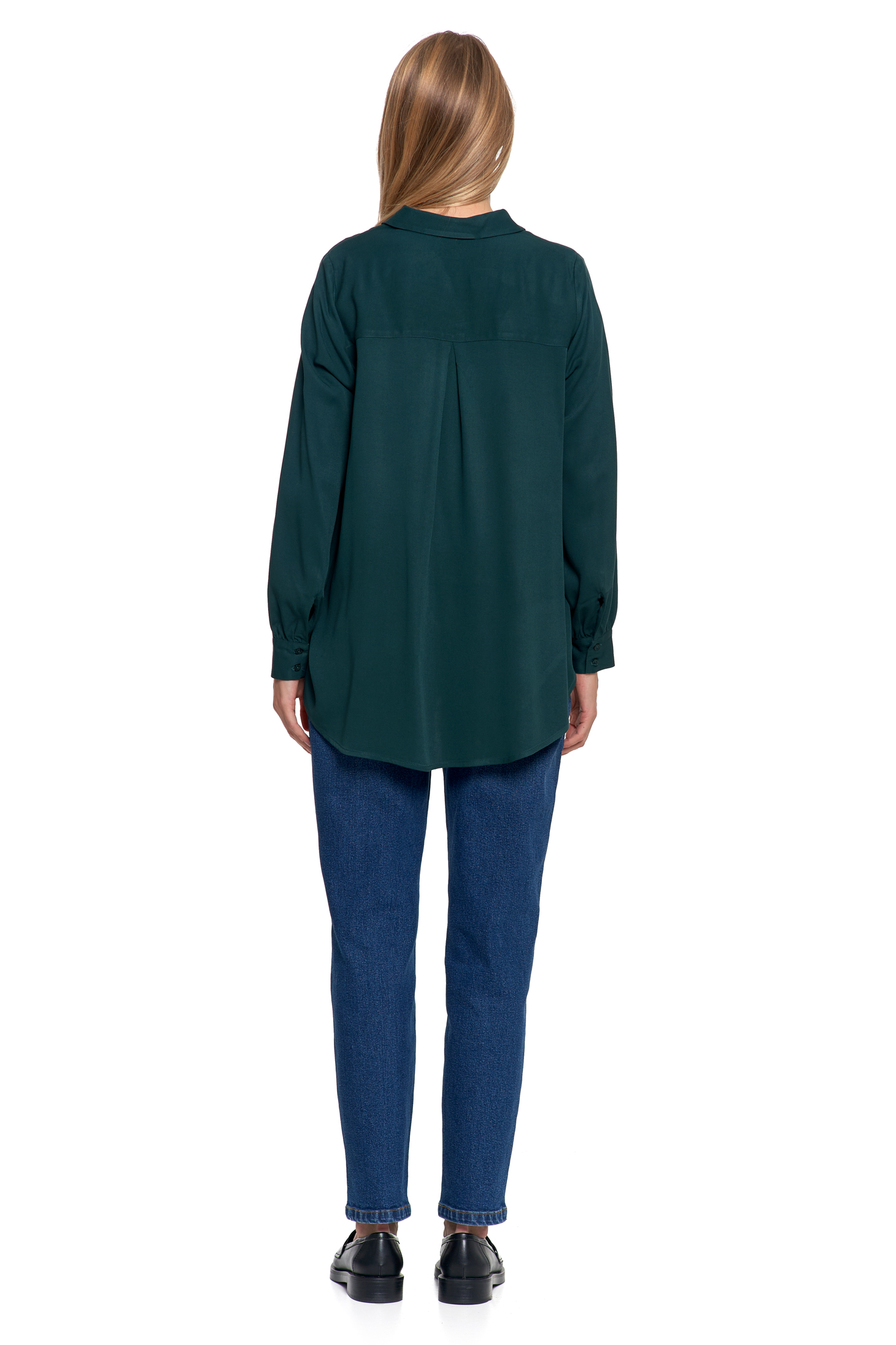 Ta lekka, miękko układająca się koszula to uniwersalny element każdej garderoby. Uszyta w 100% z oddychającej wiskozy, zapewnia komfort i przyjemne uczucie na skórze przez cały dzień. Jej luźny, oversize'owy krój z wydłużonym tyłem nadaje sylwetce lekkości i swobody.