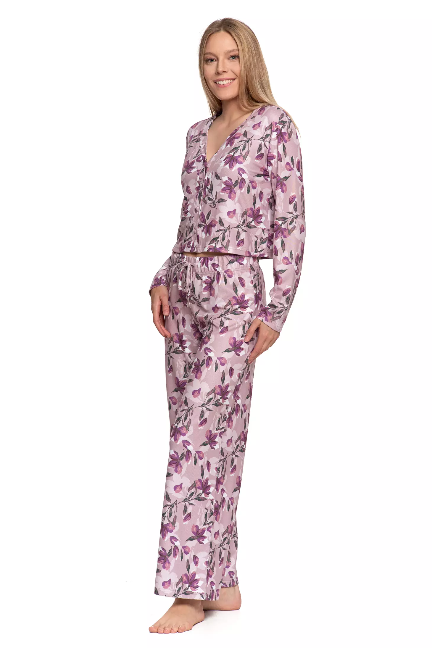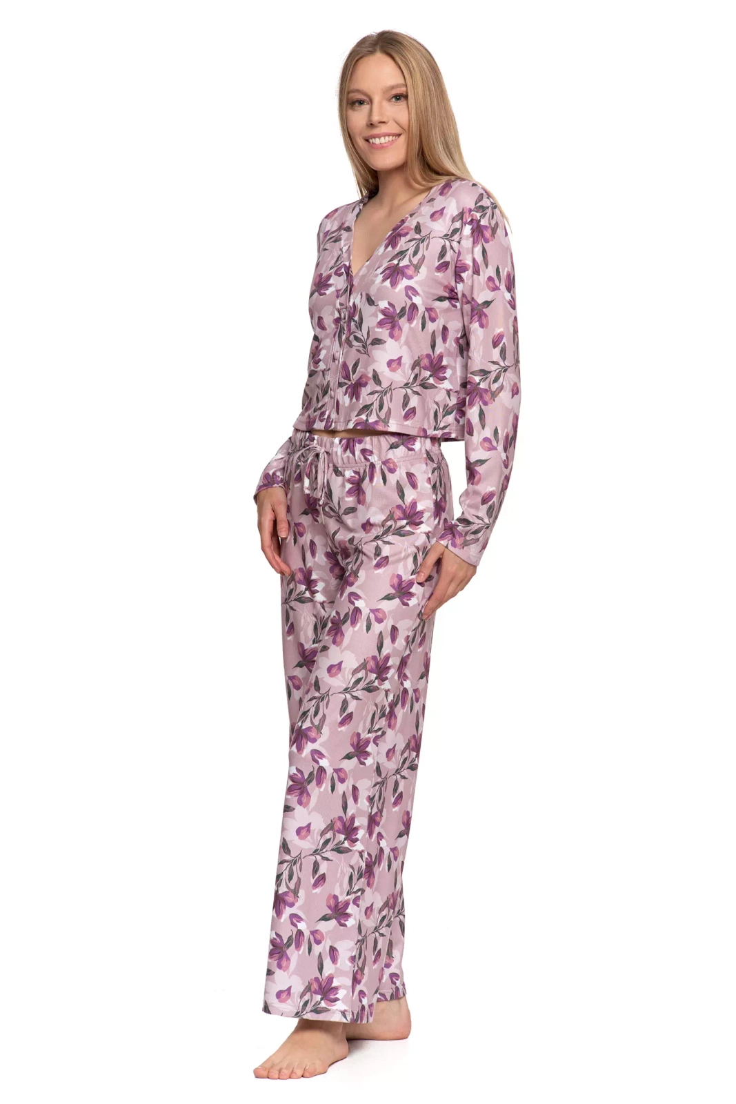 Ta piżama damska to idealne połączenie wygody i stylu. Komplet składa się z koszulki z długim rękawem, zapinanej na guziki, oraz spodni z prostą, szeroką nogawką. To doskonały wybór na spokojny wieczór w domu i komfortowy sen.