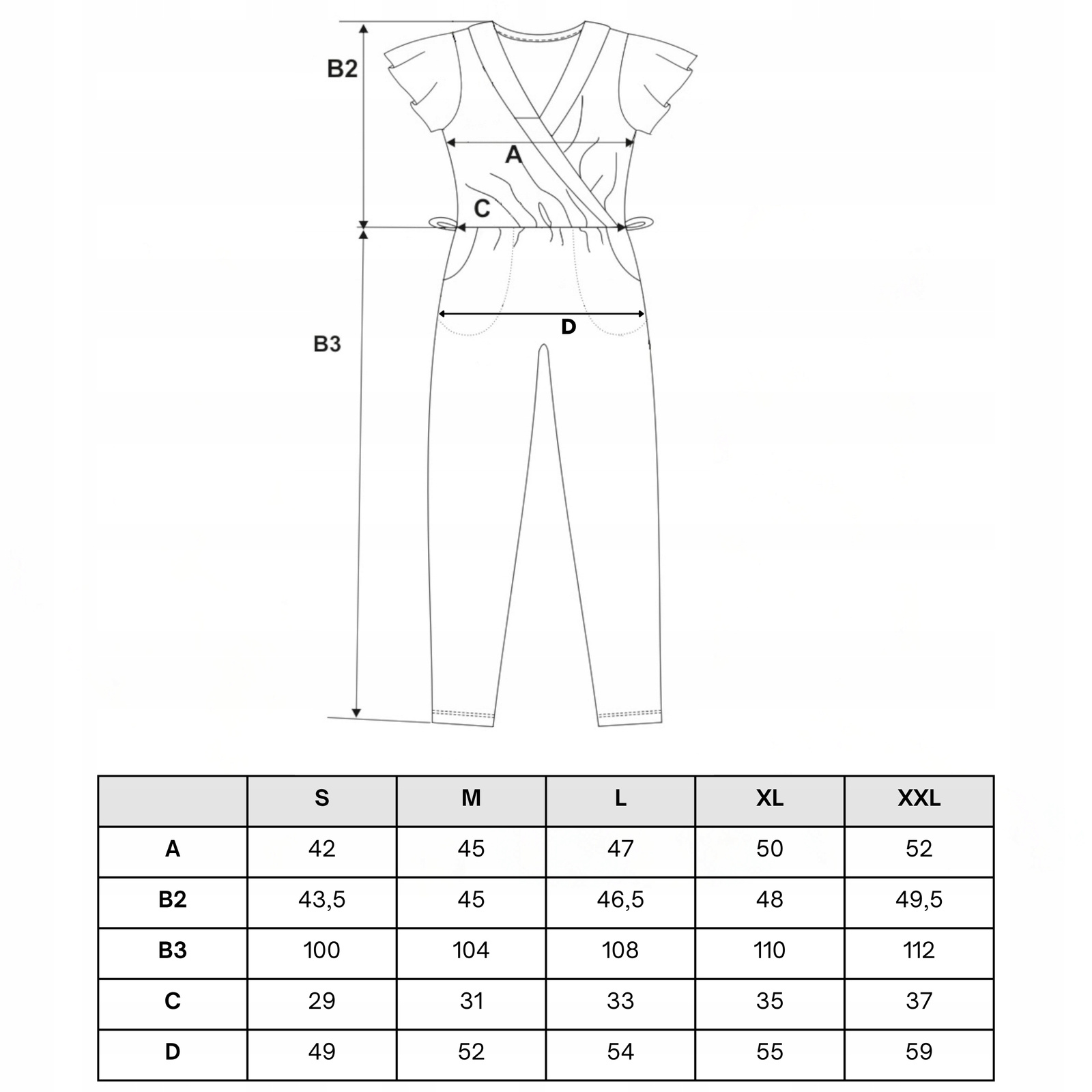 Góra kombinezonu ma dekolt w serek oraz krótkie rękawy, co dodaje lekkości i swobody ruchów. Gumka w pasie oraz dodatkowe wiązanie pozwalają na idealne dopasowanie do sylwetki, podkreślając talię. Dwie praktyczne kieszenie dodają funkcjonalności, a długie, proste nogawki zapewniają elegancki wygląd.