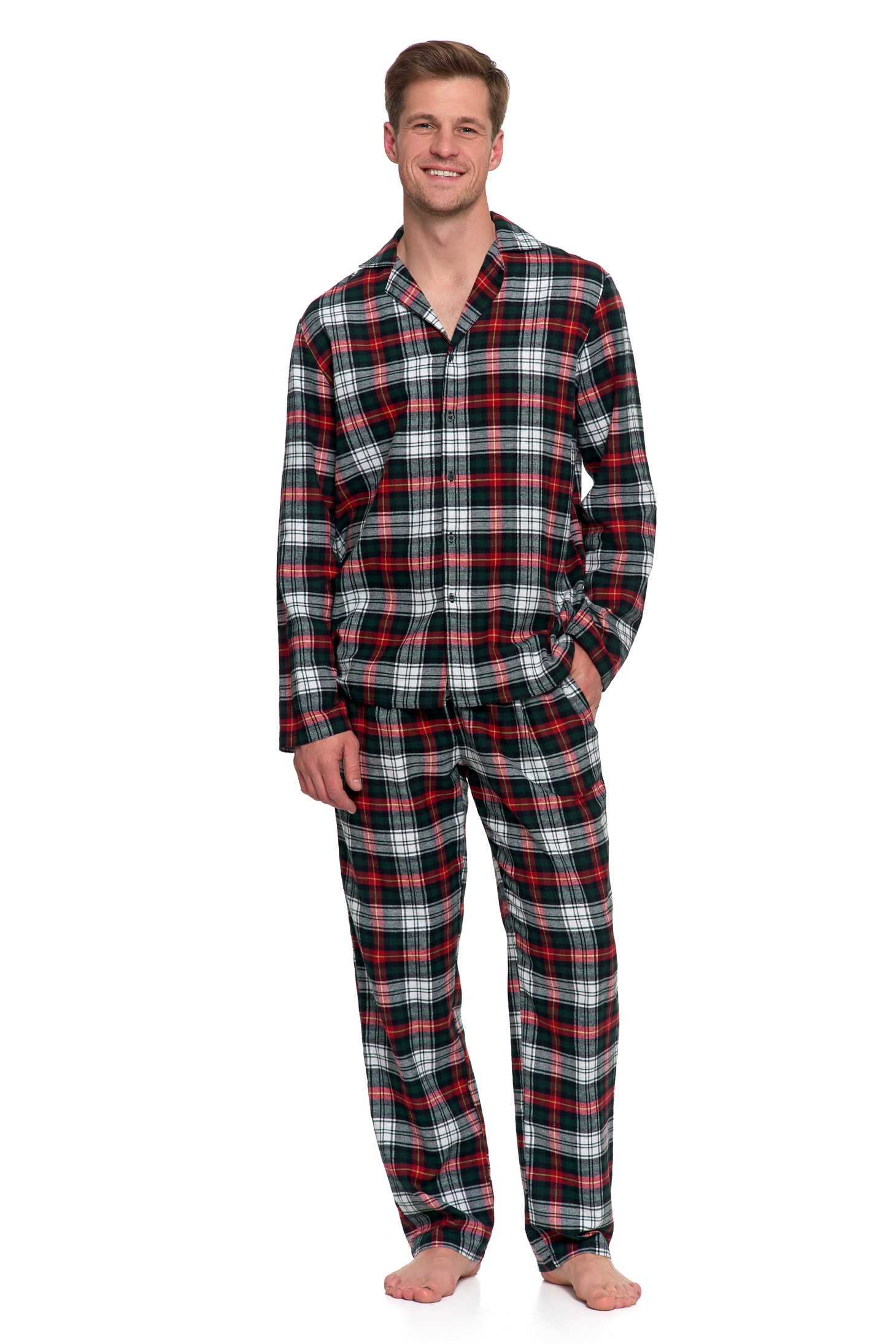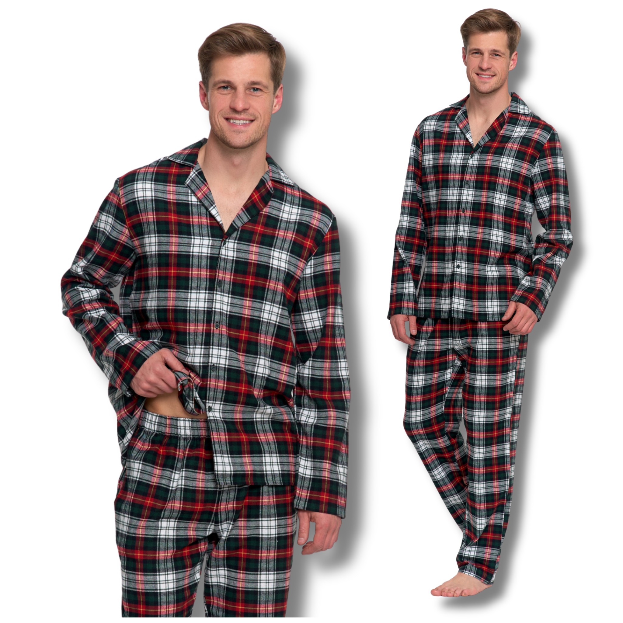 Ta klasyczna męska piżama to kwintesencja domowego komfortu i tradycyjnego stylu. Wykonana z miękkiej i przyjemnej w dotyku bawełnianej flaneli, zapewnia przyjemne ciepło, komfort snu i pełną swobodę ruchów.