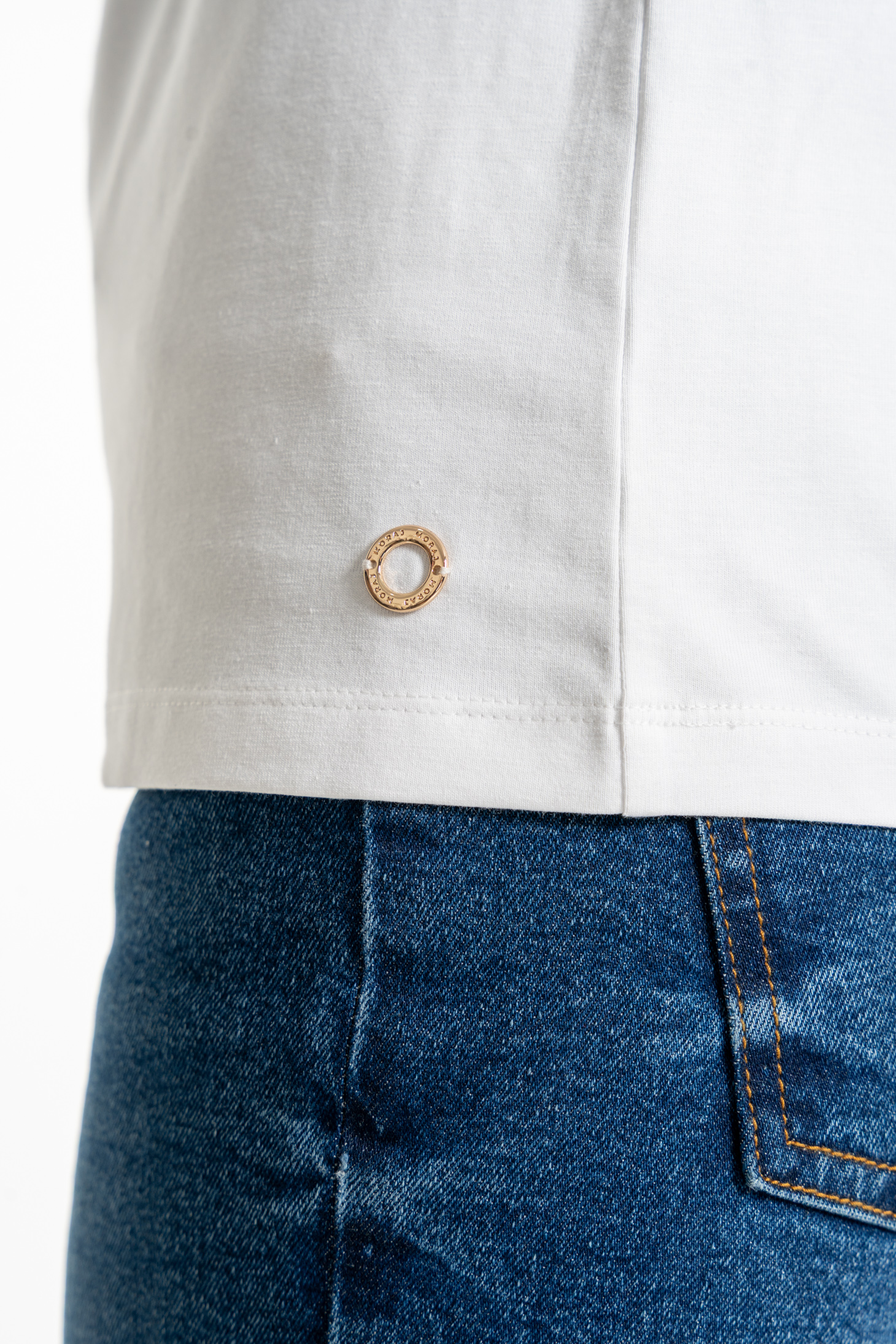 Dekolt w kształcie litery V – z dekoracyjną wstawką, nadaje bluzie subtelnego charakteru.