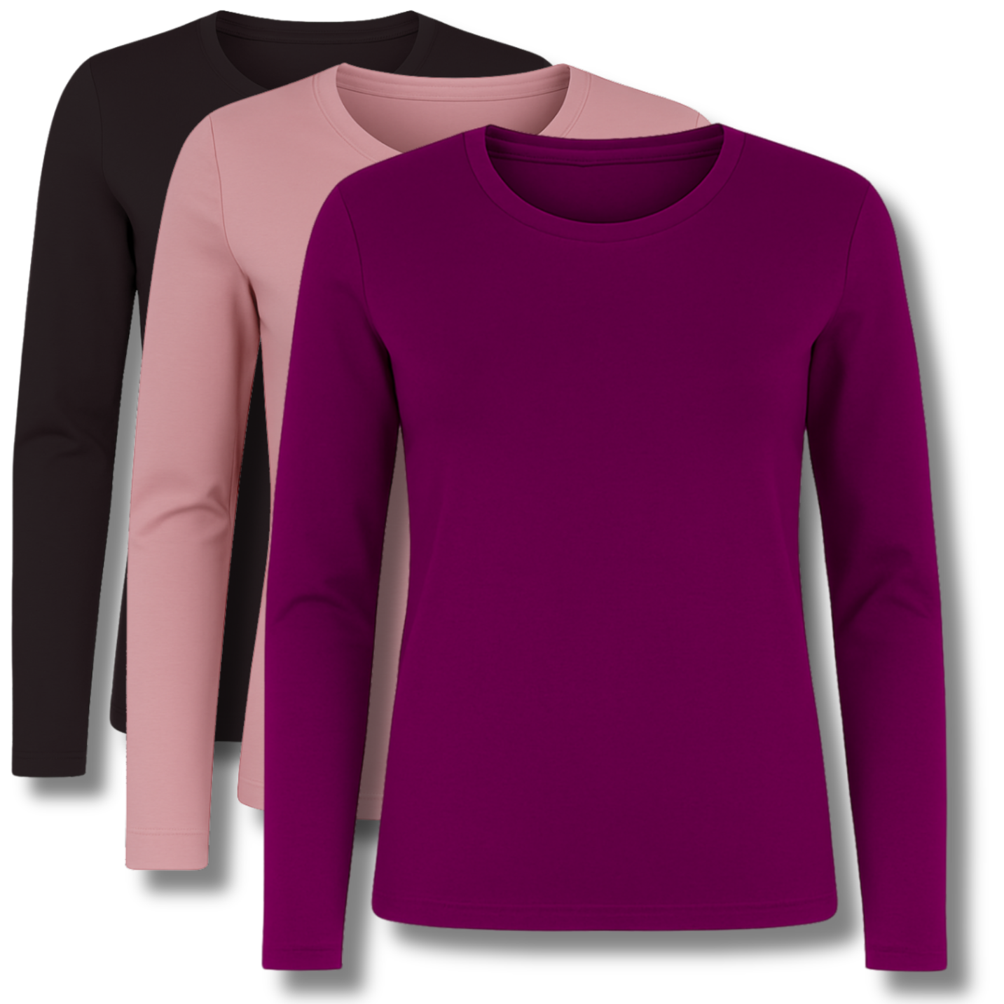 GŁADKA BLUZKA DAMSKA KOSZULKA Z DŁUGIM RĘKAWEM MODNA MORAJ 3-PAK