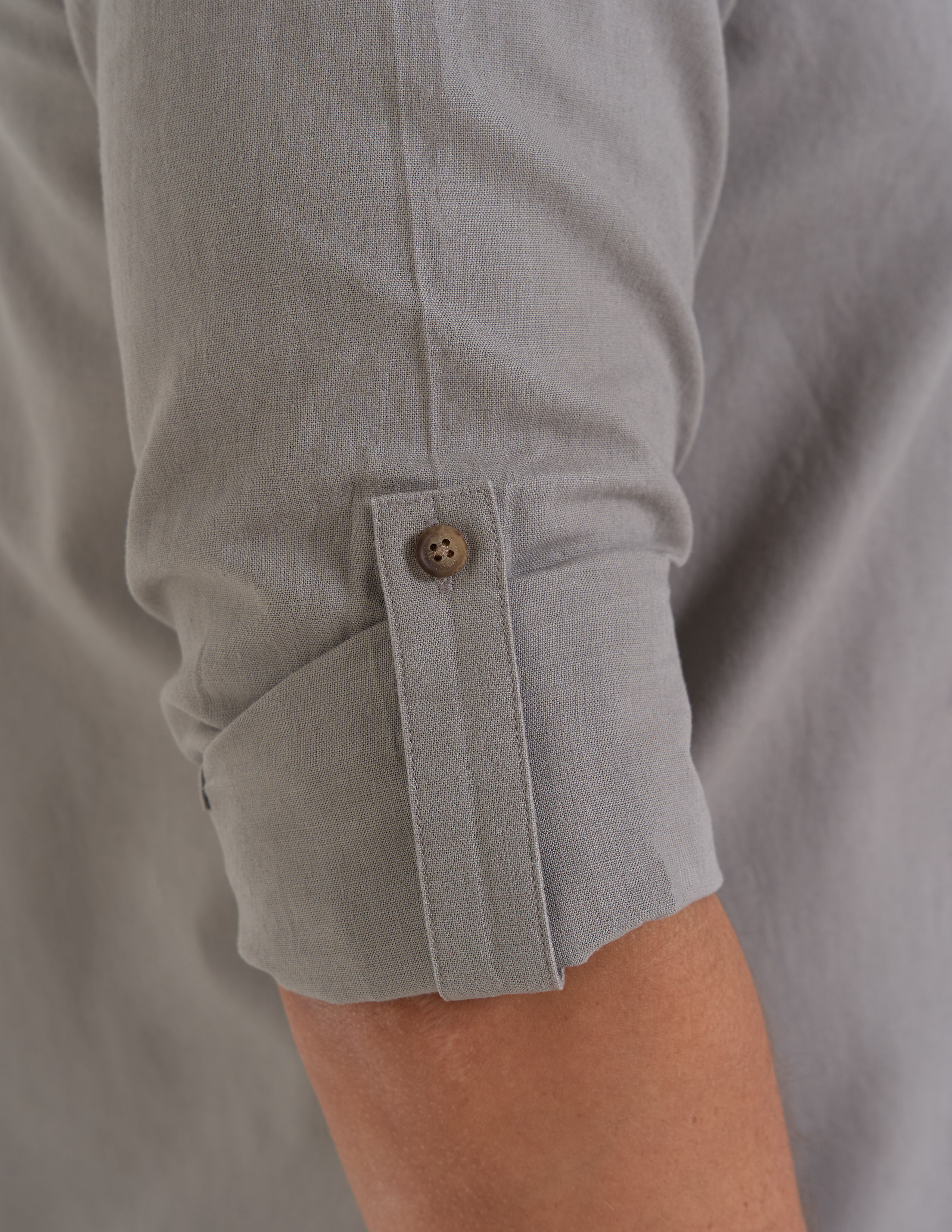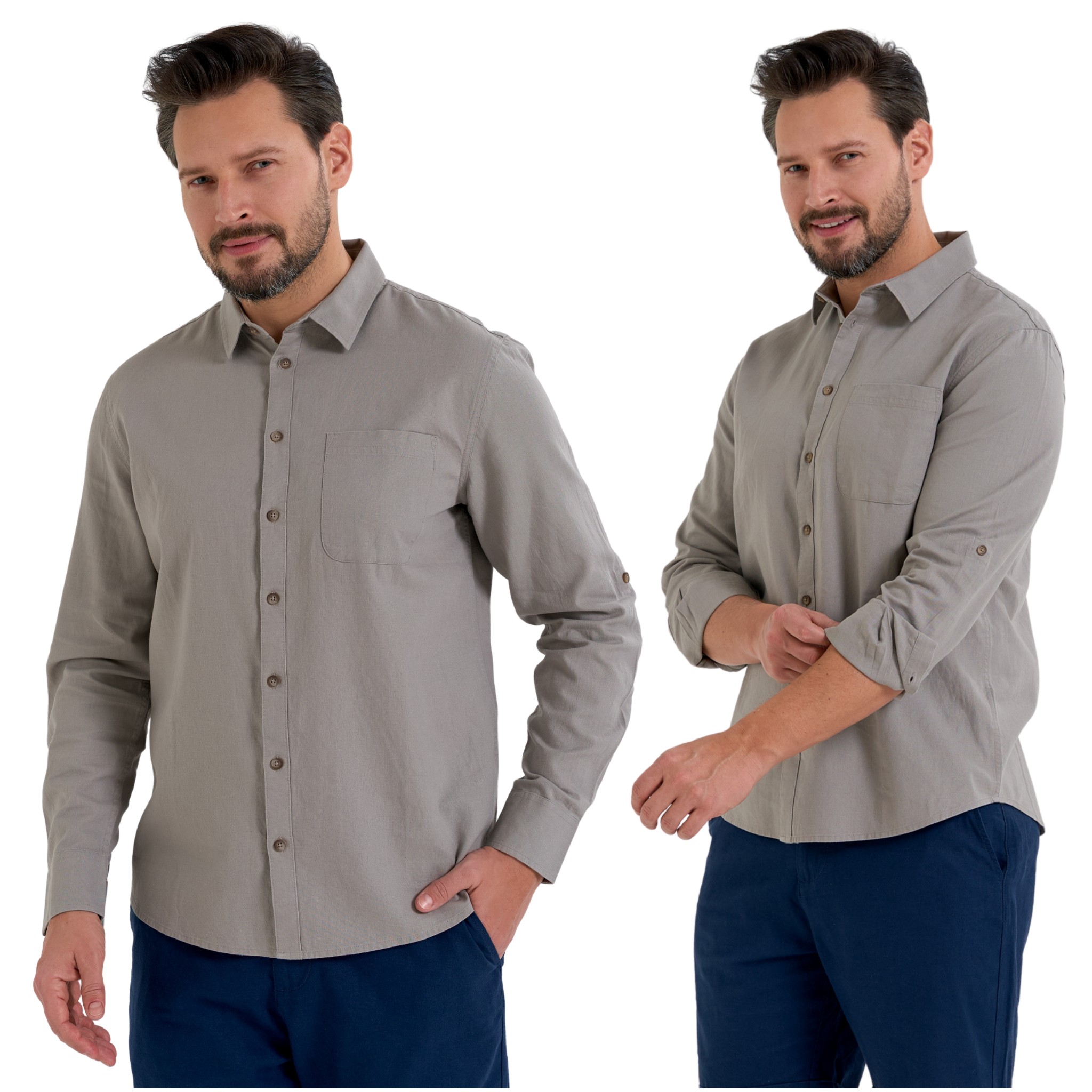 Regulowana Długość Rękawów: To koszula "2 w 1". Dzięki specjalnym patkom możesz w kilka sekund podwinąć rękawy i stabilnie je zapiąć, zmieniając elegancki model z długim rękawem w swobodną koszulę letnią. Idealne rozwiązanie na zmienną pogodę lub przejście z biura na popołudniowy spacer.