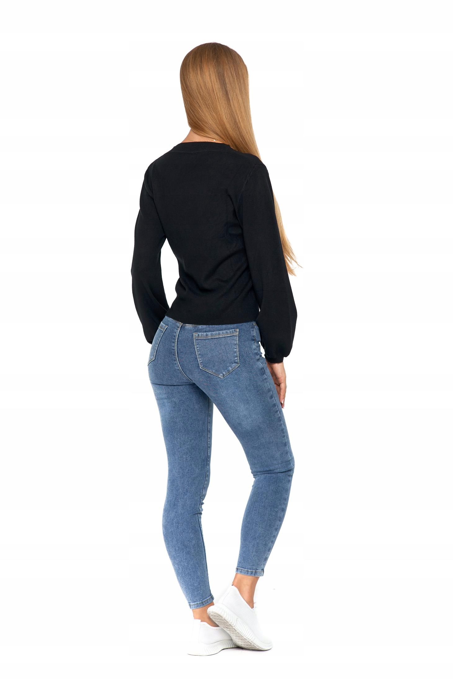 Jeansy damskie typu skinny z wysokim stanem. Tkanina z elastanem lepiej układa się na ciele i zapewnia swobodę ruchów. Największą zaletą tego kroju jest elastyczność, a także wygodny wysoki stan. Model posiada kieszenie z przodu oraz z tyłu.