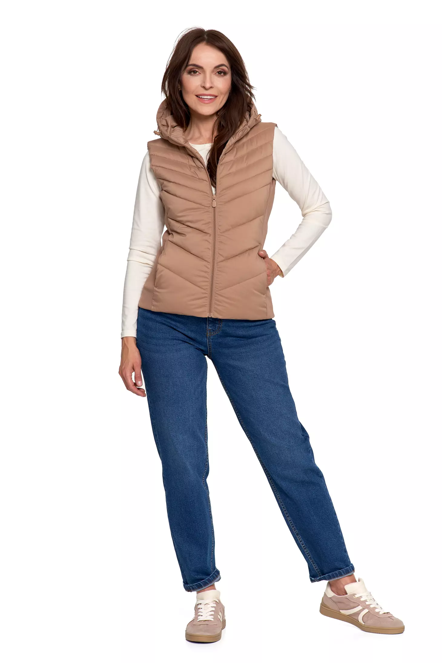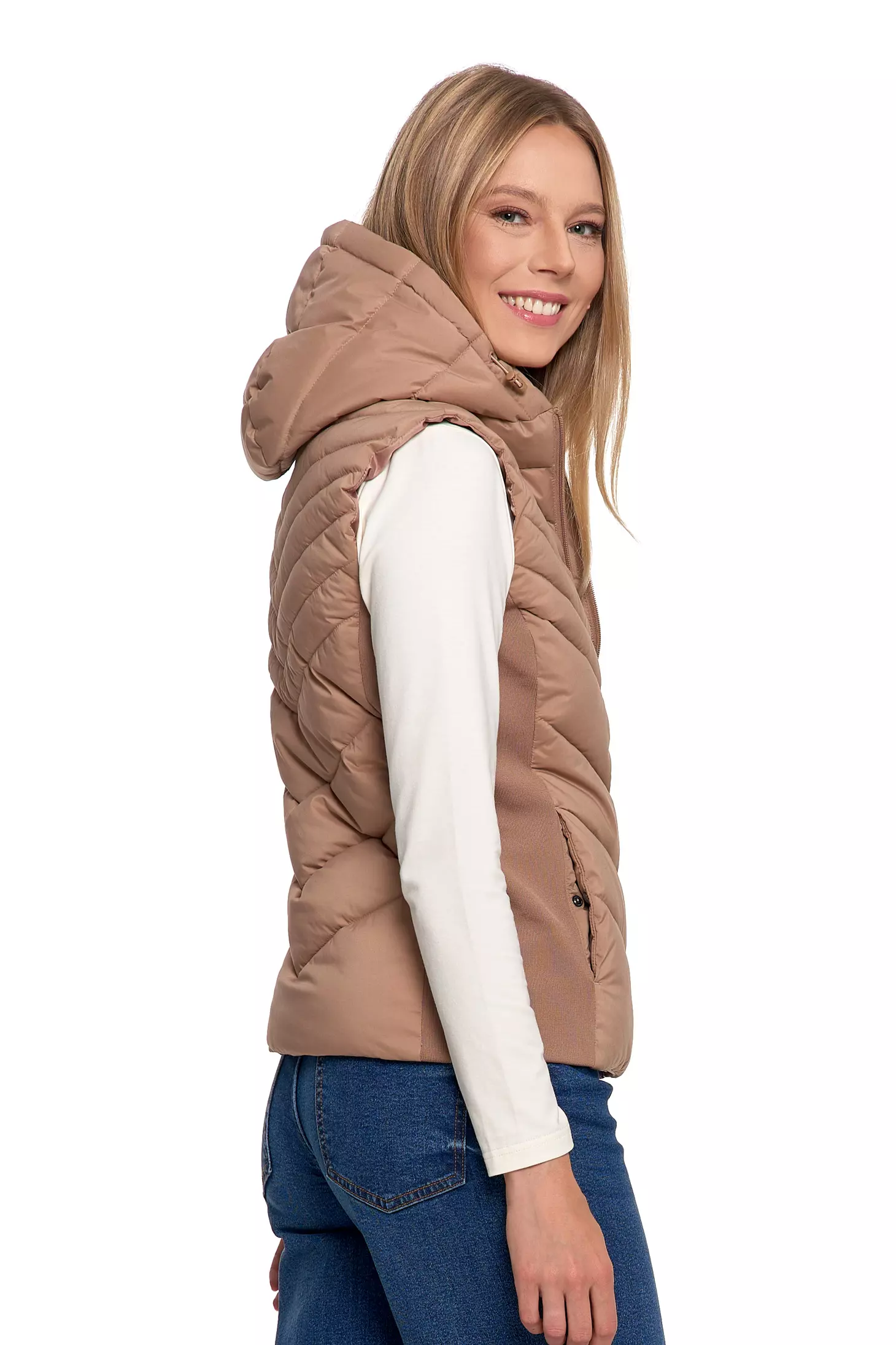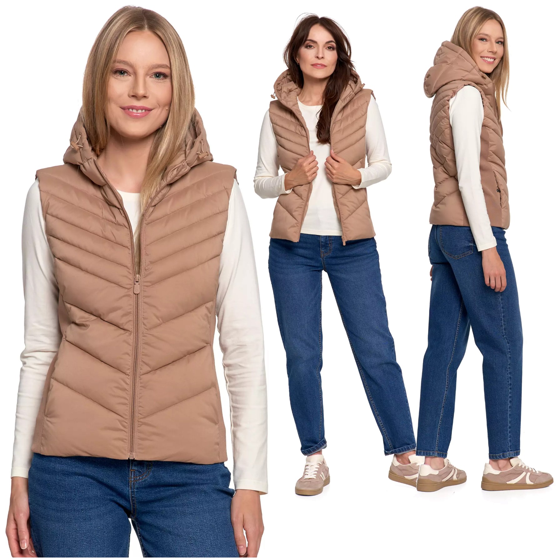 KAMIZELKA DAMSKA KRÓTKA PIKOWANA Z KAPTUREM BEZRĘKAWNIK NA JESIEŃ MORAJ
