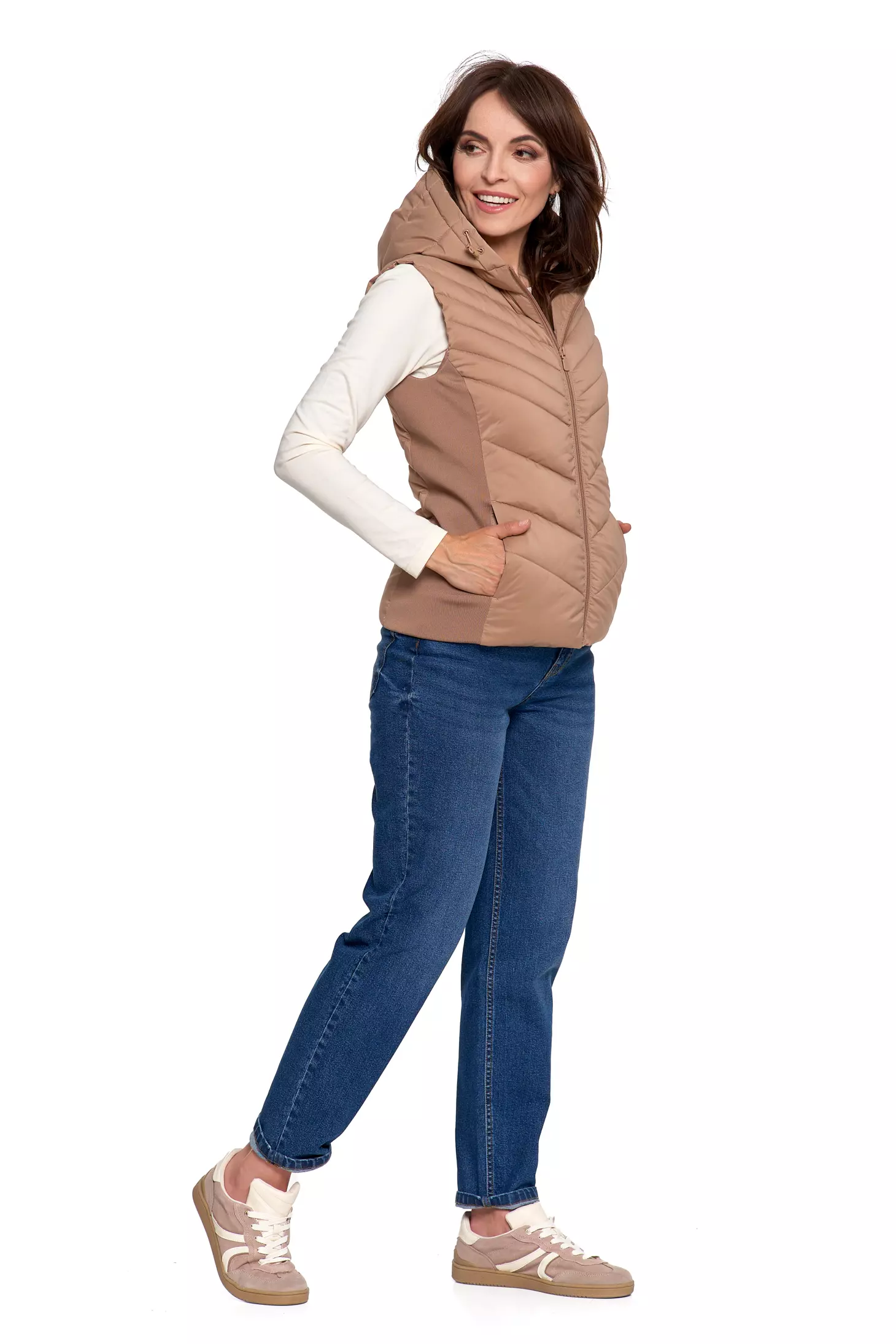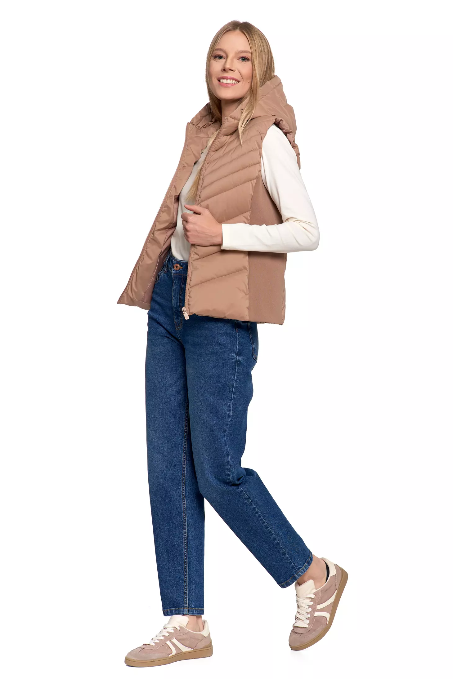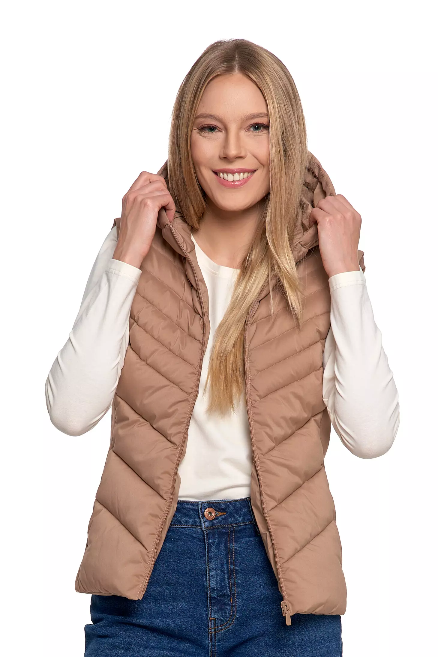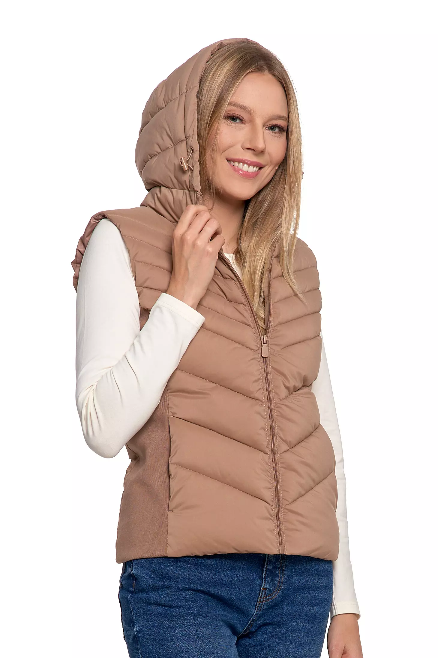 KAMIZELKA DAMSKA KRÓTKA PIKOWANA Z KAPTUREM BEZRĘKAWNIK NA JESIEŃ MORAJ