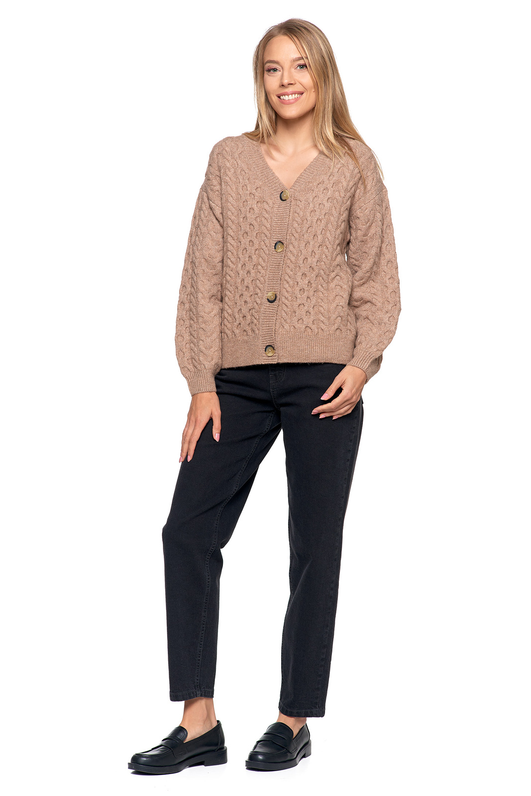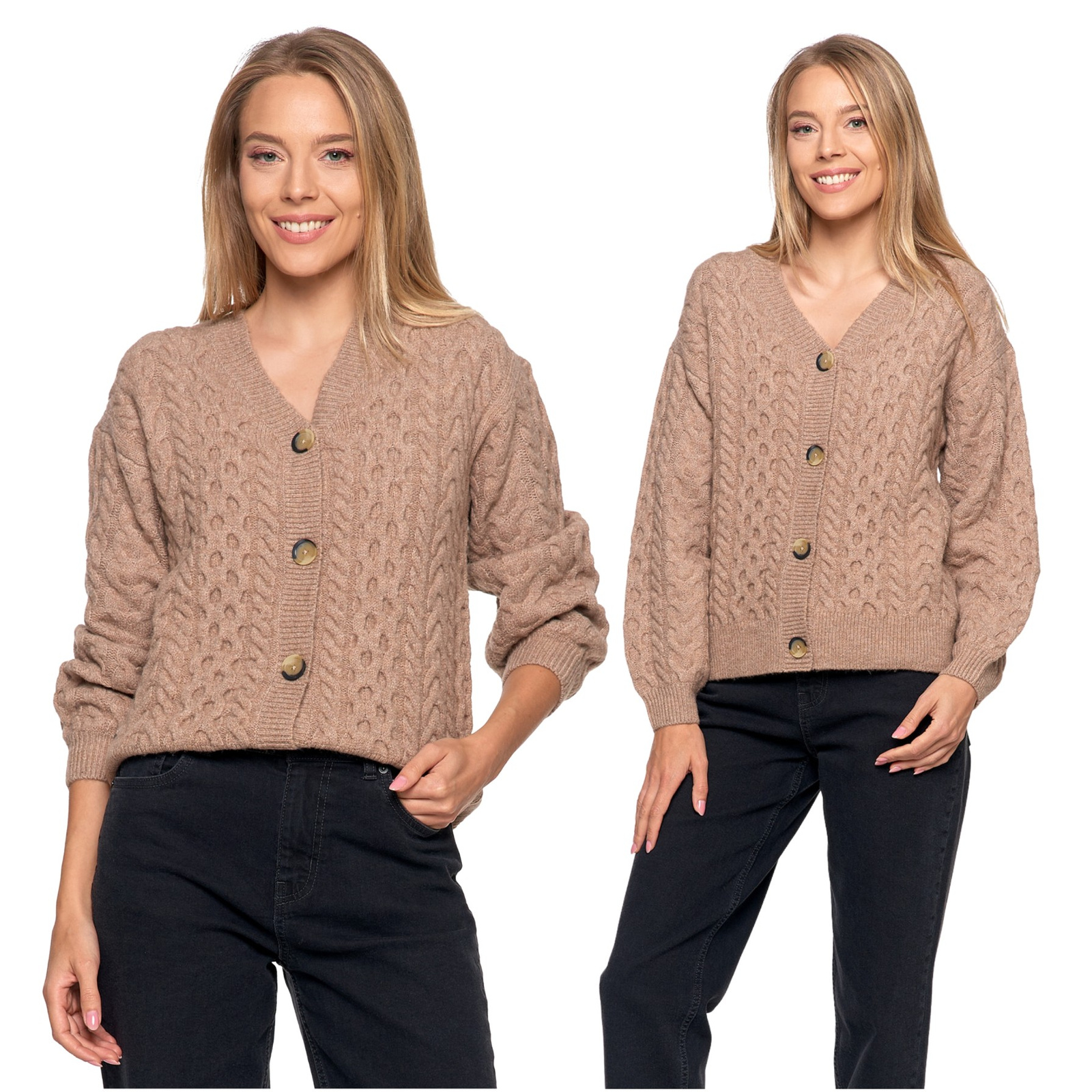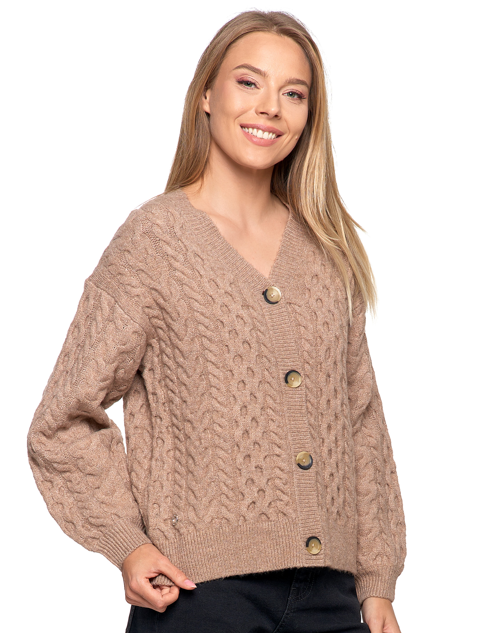 Ten mięsisty sweter damski zapinany na guziki to idealna propozycja na chłodniejsze dni. Wykonany z miękkiej i przyjemnej w dotyku dzianiny, ozdobiony klasycznym warkoczowym splotem, nadaje całości przytulny, ponadczasowy wygląd.