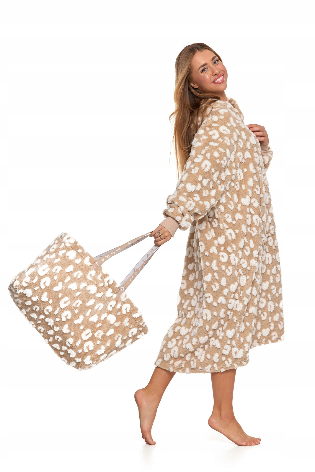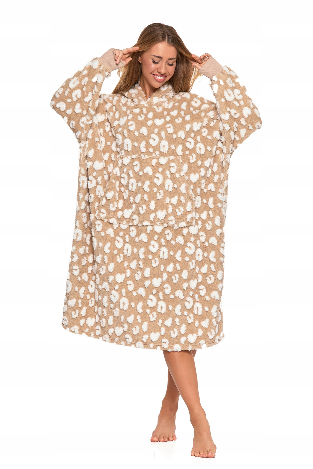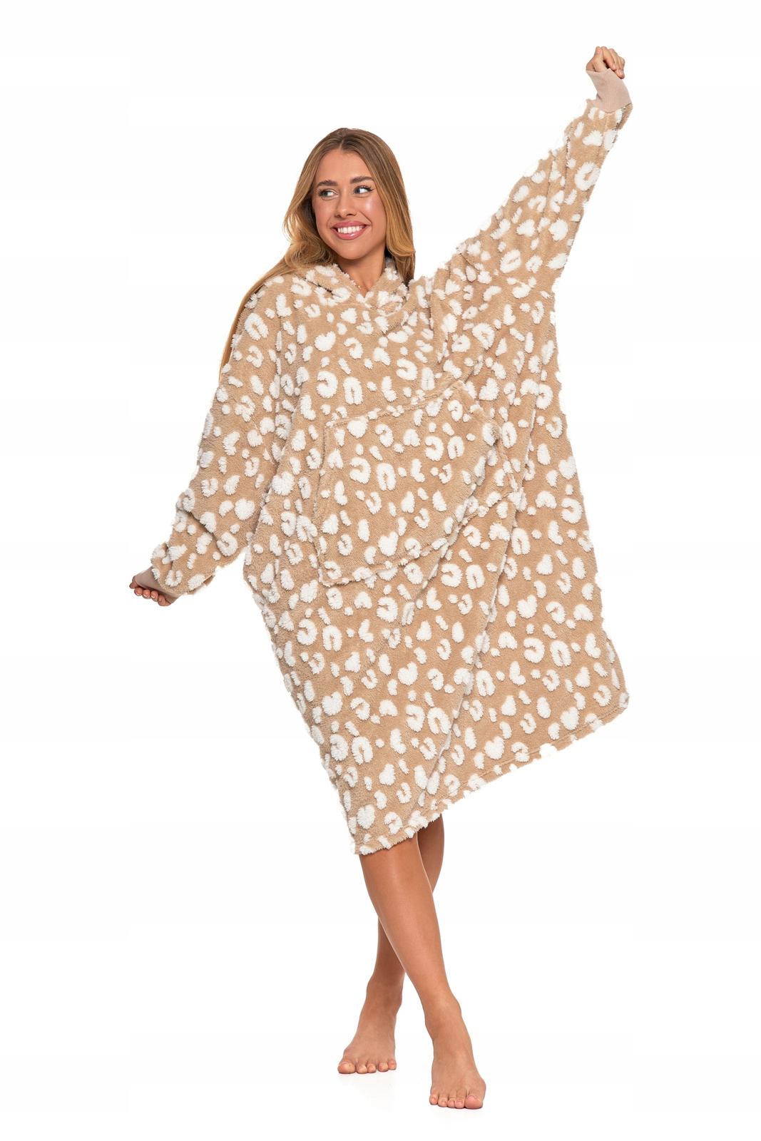 Długa kocobluza damska w cętki z kapturem w formie pluszowej kocobluzy to doskonałe rozwiązanie na chłodne wieczory i zimowe noce.