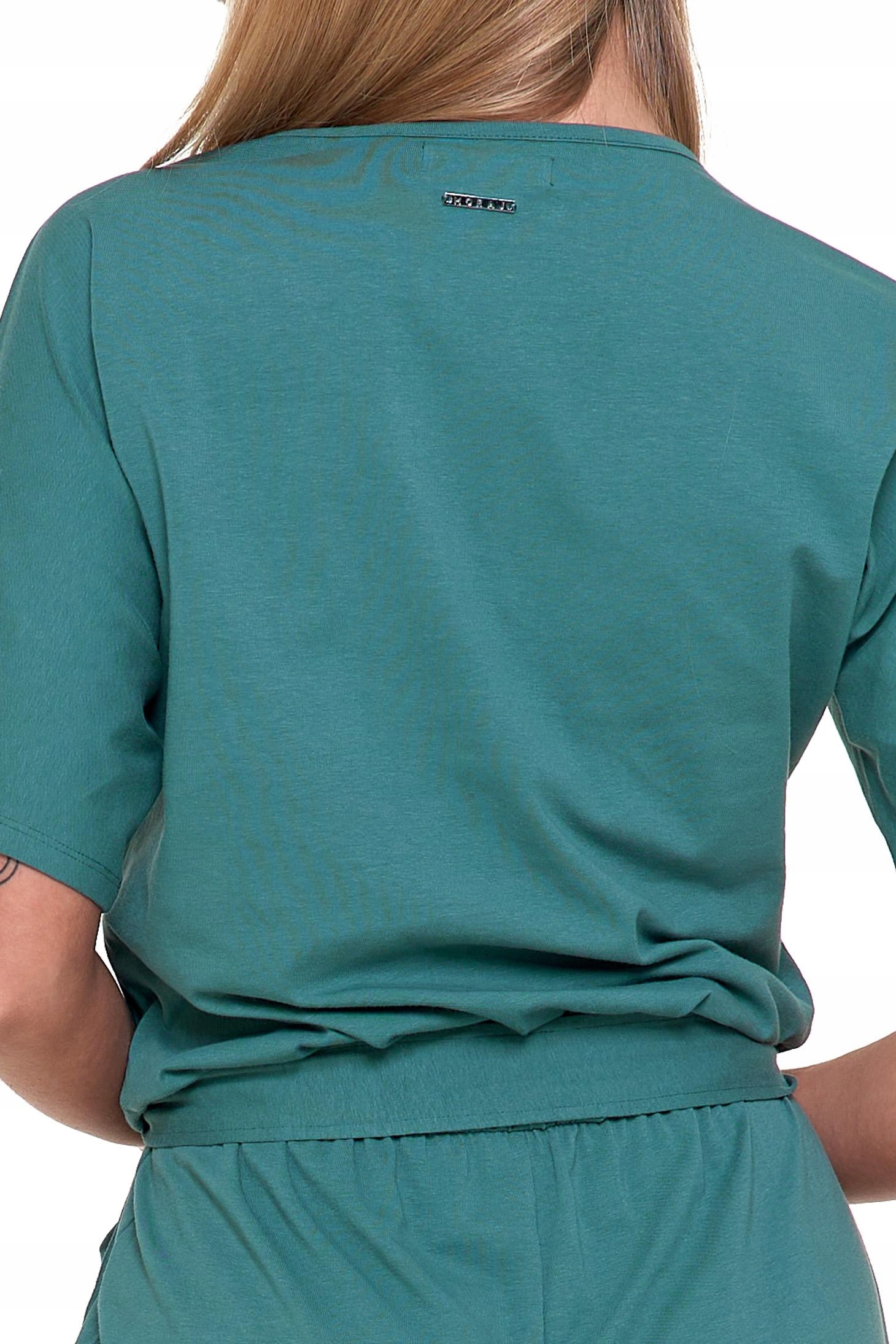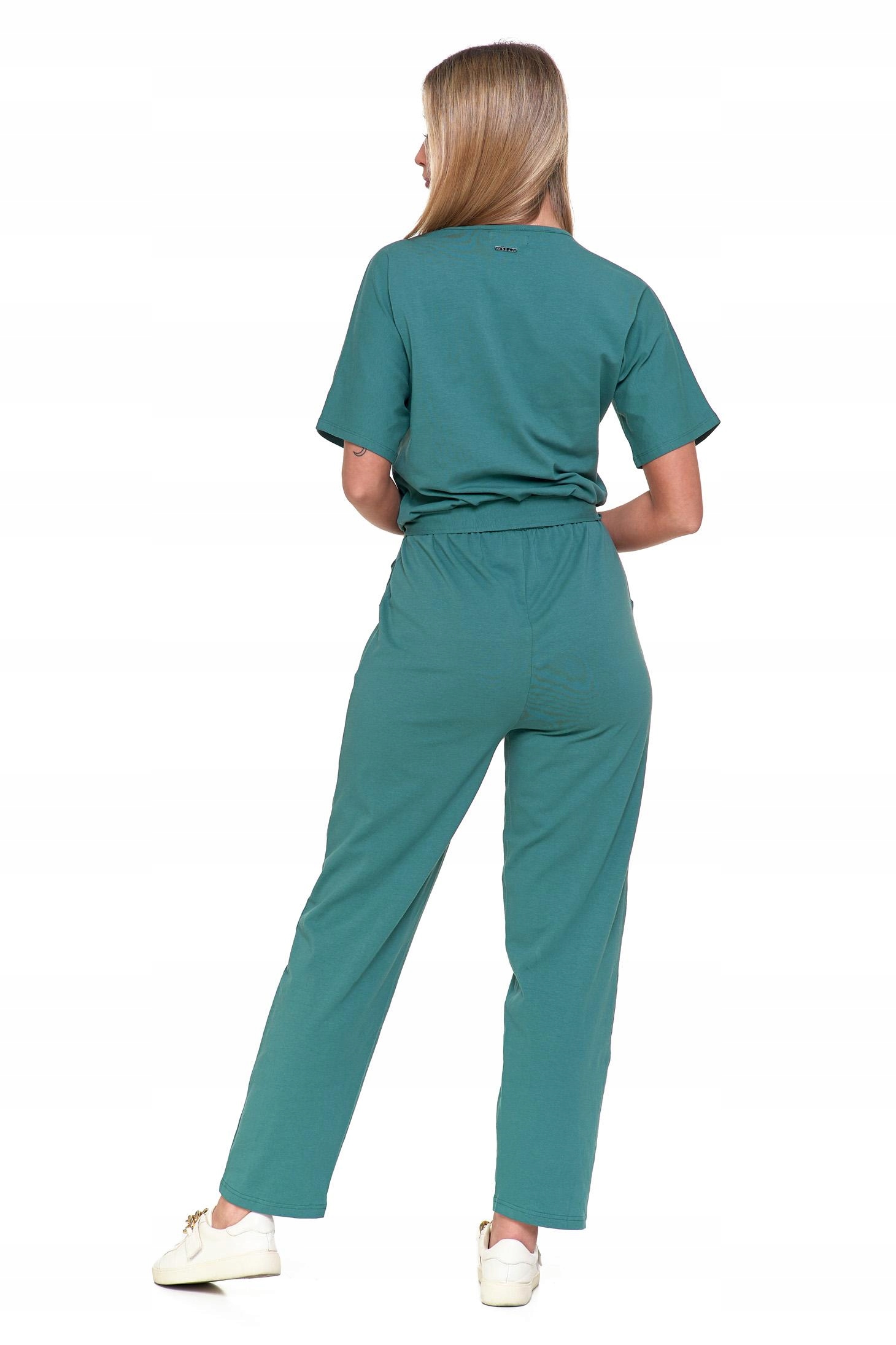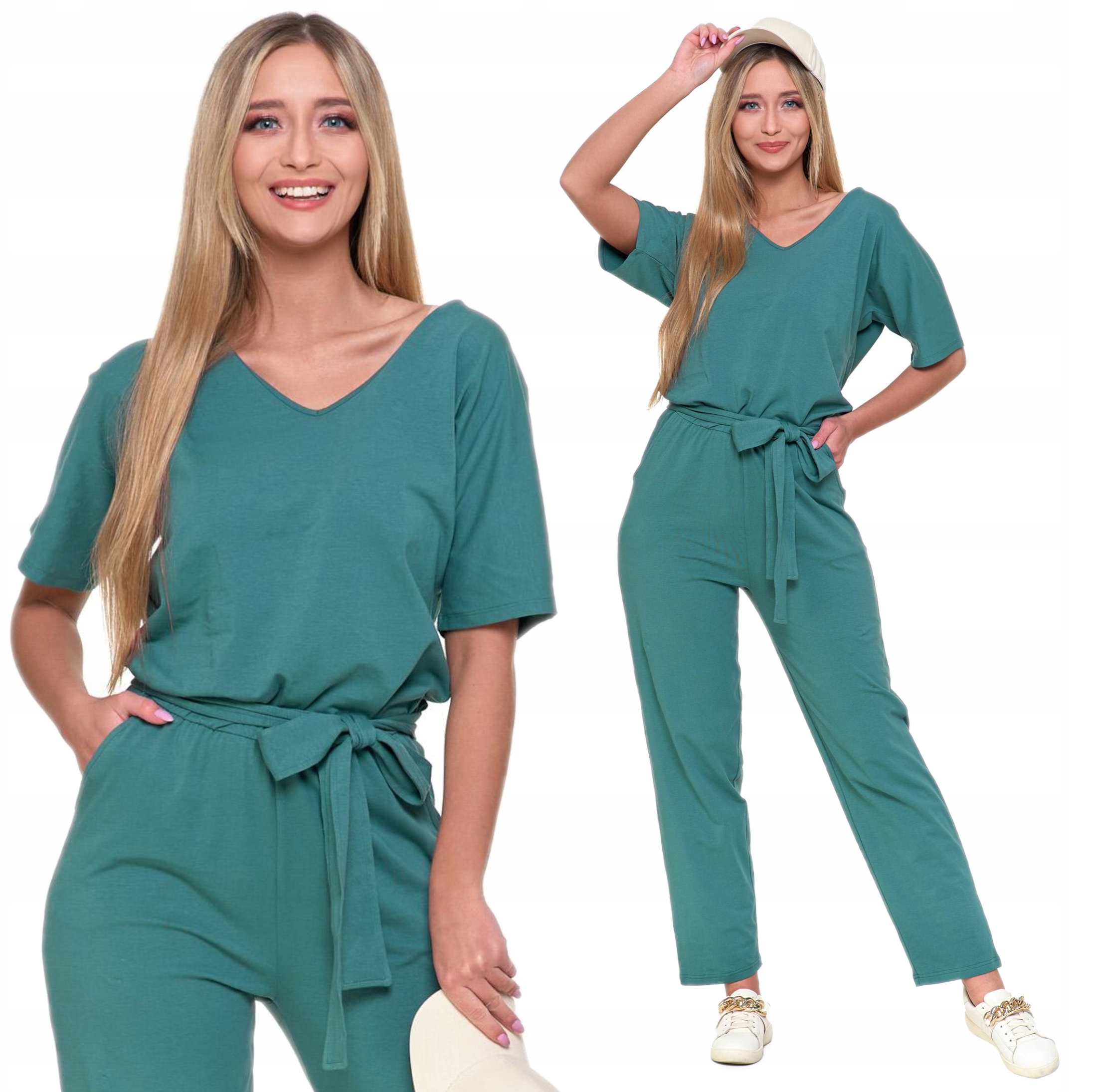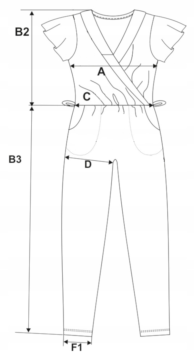 Góra kombinezonu ma dekolt w serek oraz luźne kimonowe krótkie rękawy, co dodaje lekkości i swobody ruchów. Gumka w pasie oraz dodatkowe wiązanie pozwalają na idealne dopasowanie do sylwetki, podkreślając talię. Dwie praktyczne kieszenie dodają funkcjonalności, a długie, proste nogawki zapewniają elegancki wygląd.