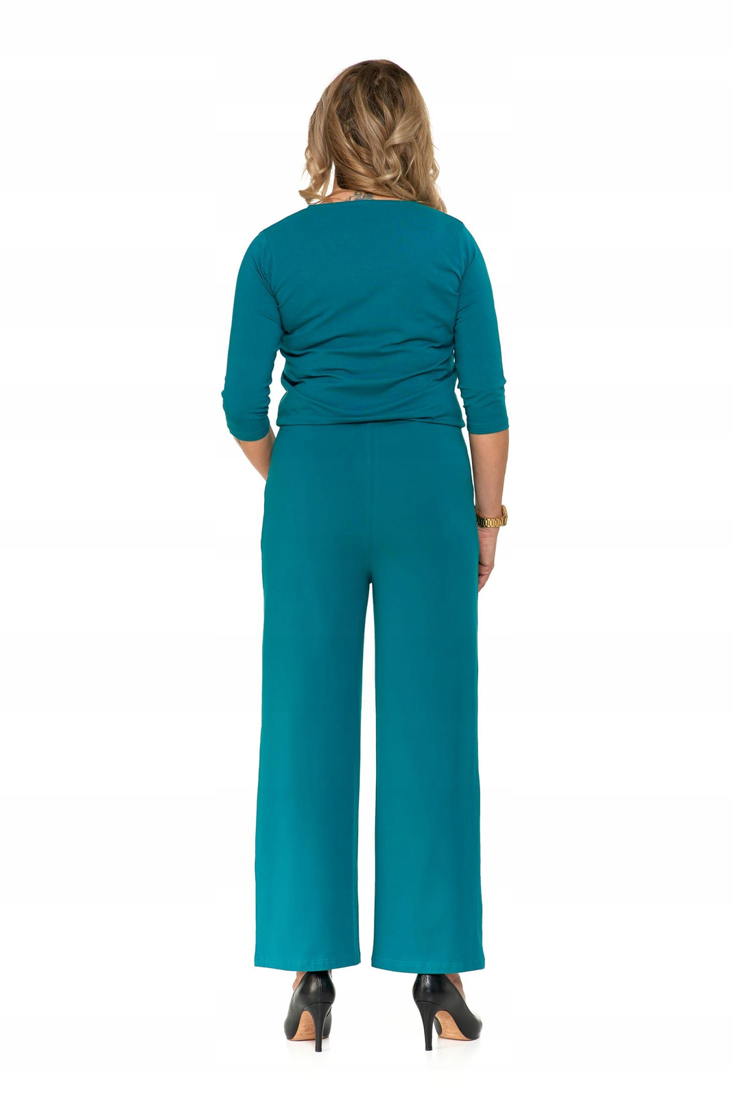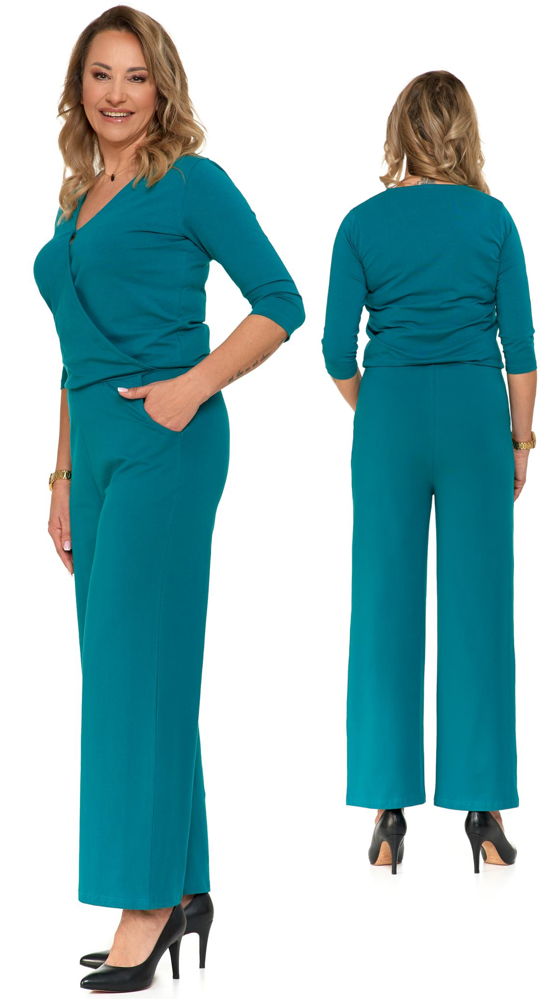 Kombinezon został wykonany z wysokiej jakości bawełny z dodatkiem elastanu, który odpowiada za dopasowywanie się materiału, trwałość i komfort noszenia. Szerokie nogawki nadają mu luźny i swobodny charakter, jednocześnie dodając mu lekkości i elegancji. Rękaw długości trzech czwartych jest idealny na cieplejsze dni lub na wieczorne wyjścia, gdy chcesz pokazać trochę skóry.