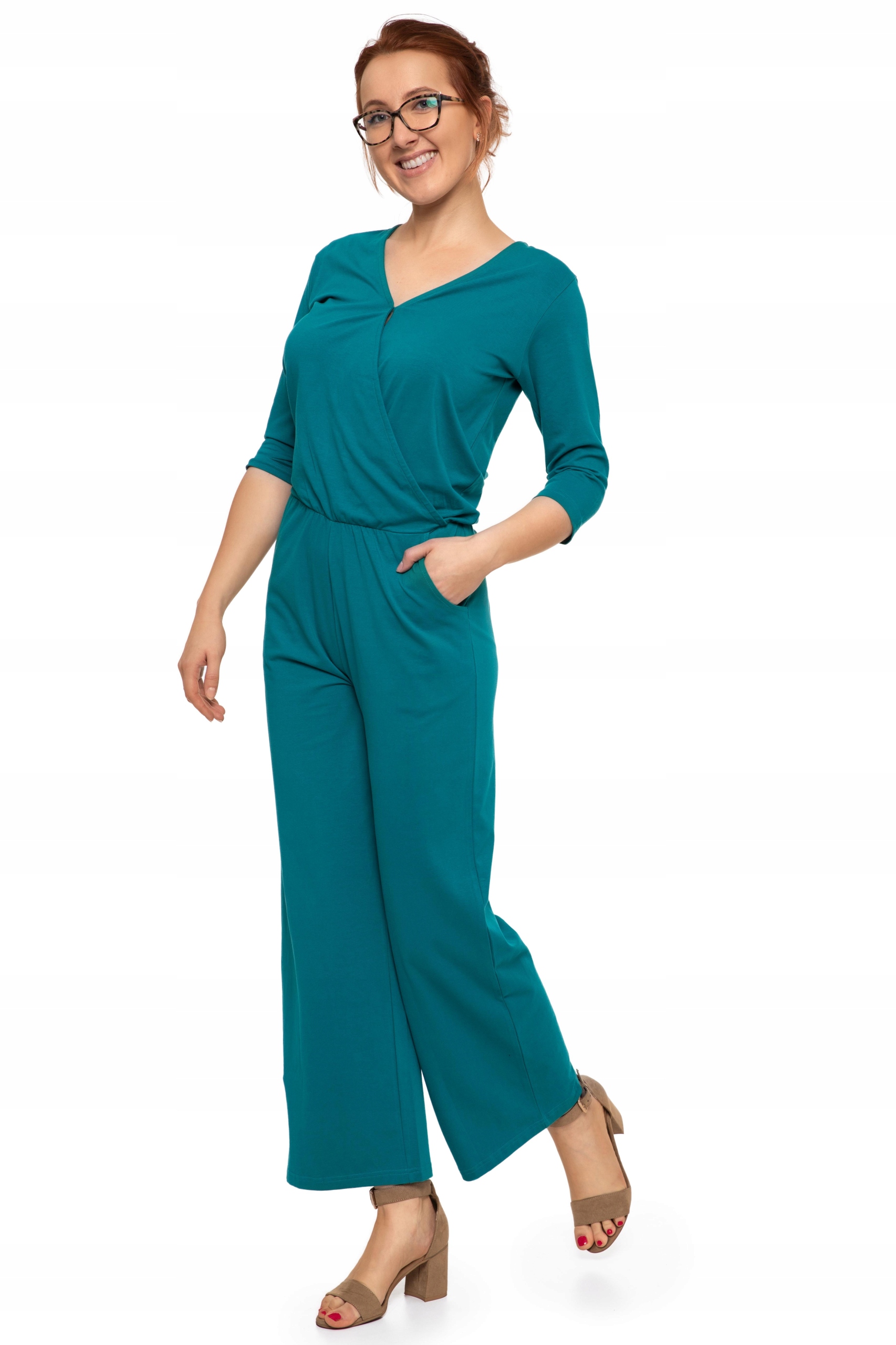 Kombinezon damski z szerokimi nogawkami, rękawem, dekoltem w serek, kieszeniami i odcięciem w talii to idealny wybór dla kobiet, które chcą wyglądać stylowo, elegancko i jednocześnie czuć się wygodnie. Bez względu na okazję, ten kombinezon z pewnością przyciągnie uwagę i sprawi, że będziesz wyglądać oszałamiająco.