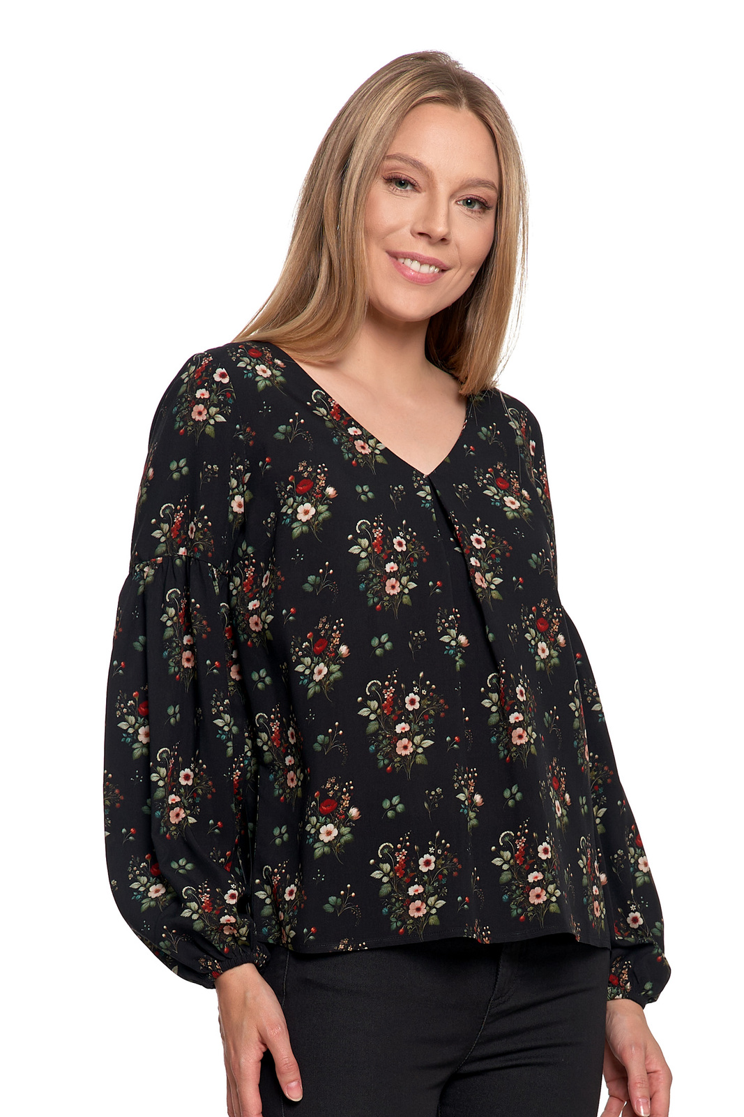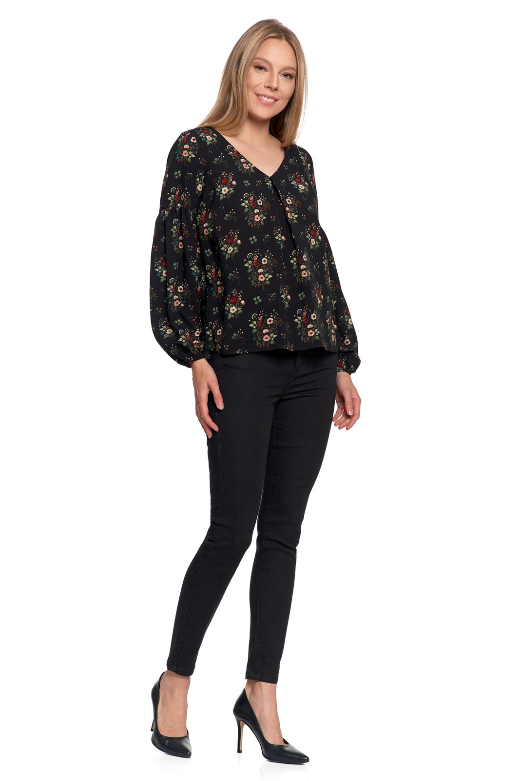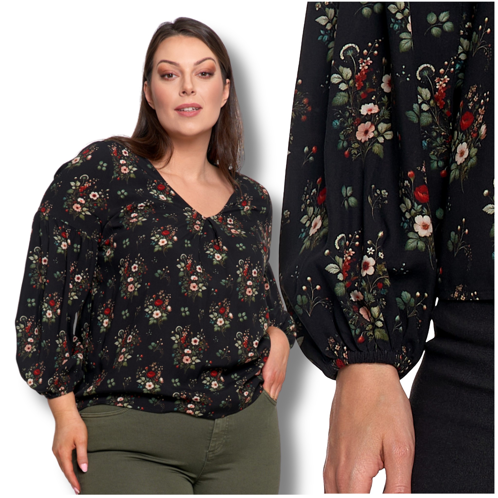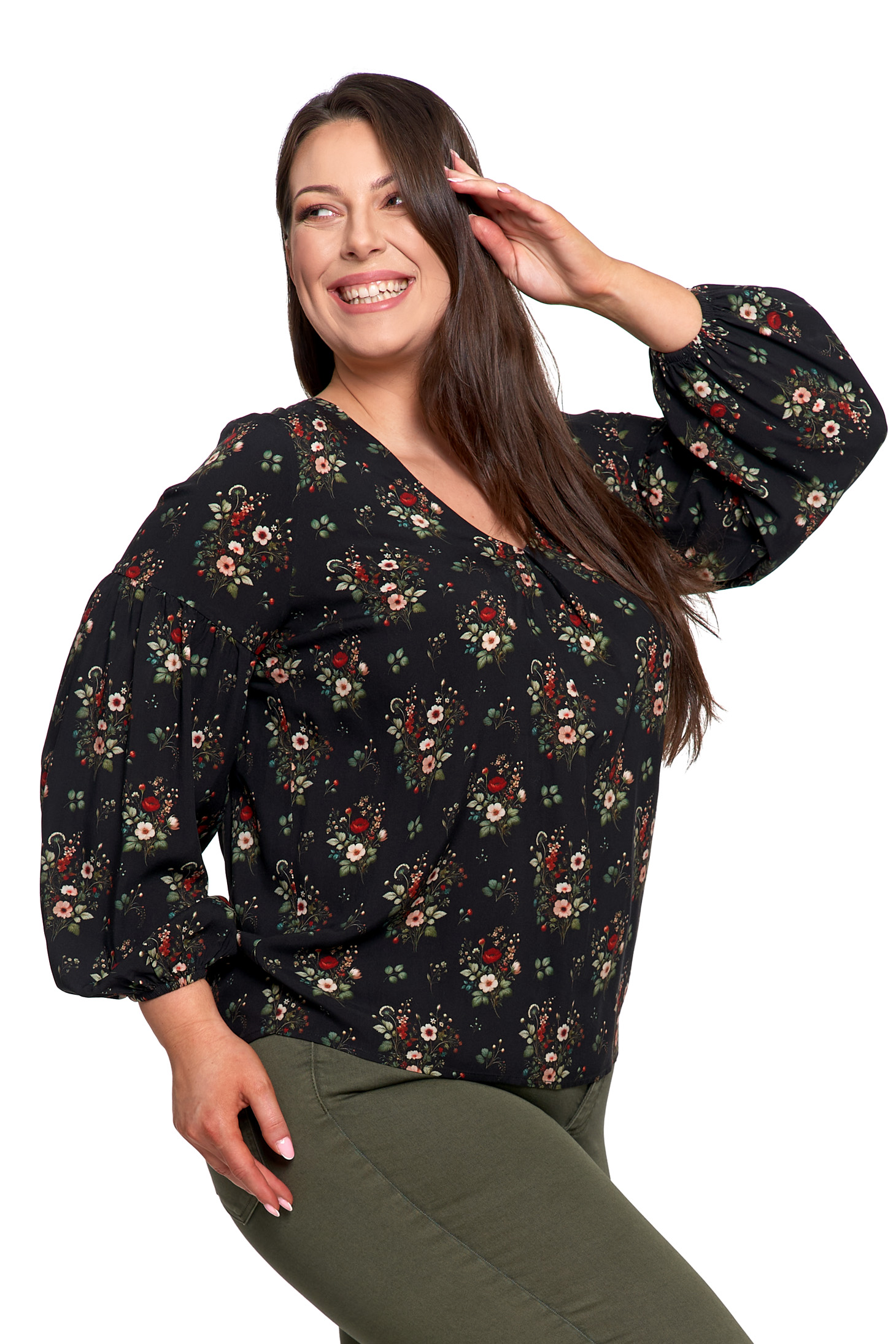 KOSZULA DAMSKA ELEGANCKA BLUZKA W KWIATY BUFIASTE RĘKAWY MODNA MORAJ