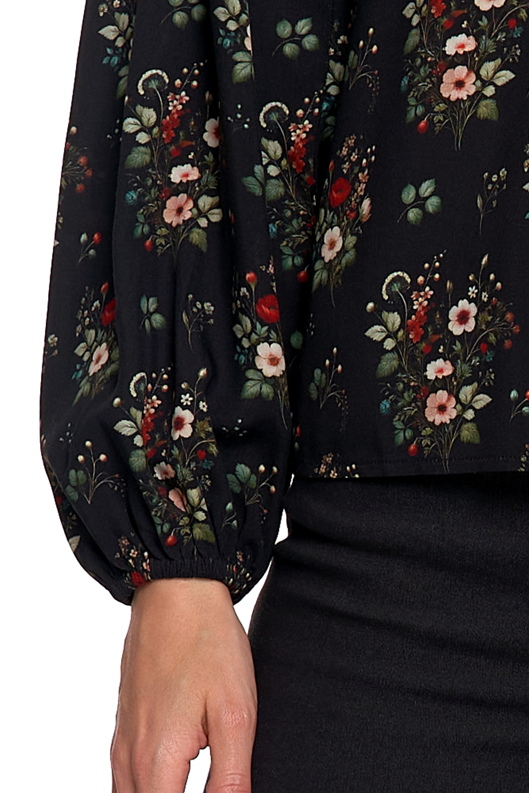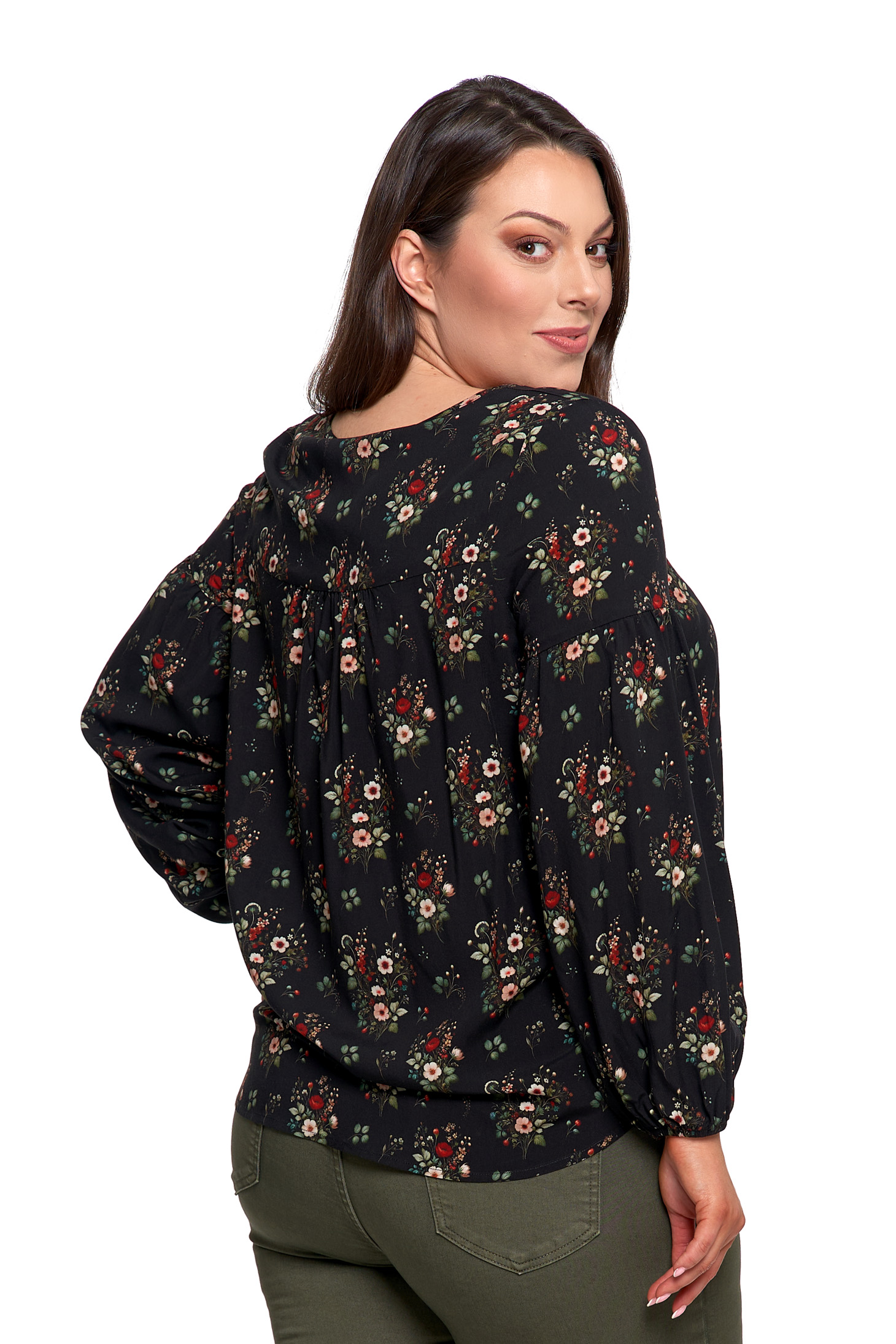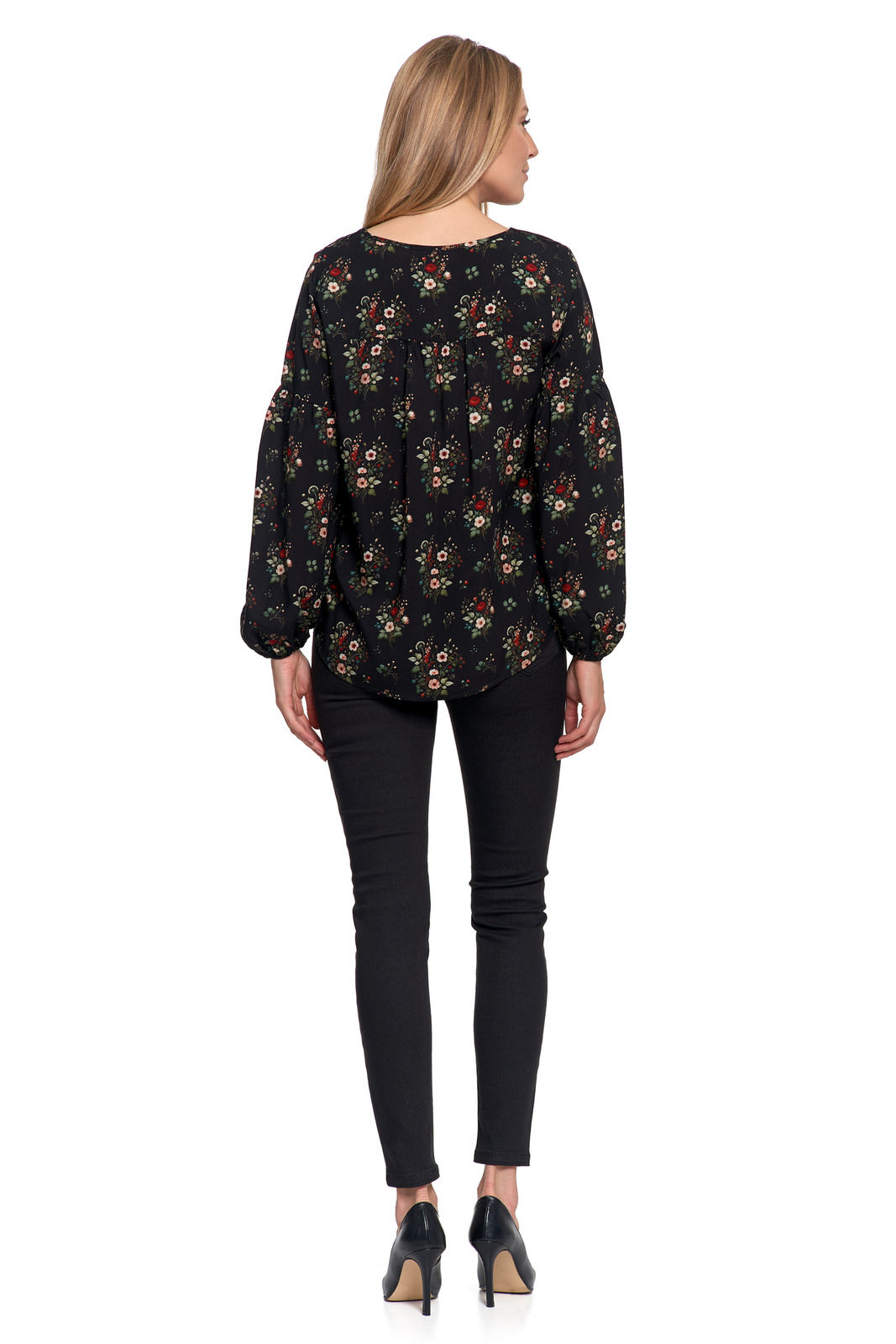 • Długie, lekko bufiaste rękawy – zakończone gumką dla kobiecego efektu.