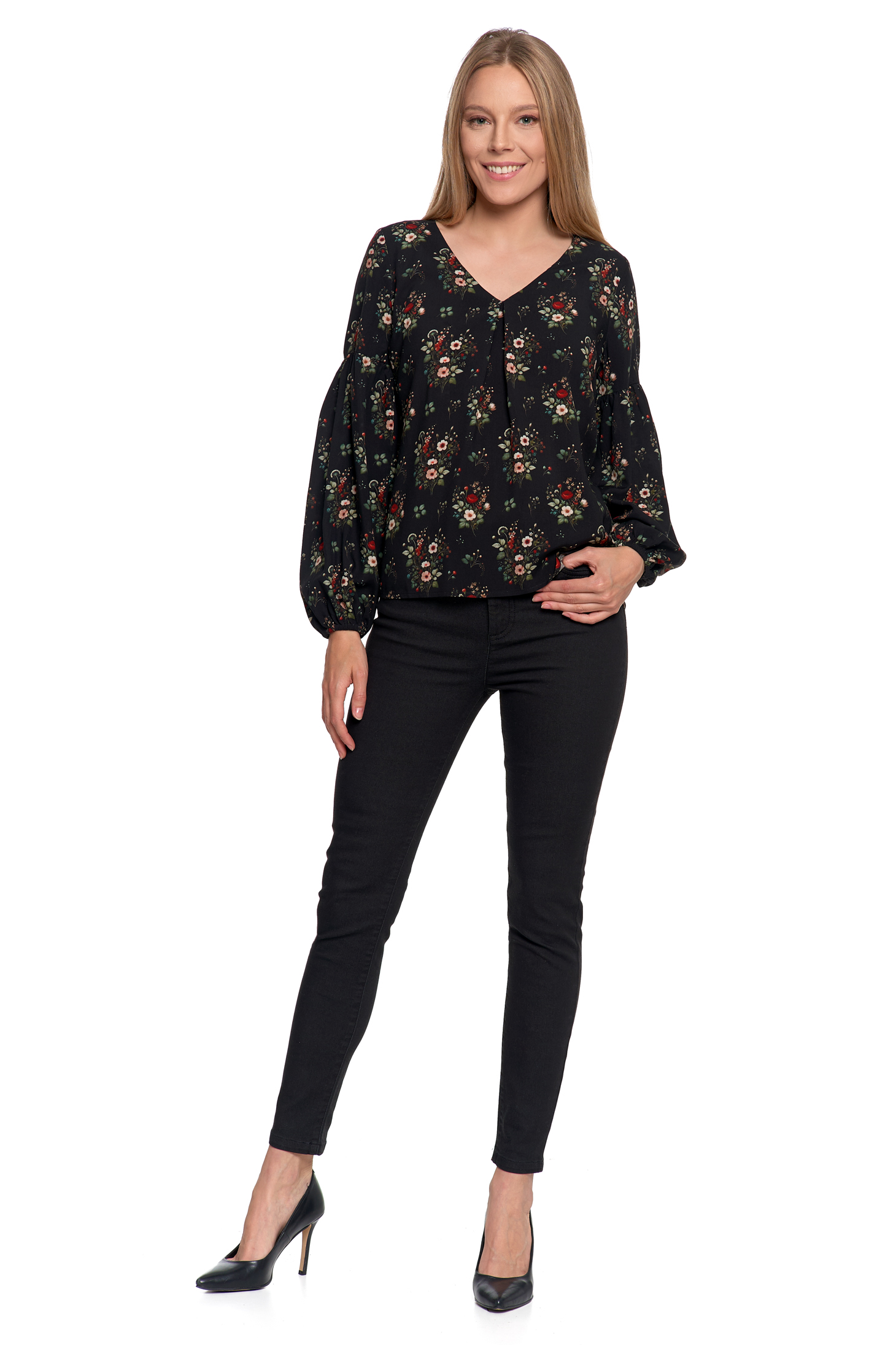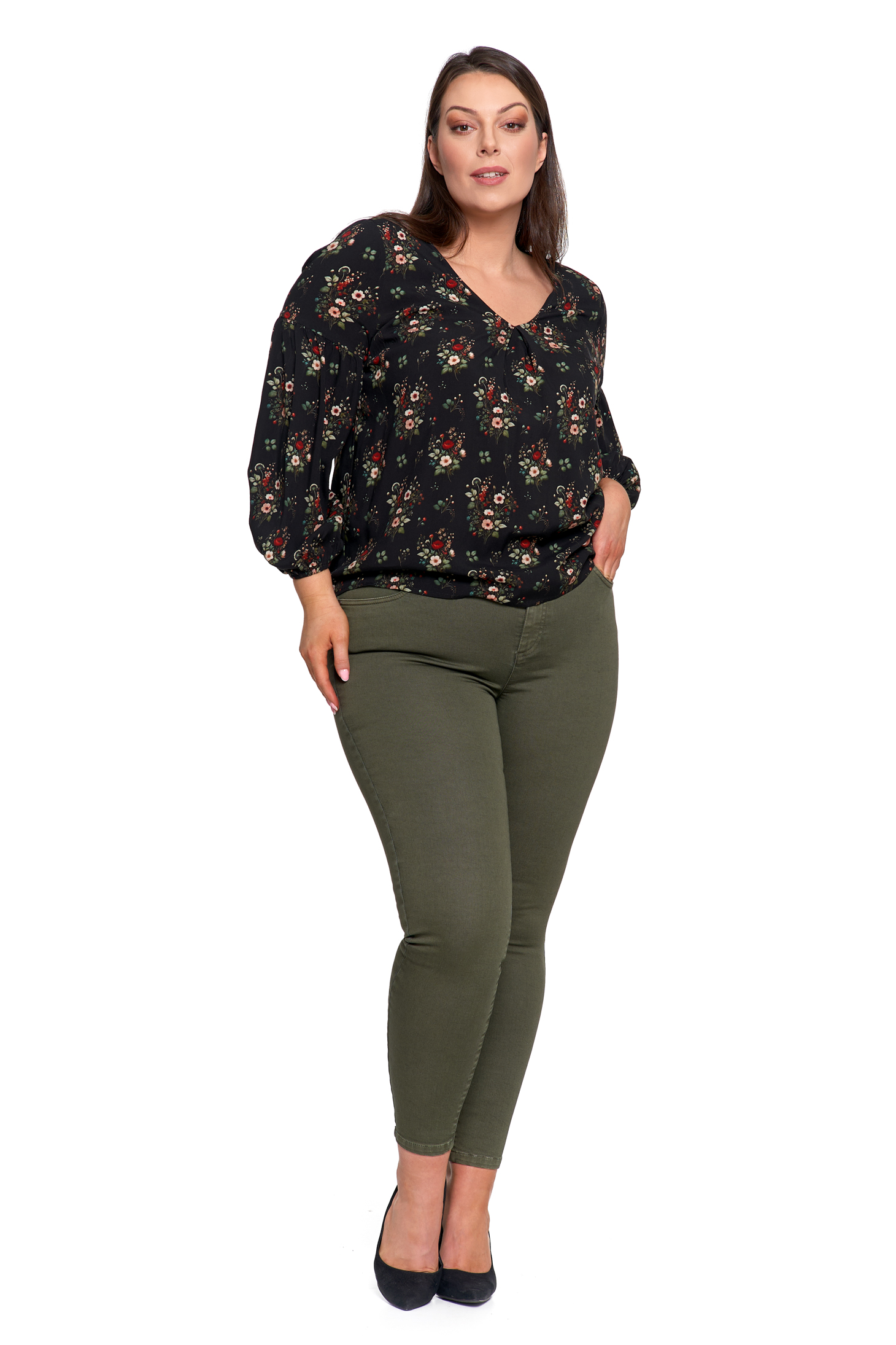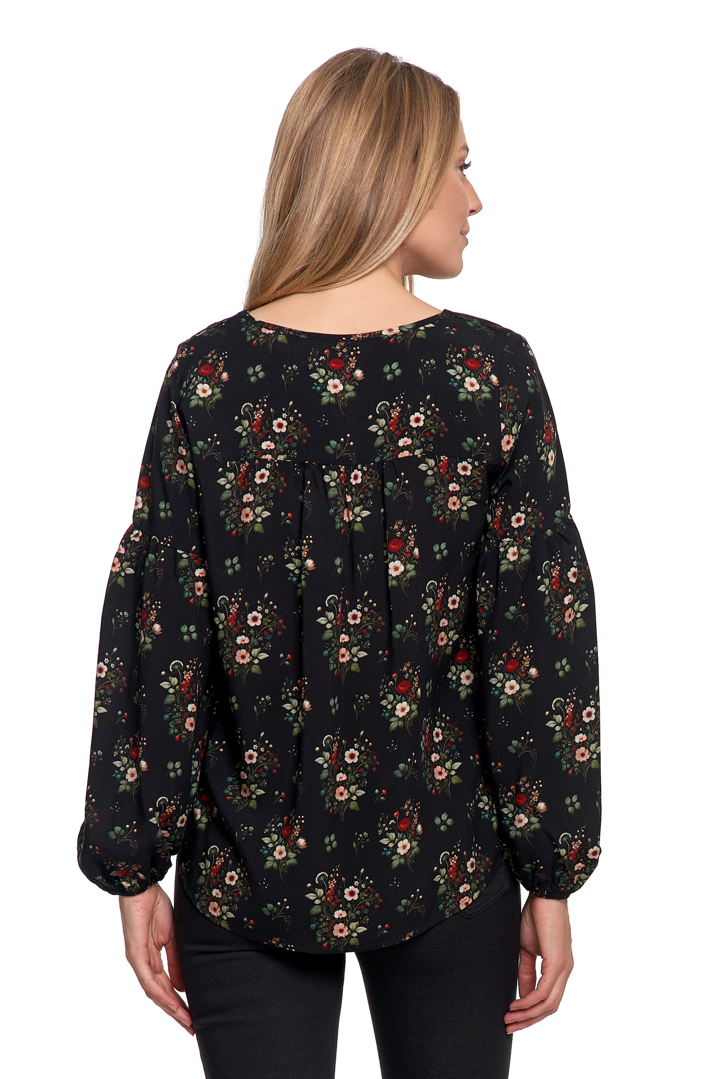 • Długie, lekko bufiaste rękawy – zakończone gumką dla kobiecego efektu.