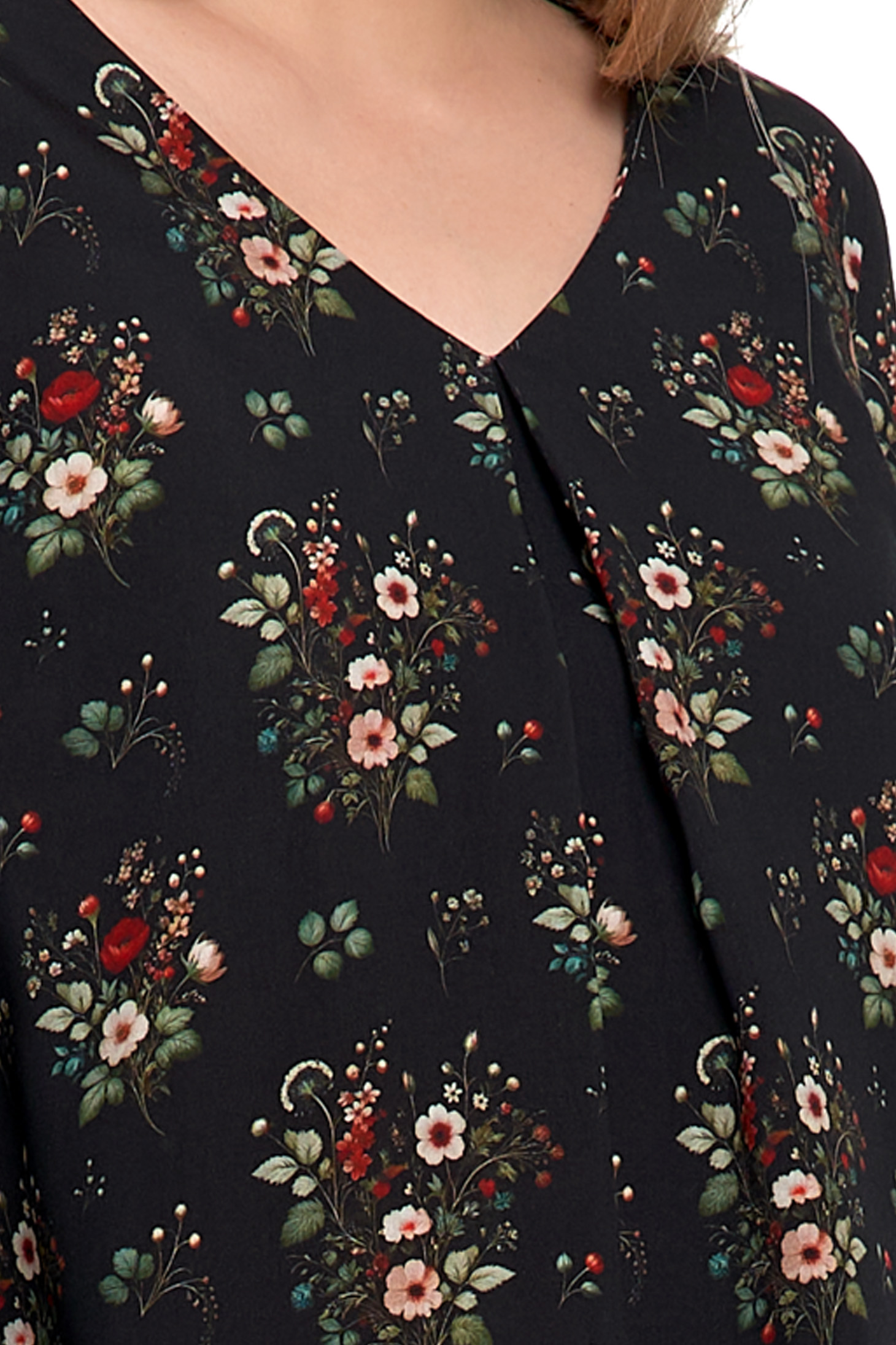 • Dekolt w kształcie litery V z subtelną zakładką – optycznie wysmukla szyję.