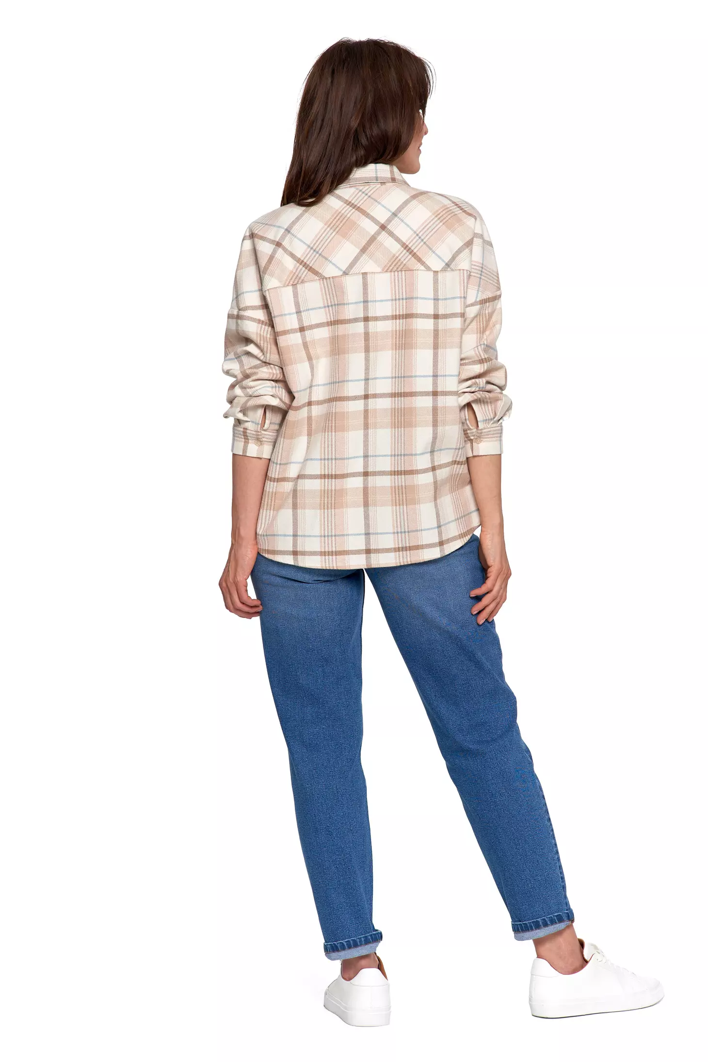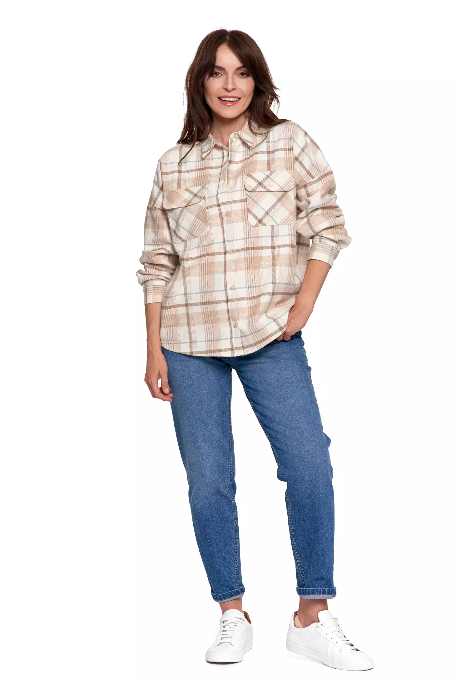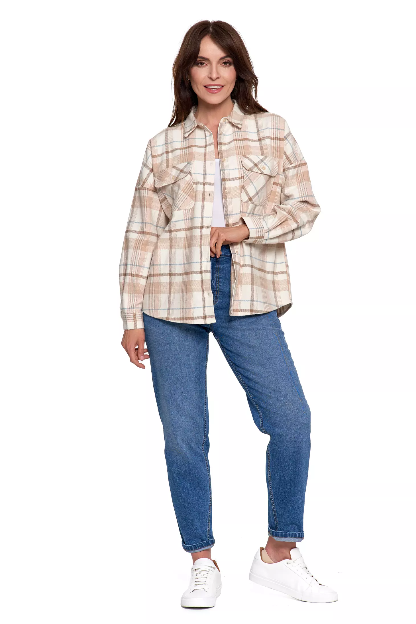 - Praktyczne detale: Zapięcie na guziki, klasyczny kołnierzyk i dwie kieszenie na piersiach podkreślają jej casualowy charakter.